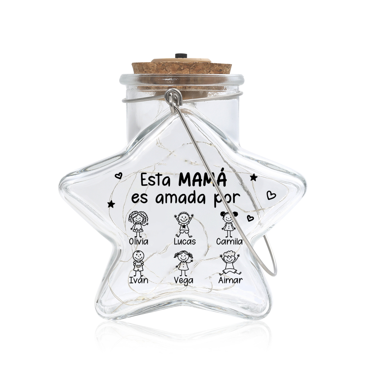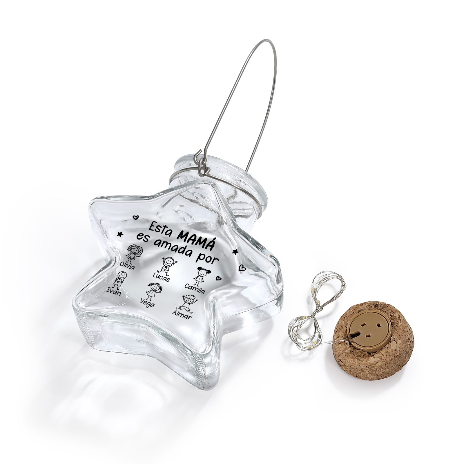 Palabras clave: luz de estrella personalizada, tarro de luces de hada con nombre, regalo para mamá, recuerdo sentimental de cristal, luz de noche blanca cálida, decoración con nombres de familia, idea de regalo para el Día de la Madre, decoración del hogar personalizada