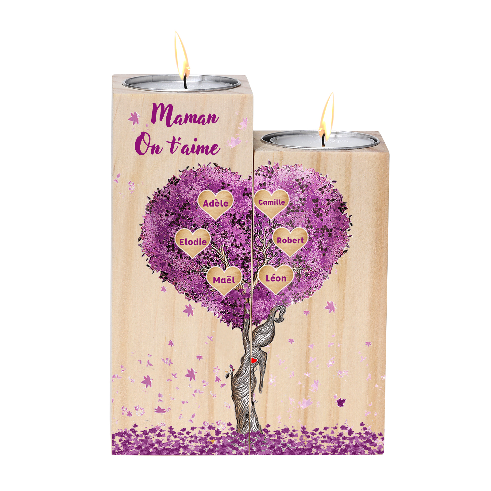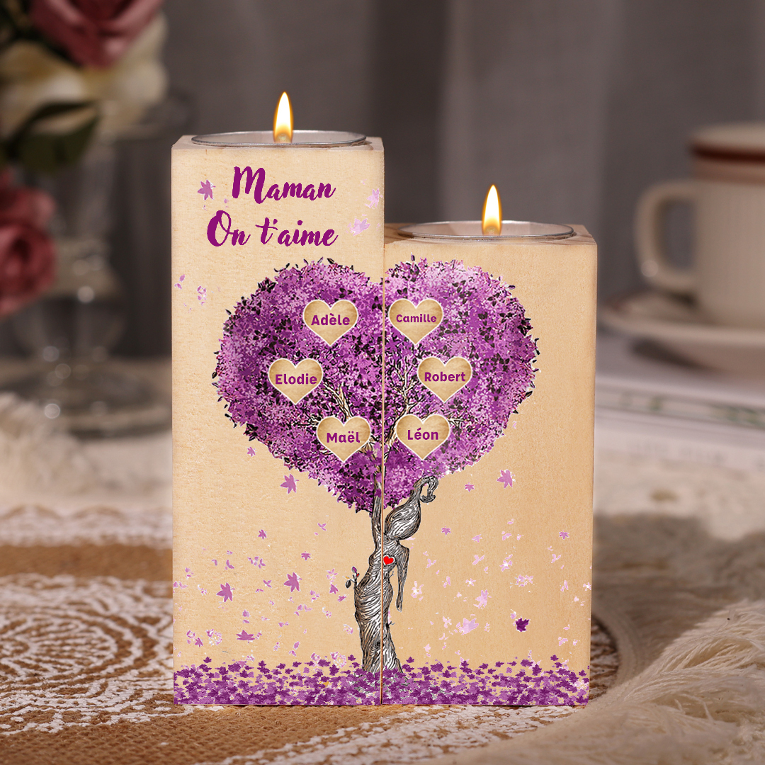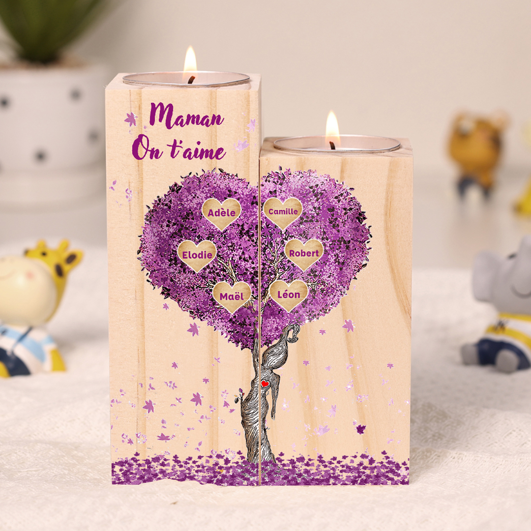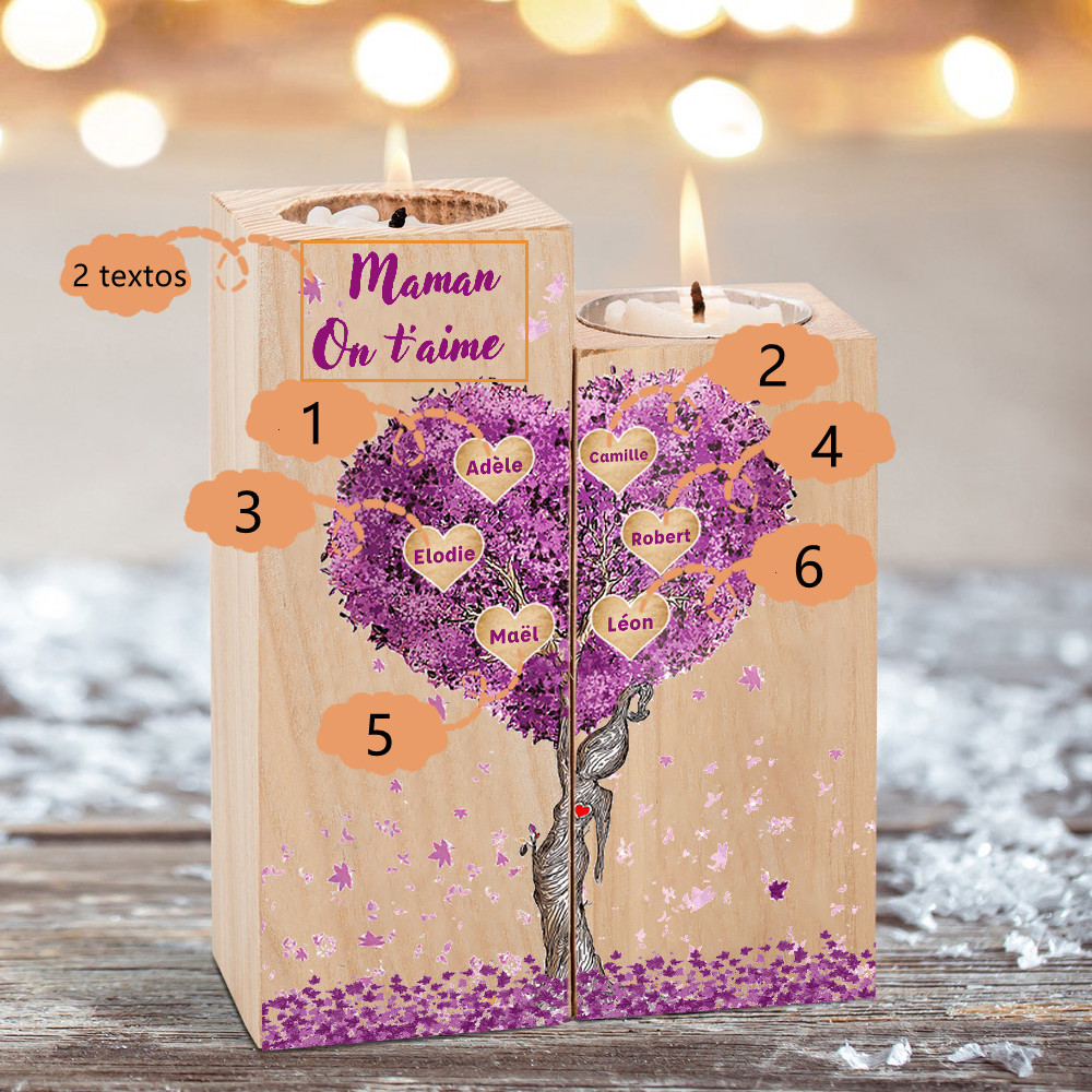 A familia-Candelero de madera sin vela Árbol de la Vida Árbol Genealógico 6 nombres y 2 textos personalizados