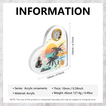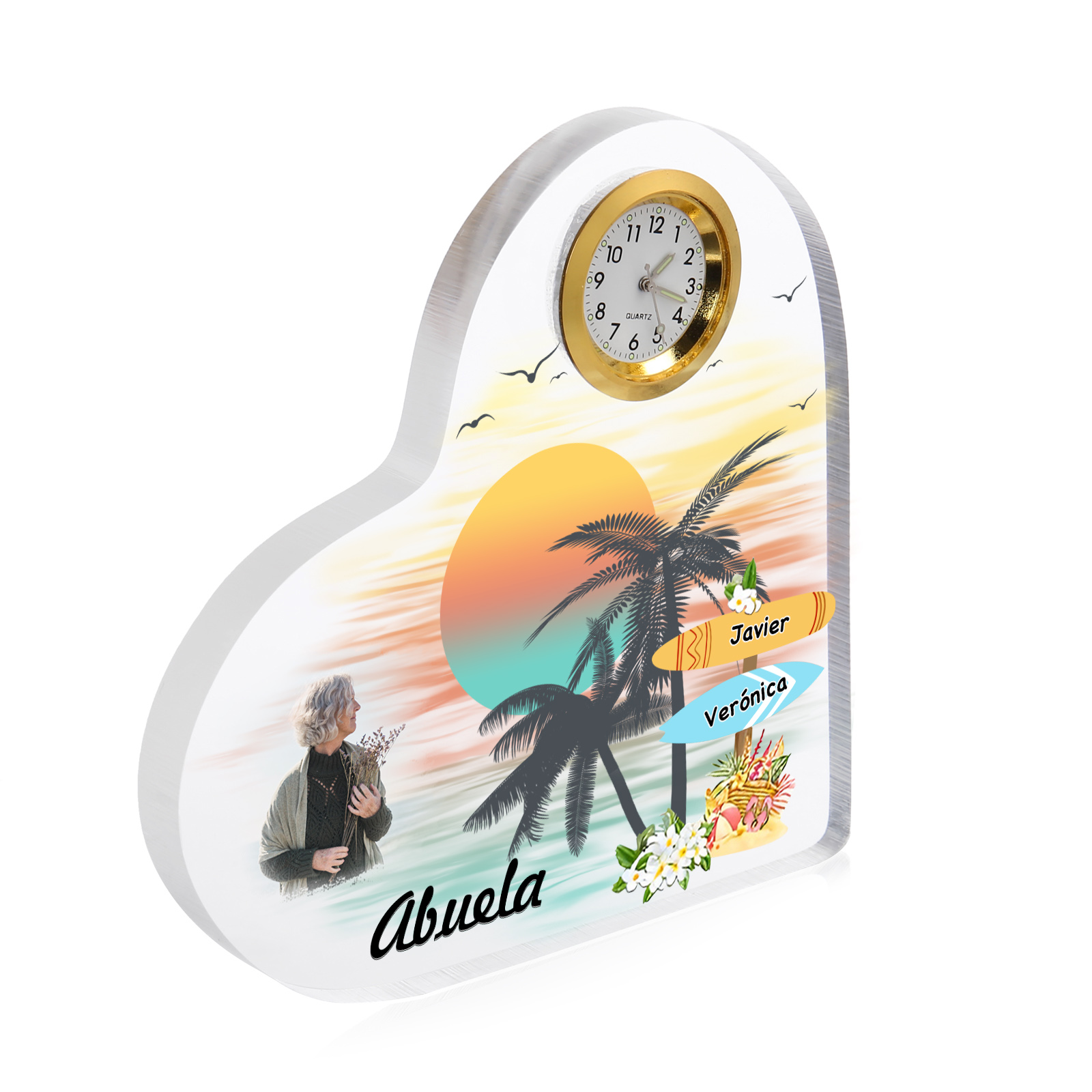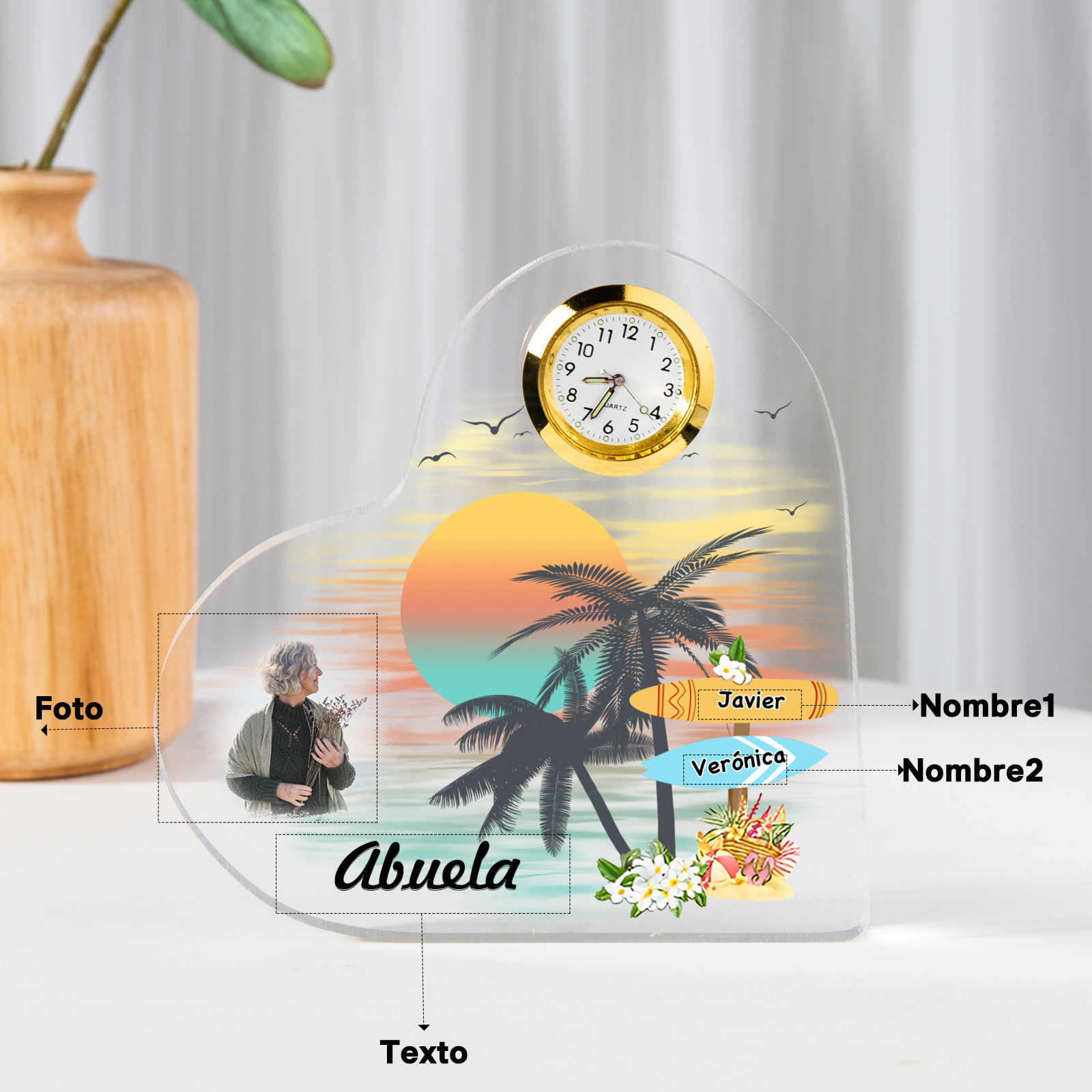 A la familia-Placa acrílica de playa en forma de corazón con un reloj 1 texto, 1 foto y 2 nombres personalizados