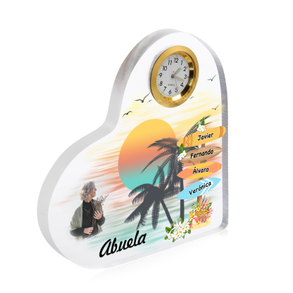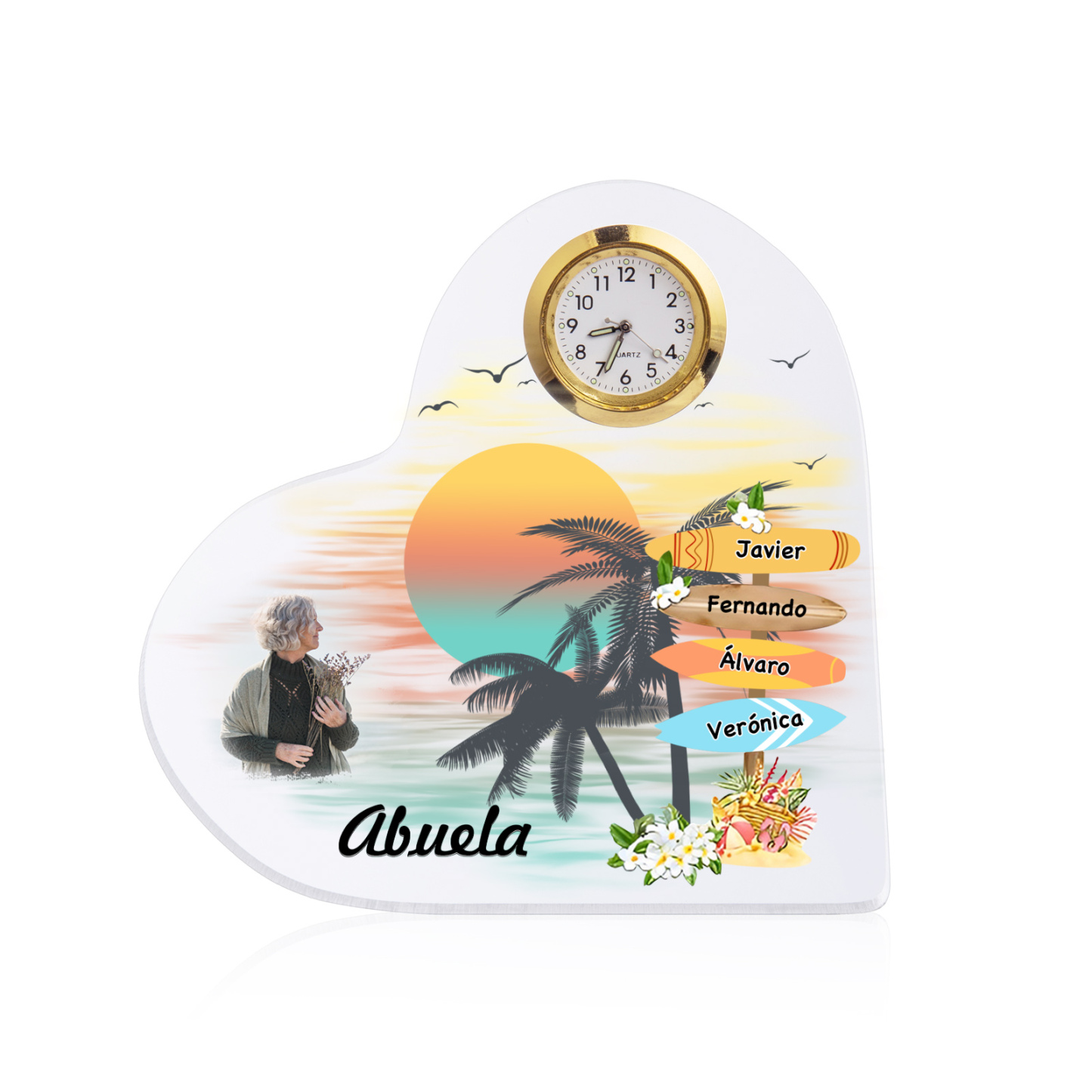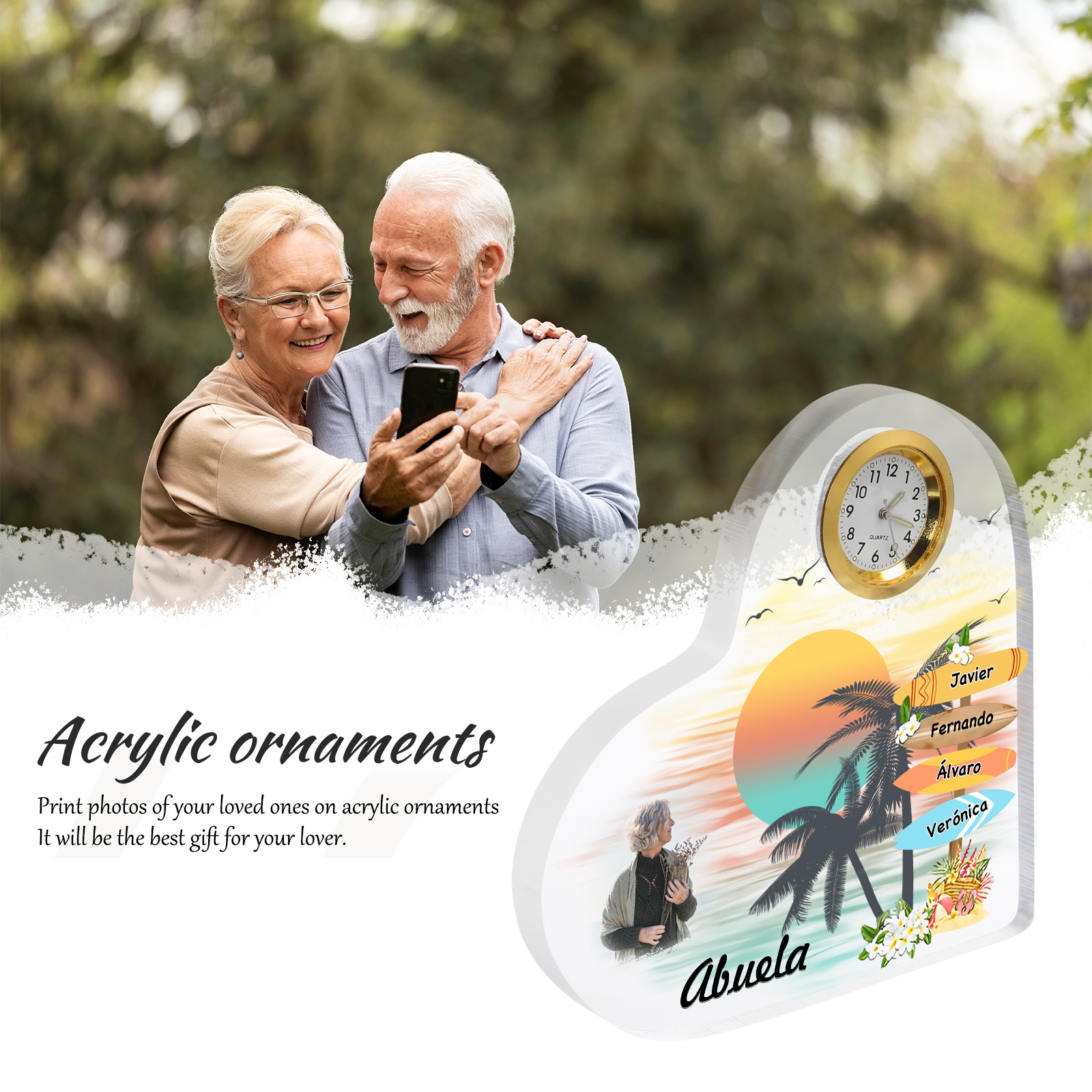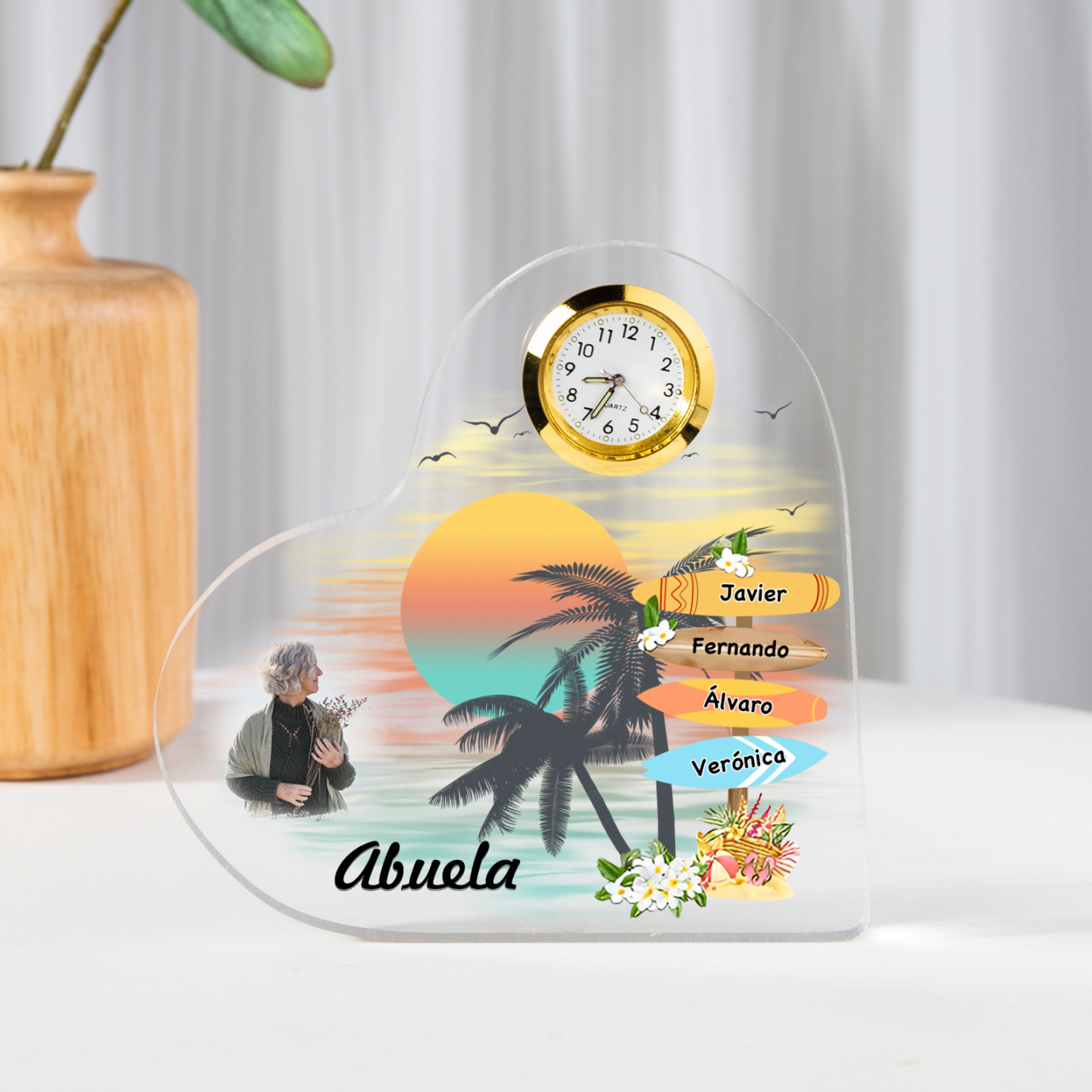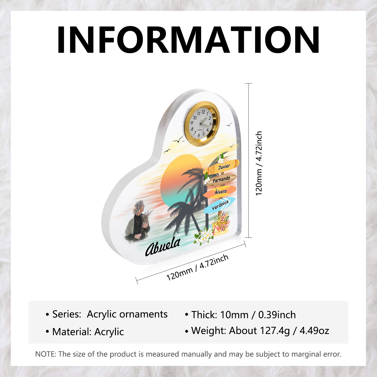 A la familia-Placa acrílica de playa en forma de corazón con un reloj 1 texto, 1 foto y 4 nombres personalizados