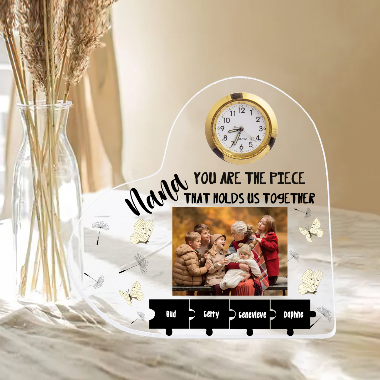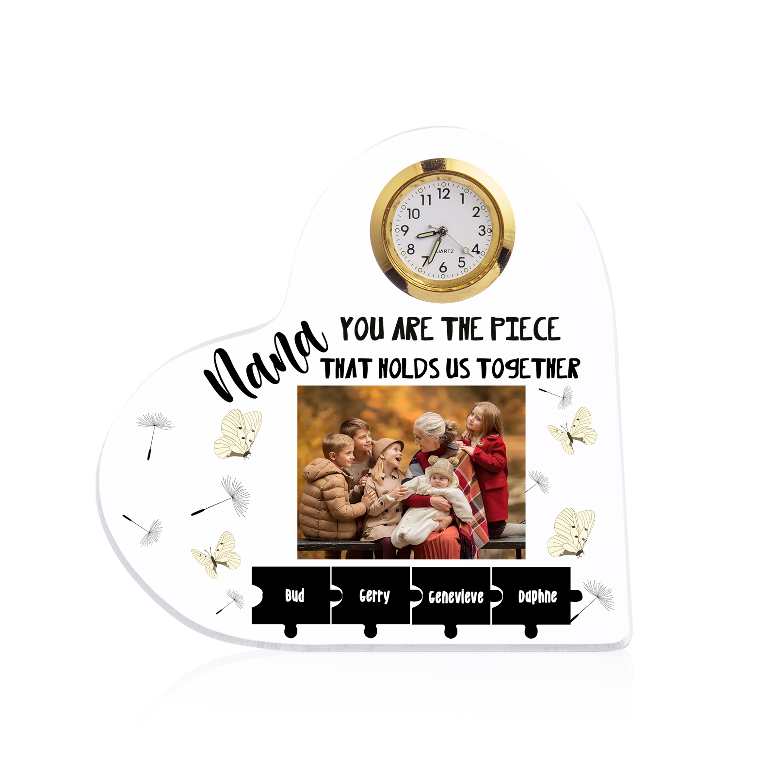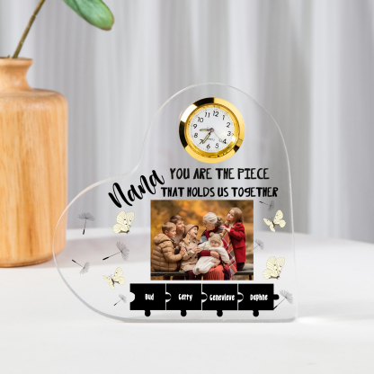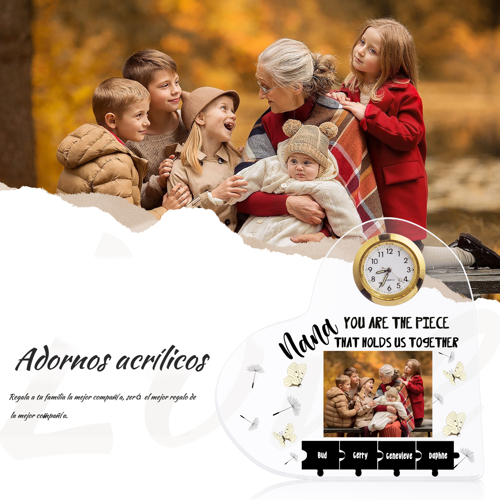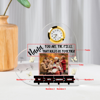 A la familia-Placa acrílica en forma de corazón con un reloj 1 texto, 1 foto y 4 nombres personalizados
