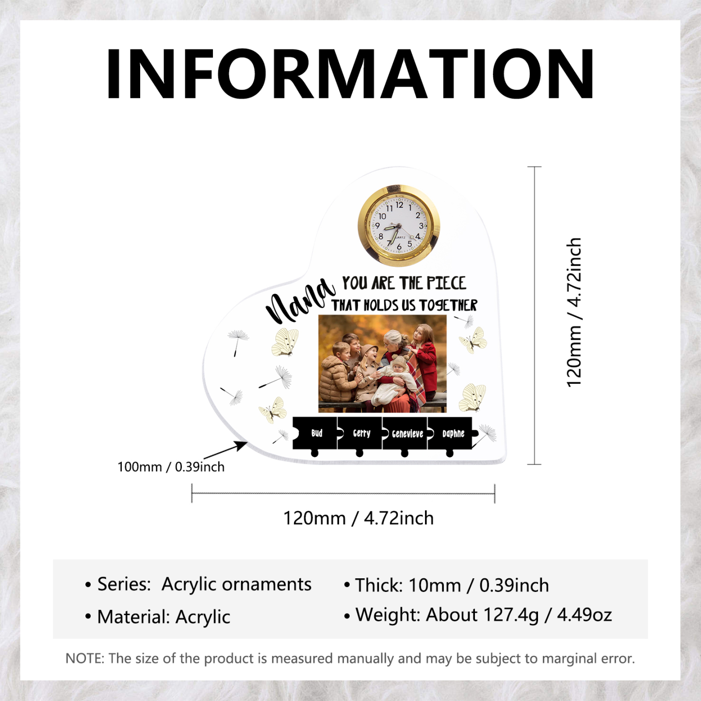 Es un regalo perfecto para tus seres queridos, simple pero significativo, como un testimonio de la conexión increíble entre tú y las personas especiales. Hecho de acrílico, es duradero y fácil de mantener limpio. La impresión es clara y no se desvanece fácilmente.