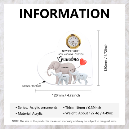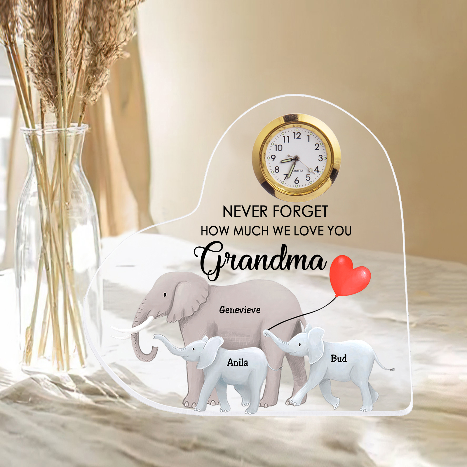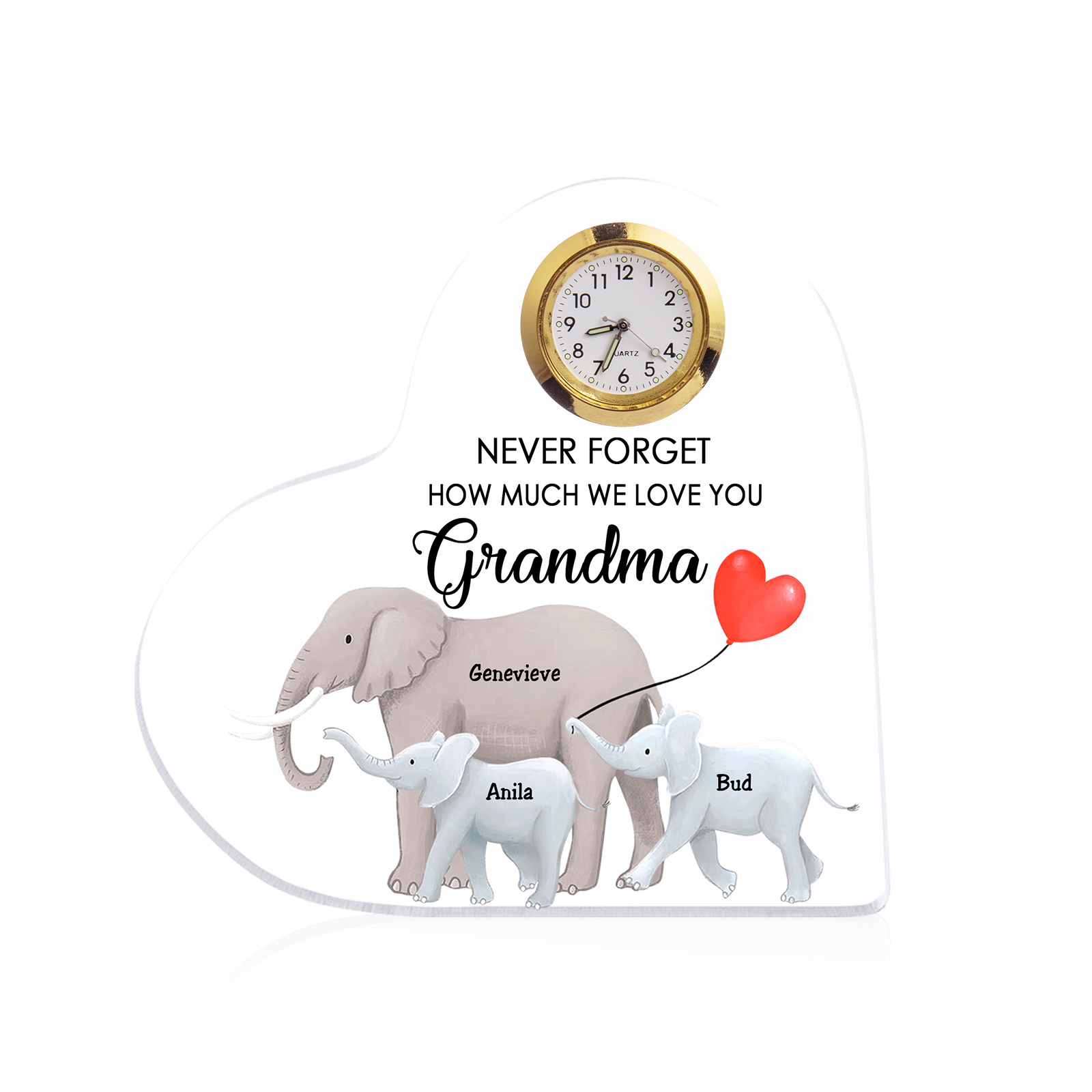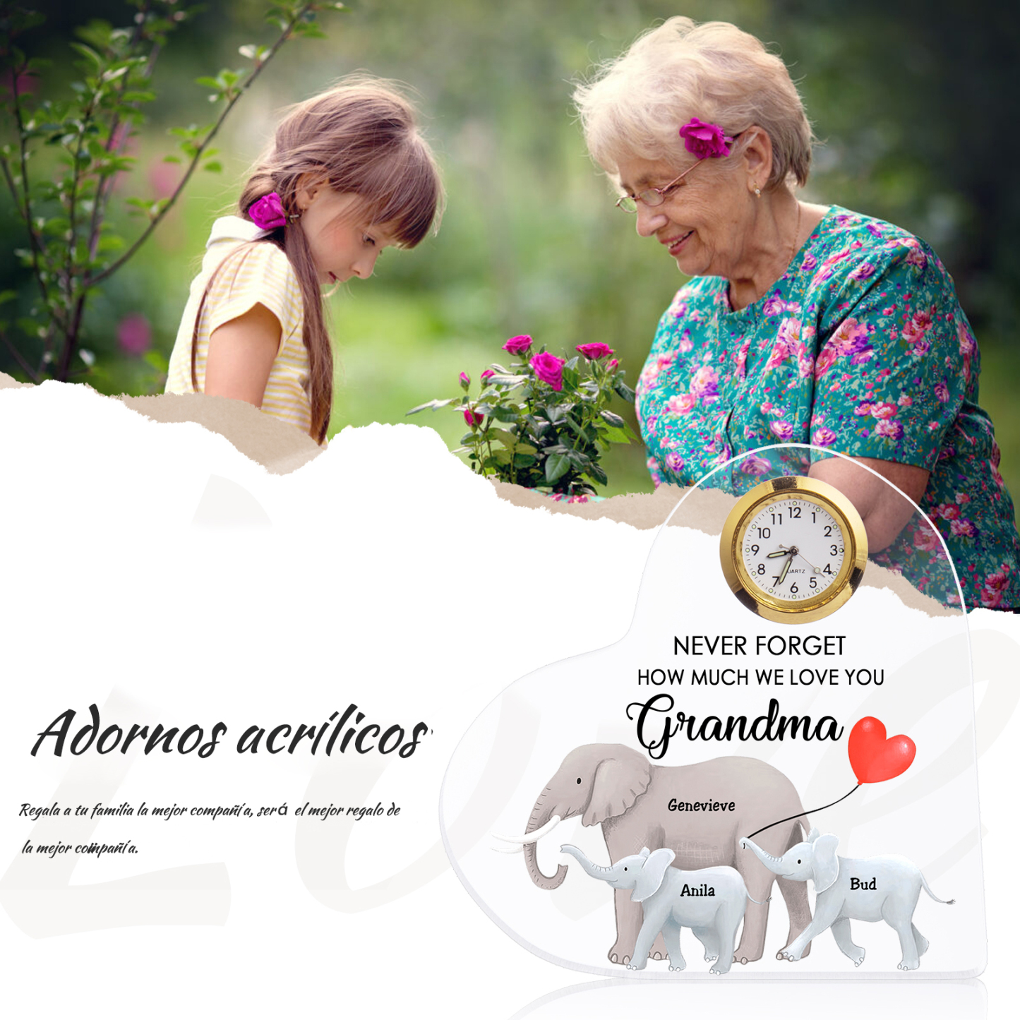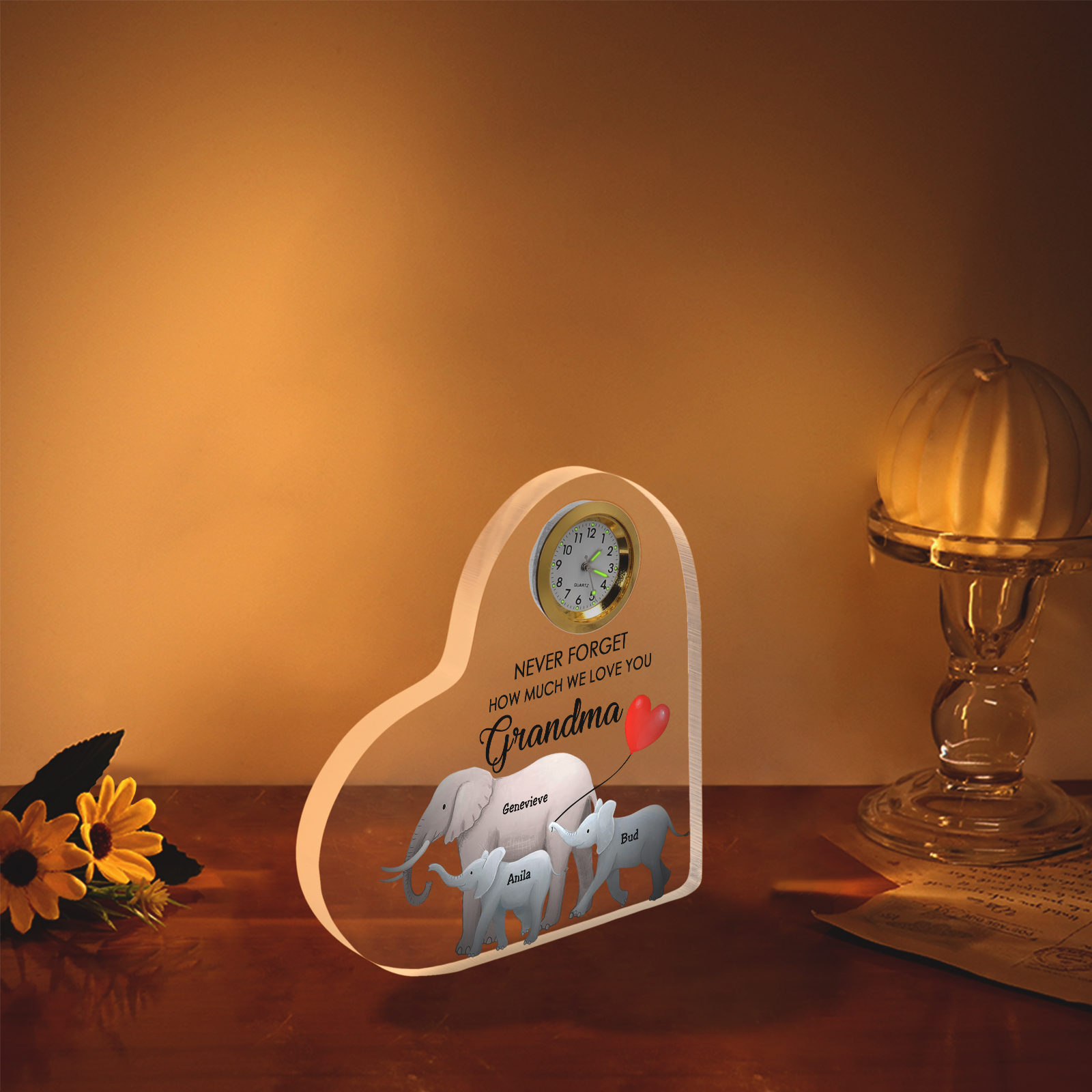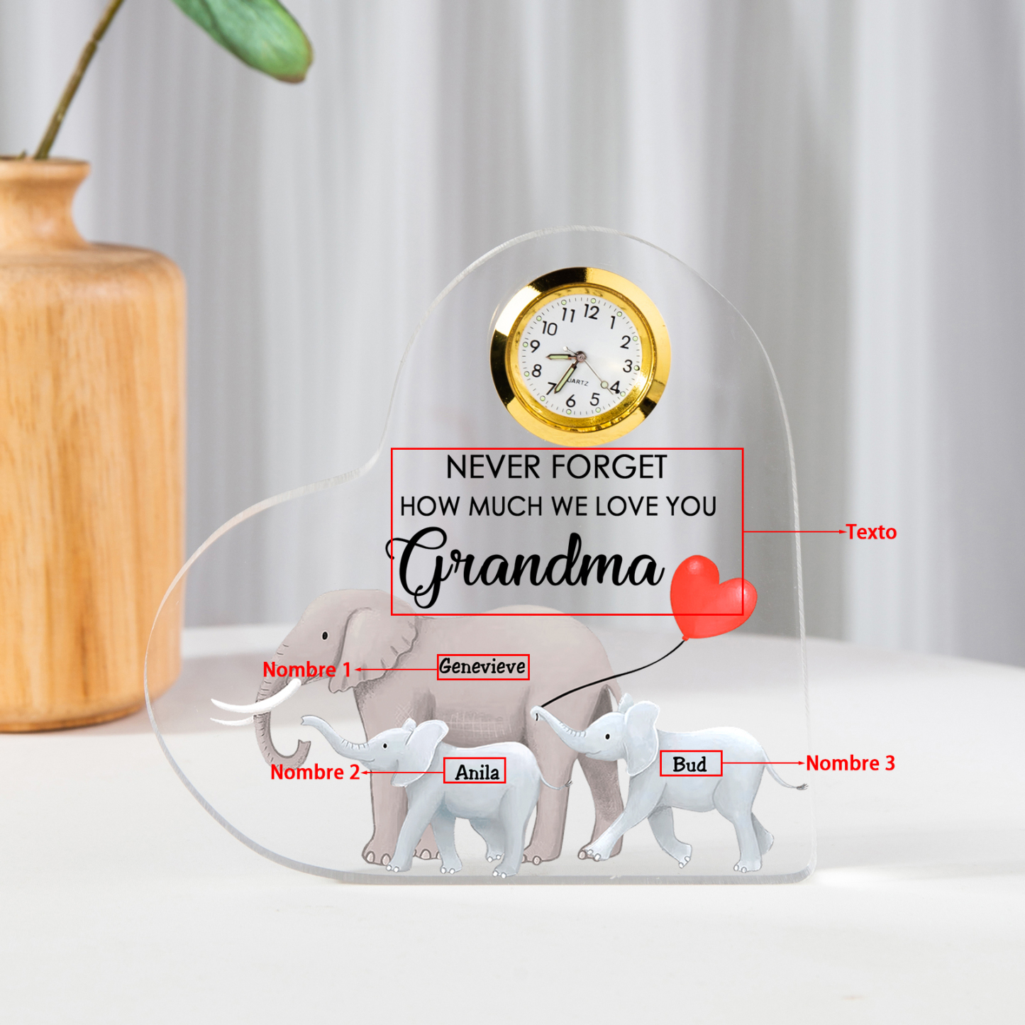A la familia-Placa acrílica en forma de corazón elefantes con un reloj 1 texto 3 nombres personalizados