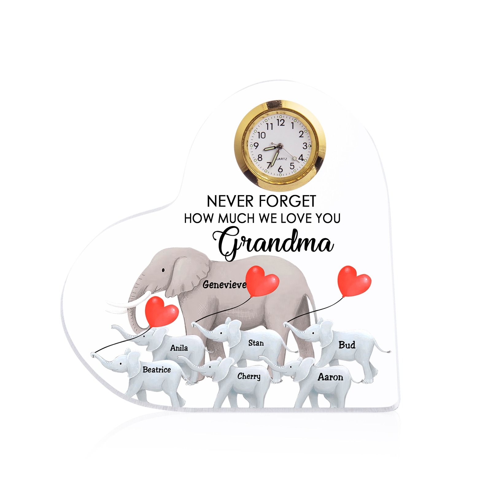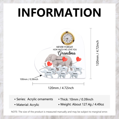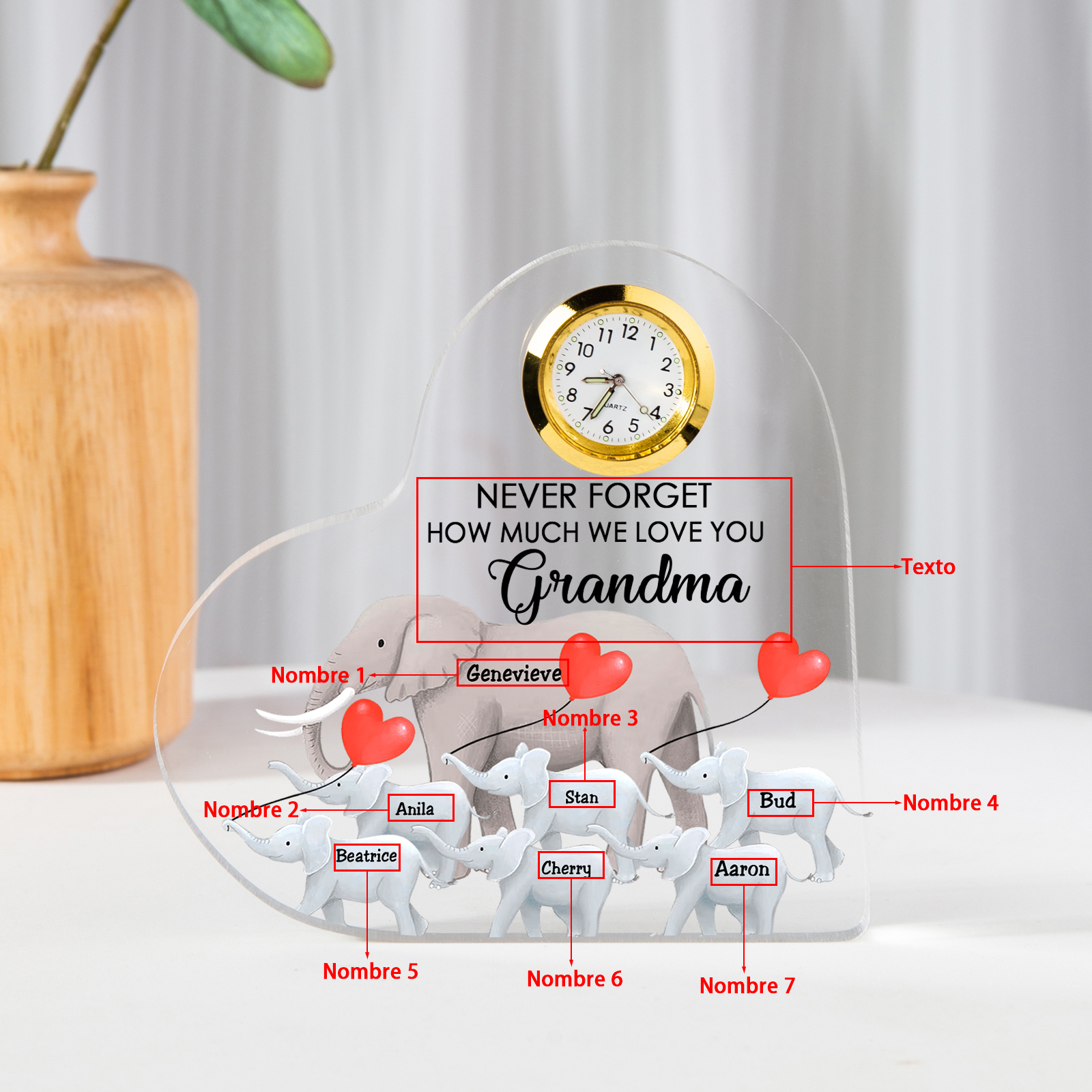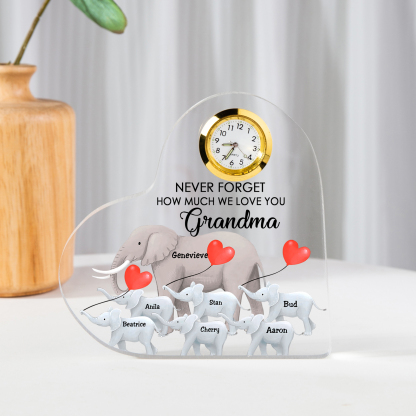 A la familia-Placa acrílica en forma de corazón elefantes con un reloj 1 texto 7 nombres personalizados