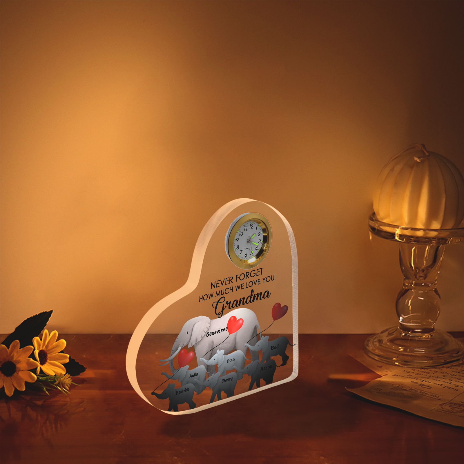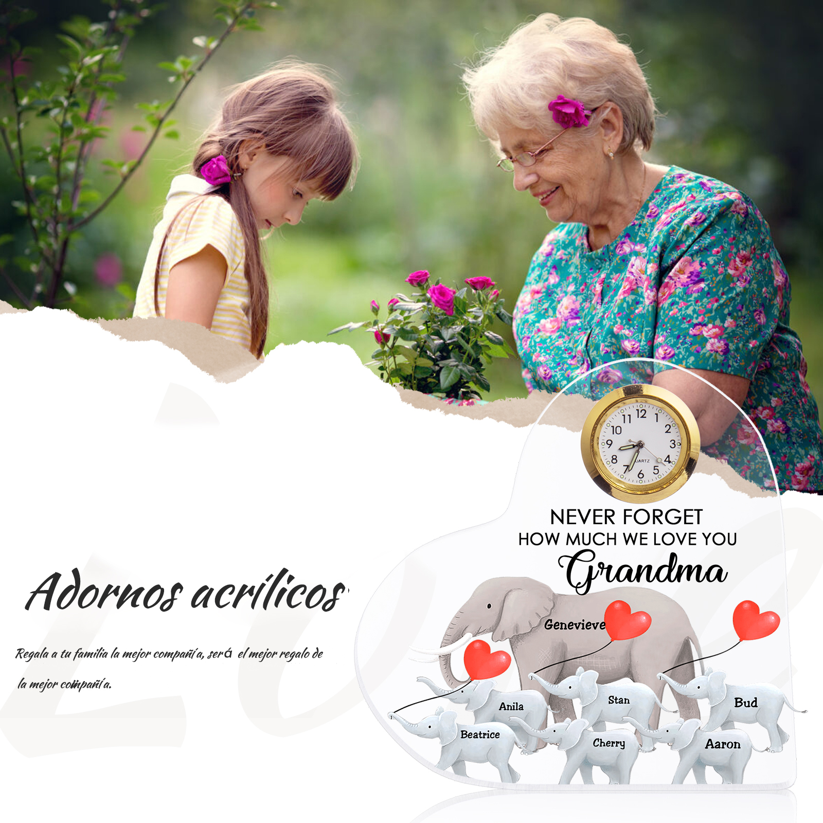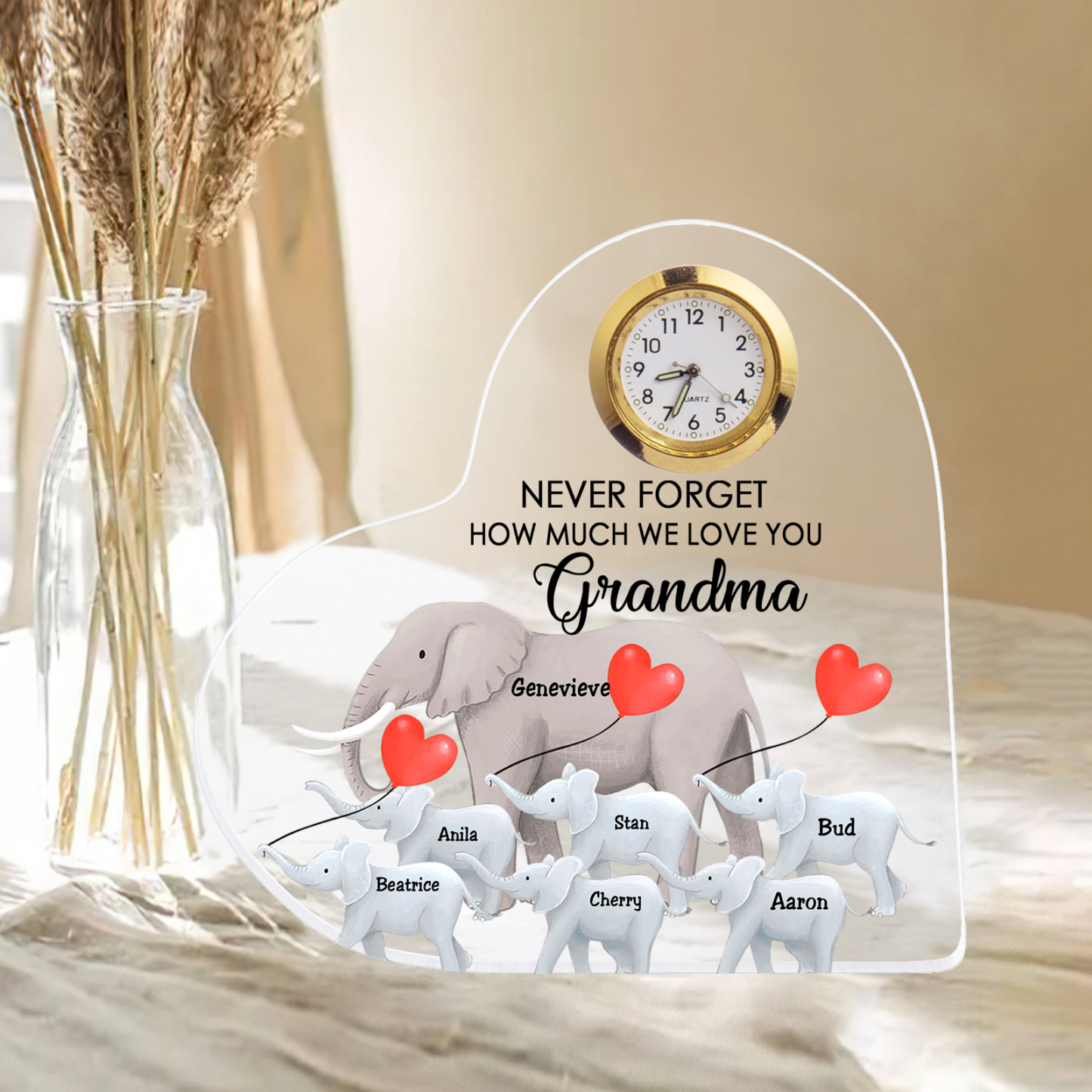A la familia-Placa acrílica en forma de corazón elefantes con un reloj 1 texto 7 nombres personalizados