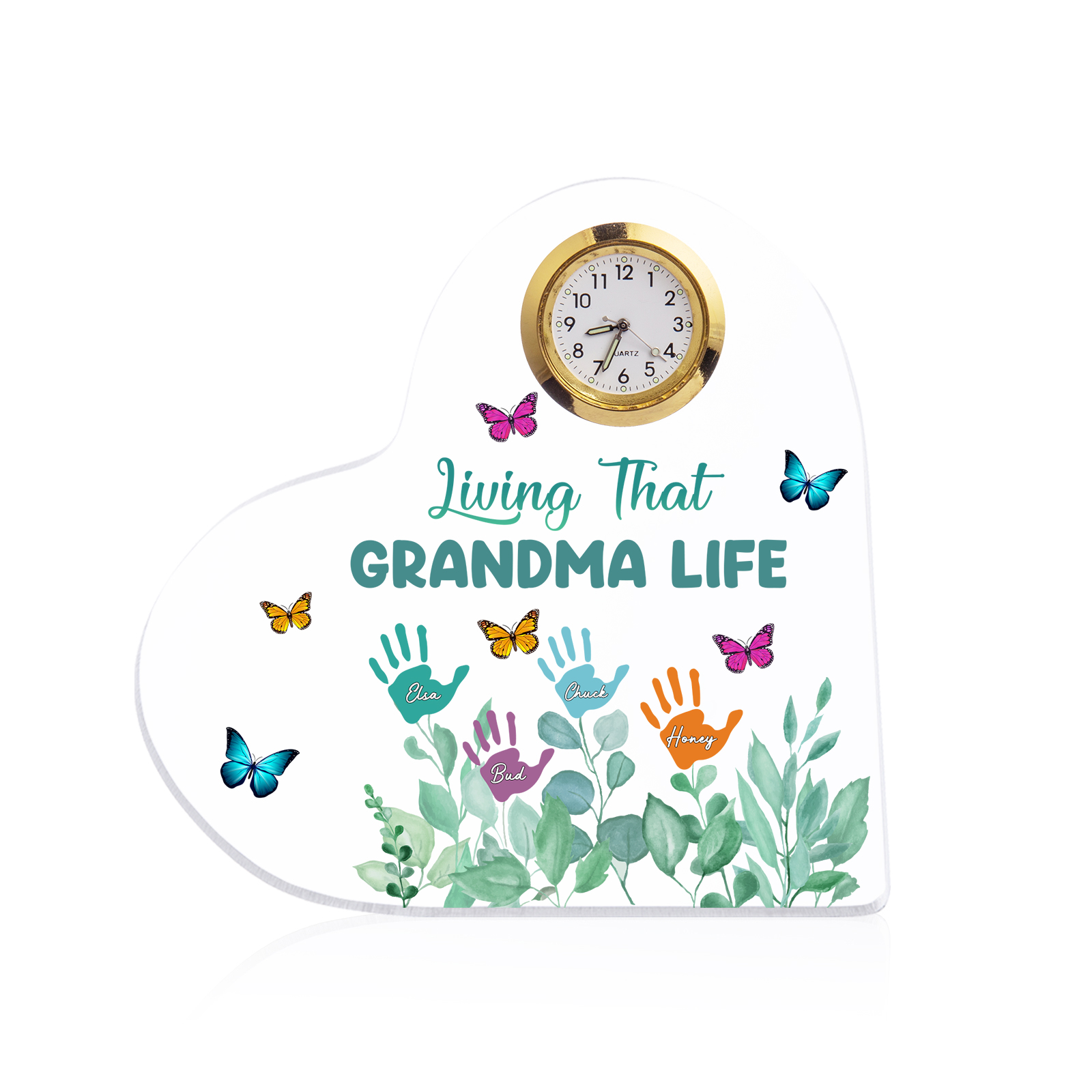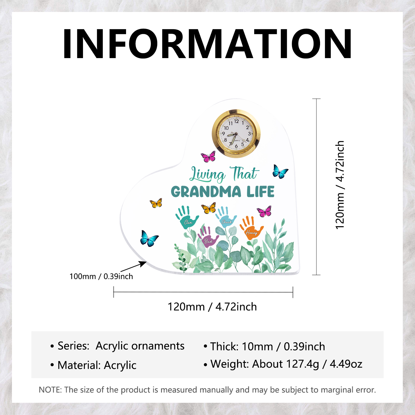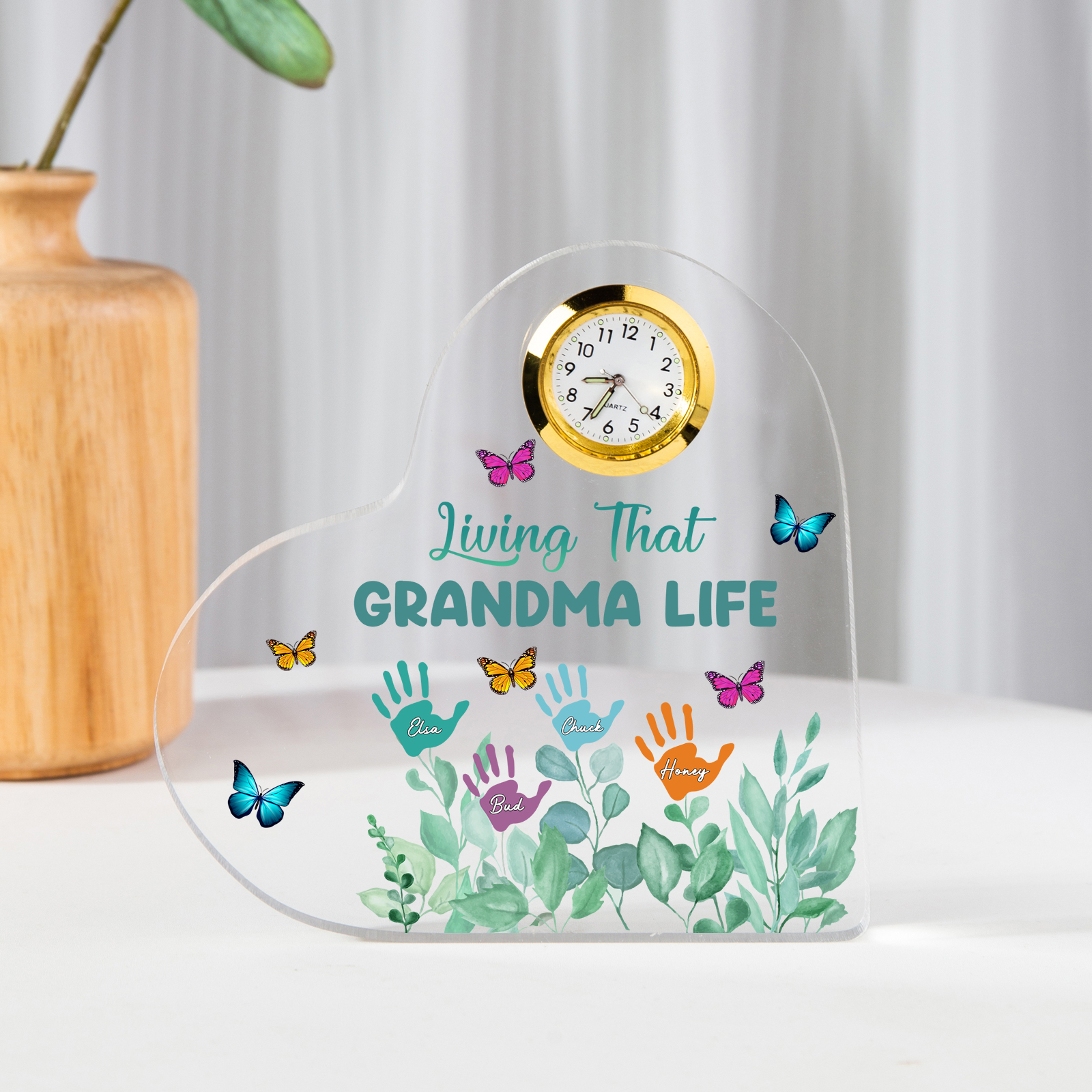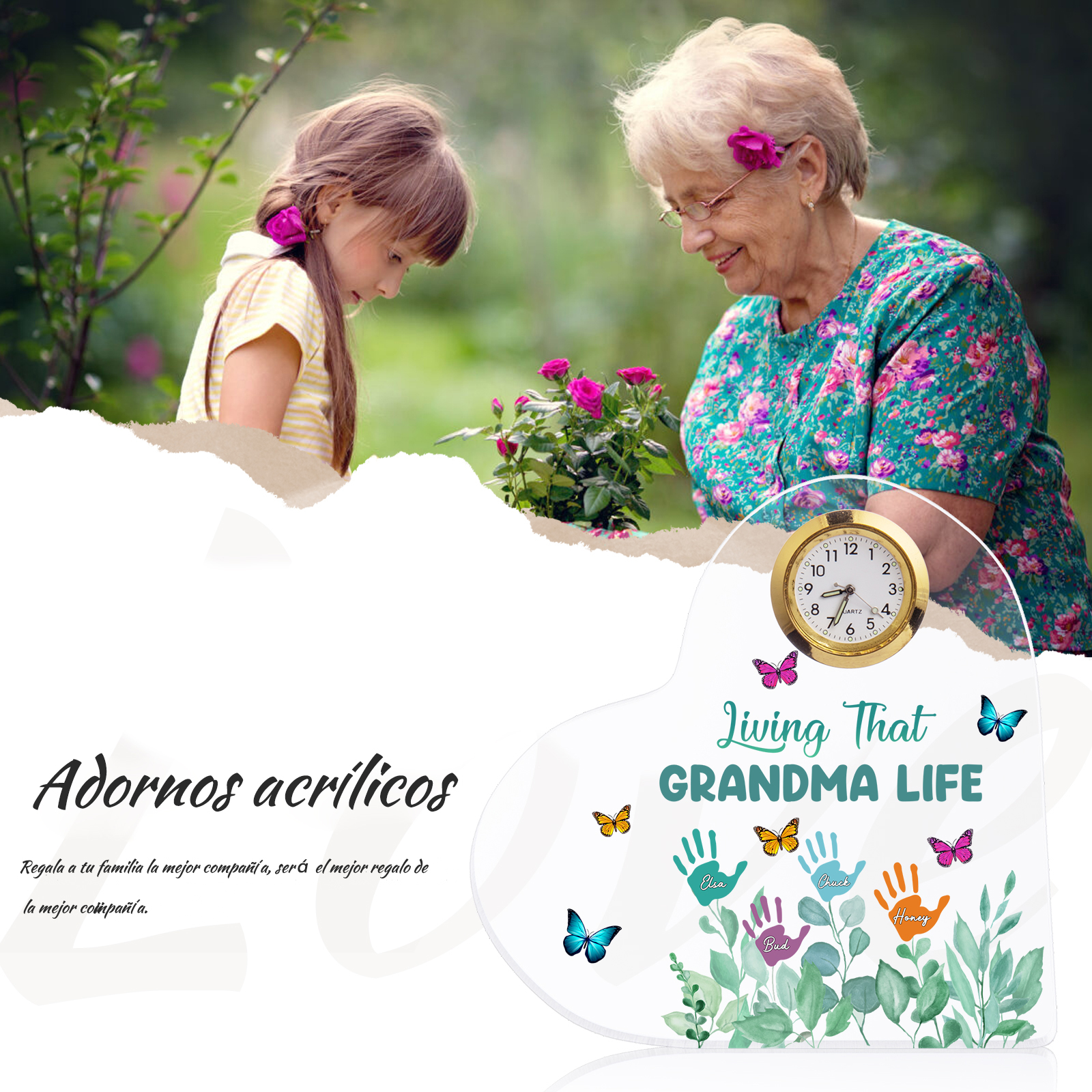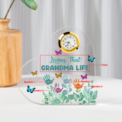 A la familia-Placa acrílica en forma de corazón manos con un reloj 1 texto 4 nombres personalizados