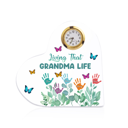A la familia-Placa acrílica en forma de corazón manos con un reloj 1 texto 5 nombres personalizados