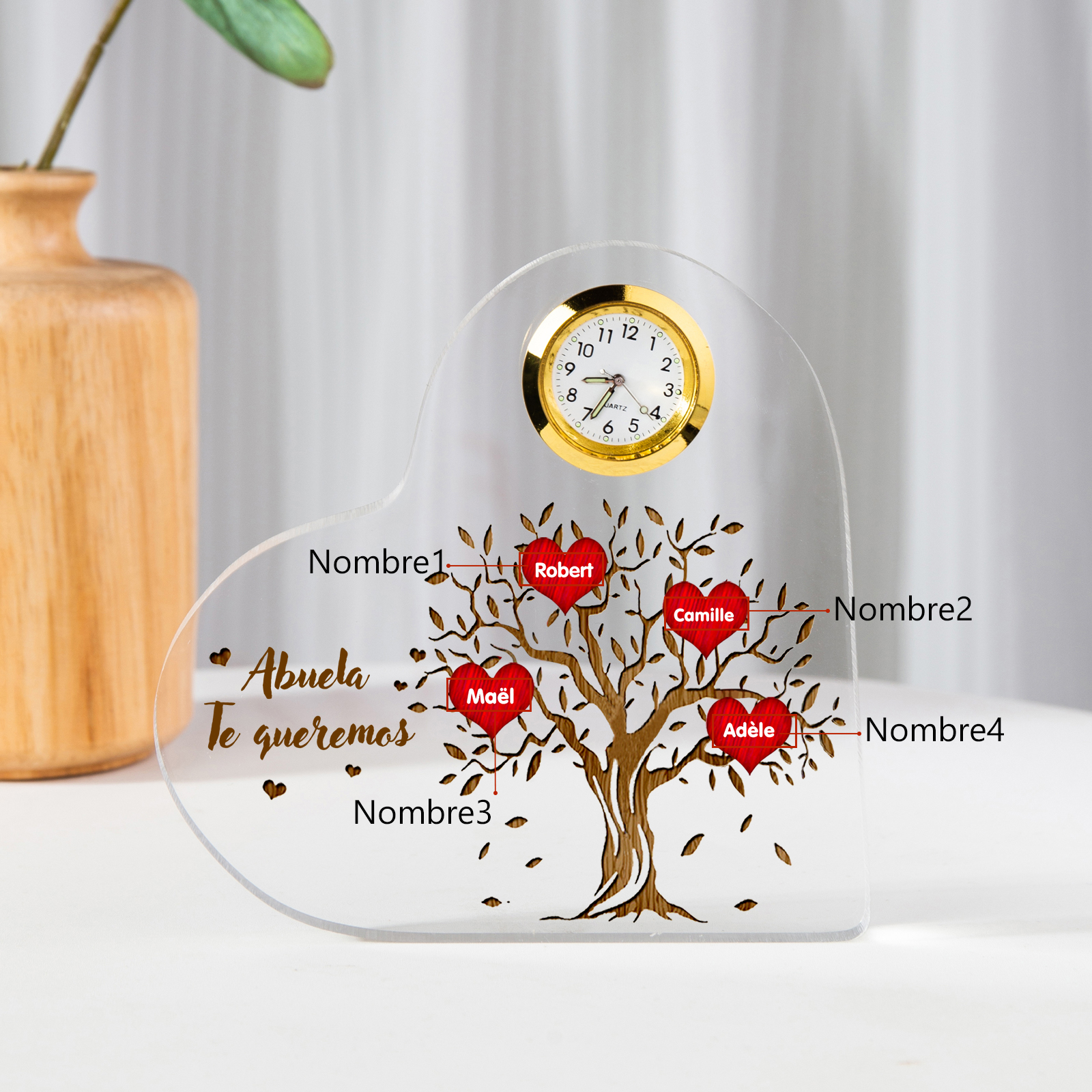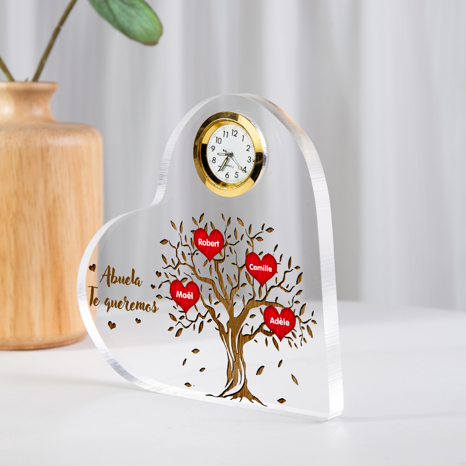 A mi abuela-Placa acrílica en forma acorazonada con un reloj 4 nombres personalizados