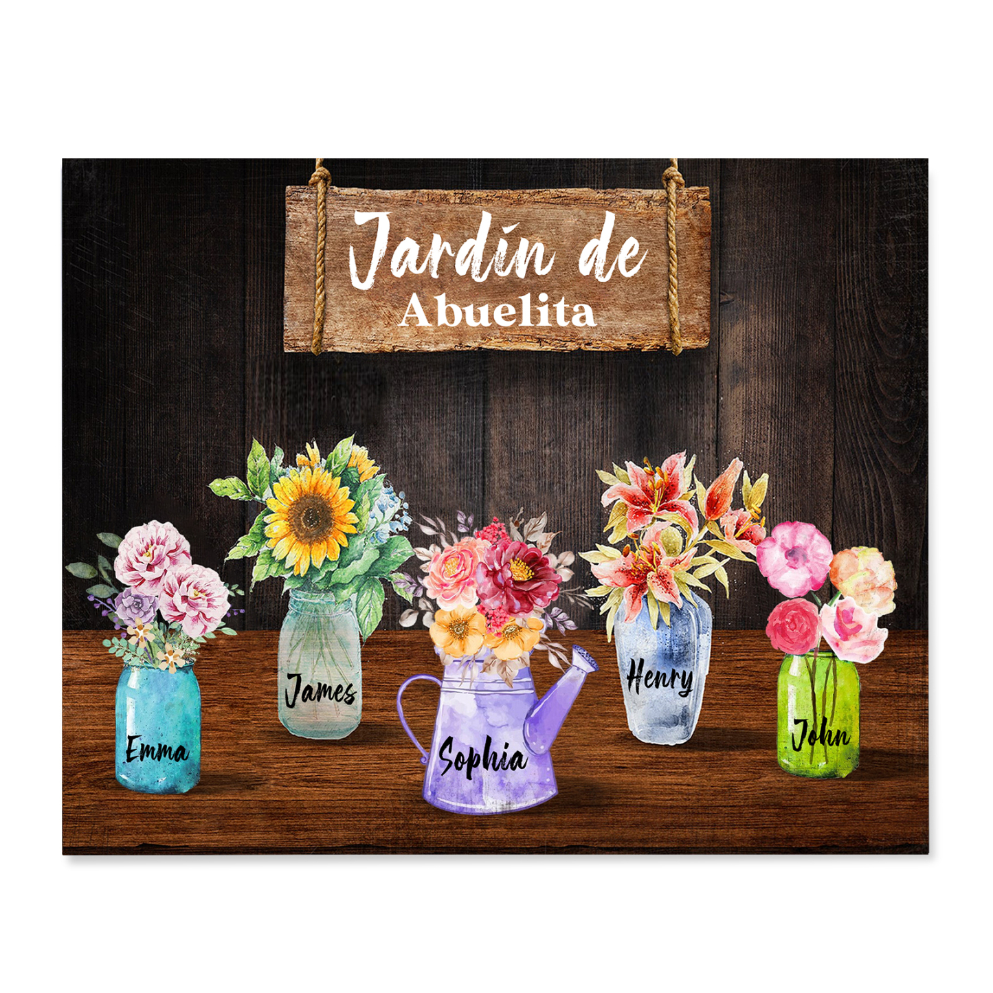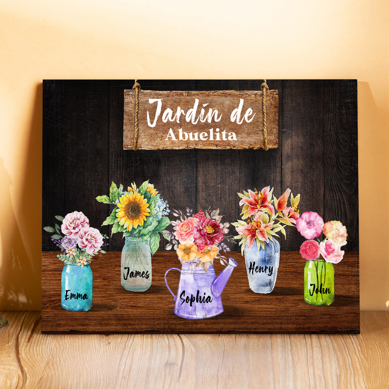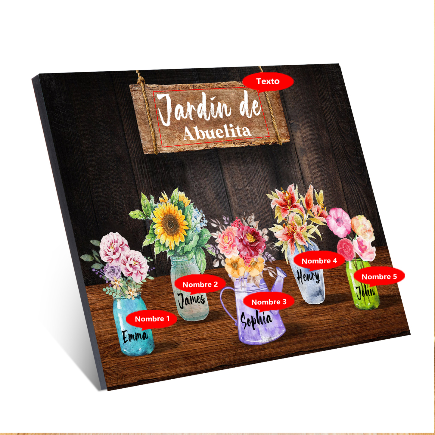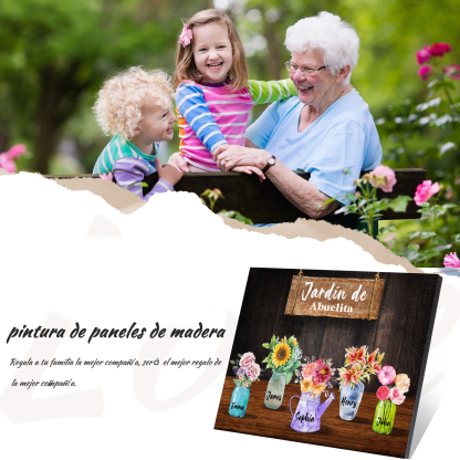 A mi familia- Lámina marco de madera con flores 5 nombres personalizados con 1 texto