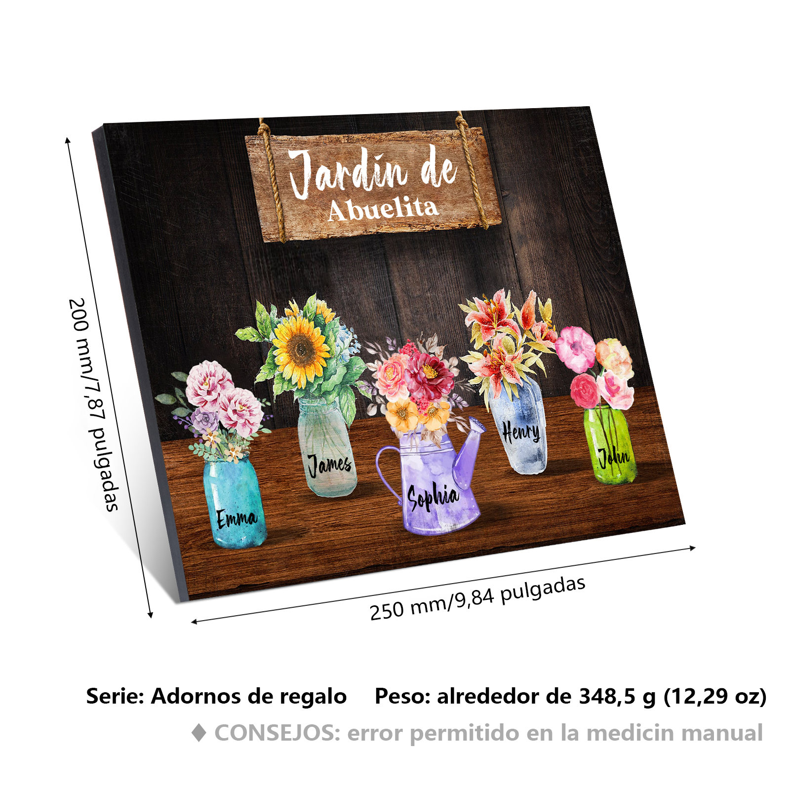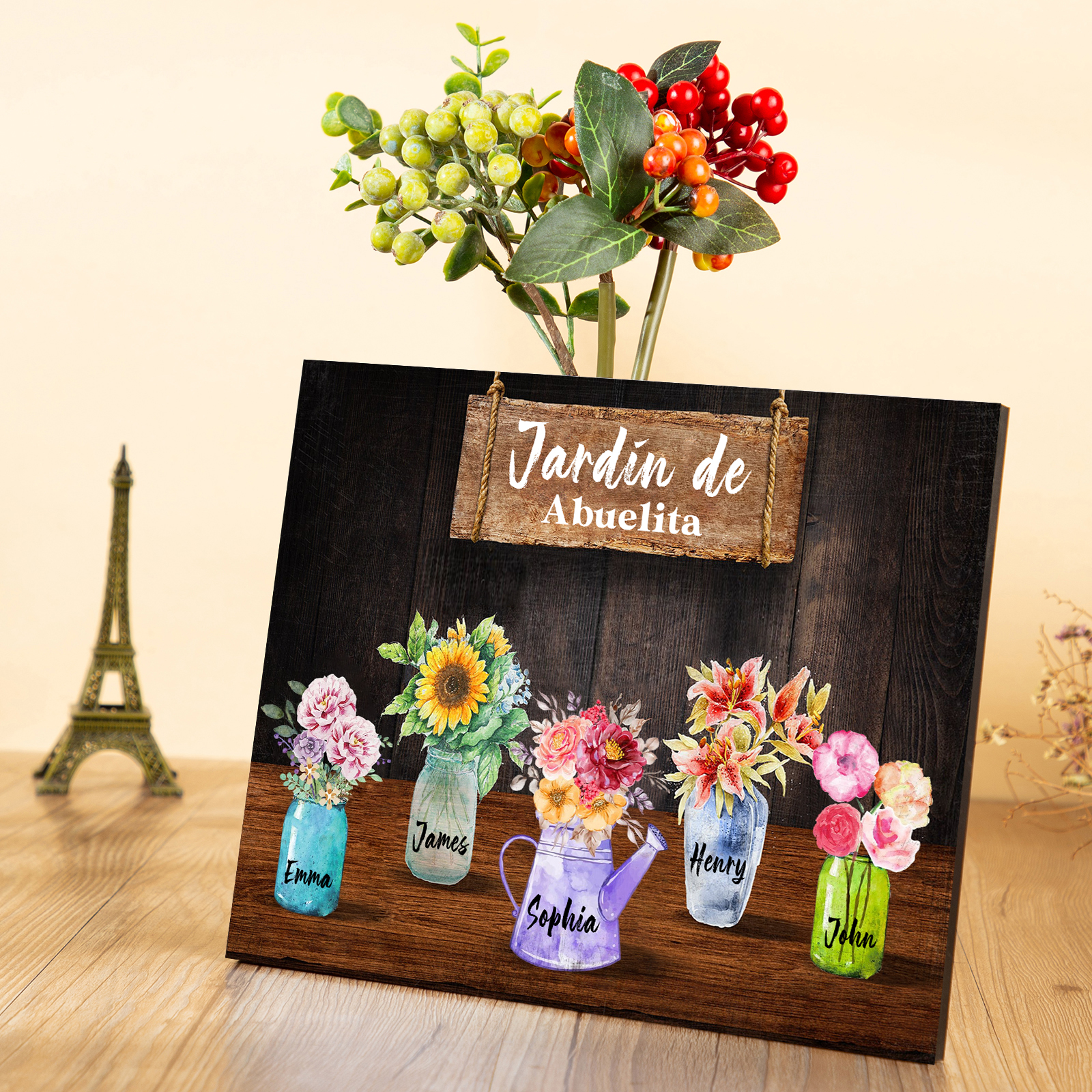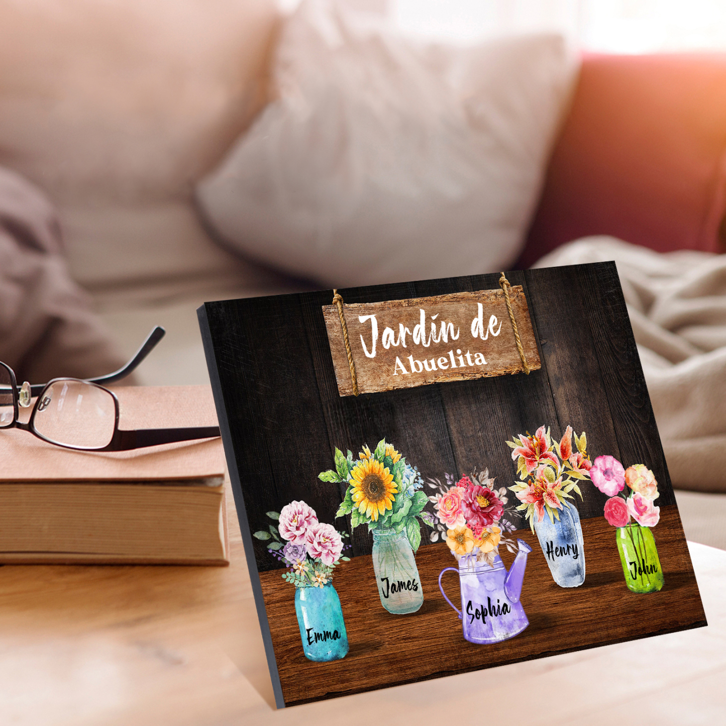 A mi familia- Lámina marco de madera con flores 5 nombres personalizados con 1 texto