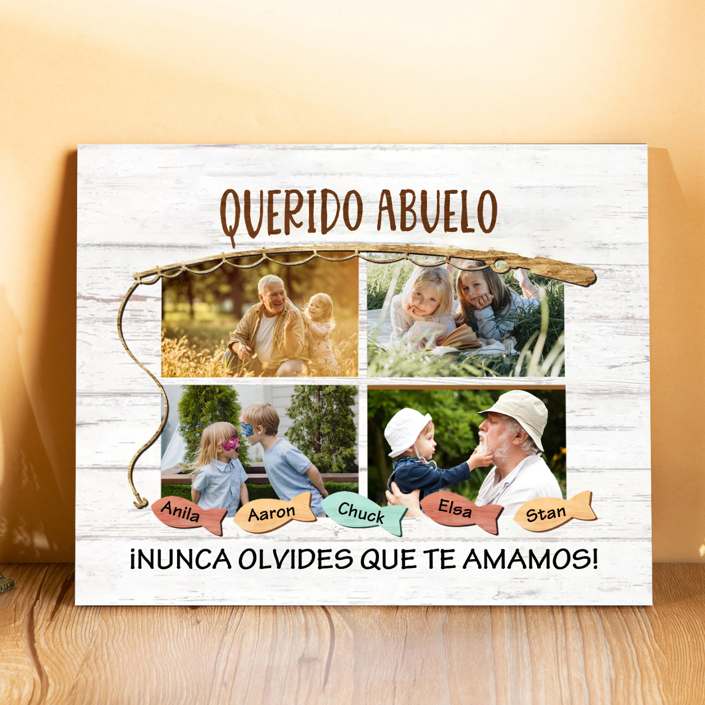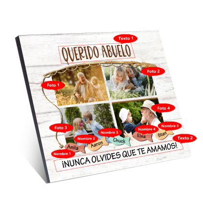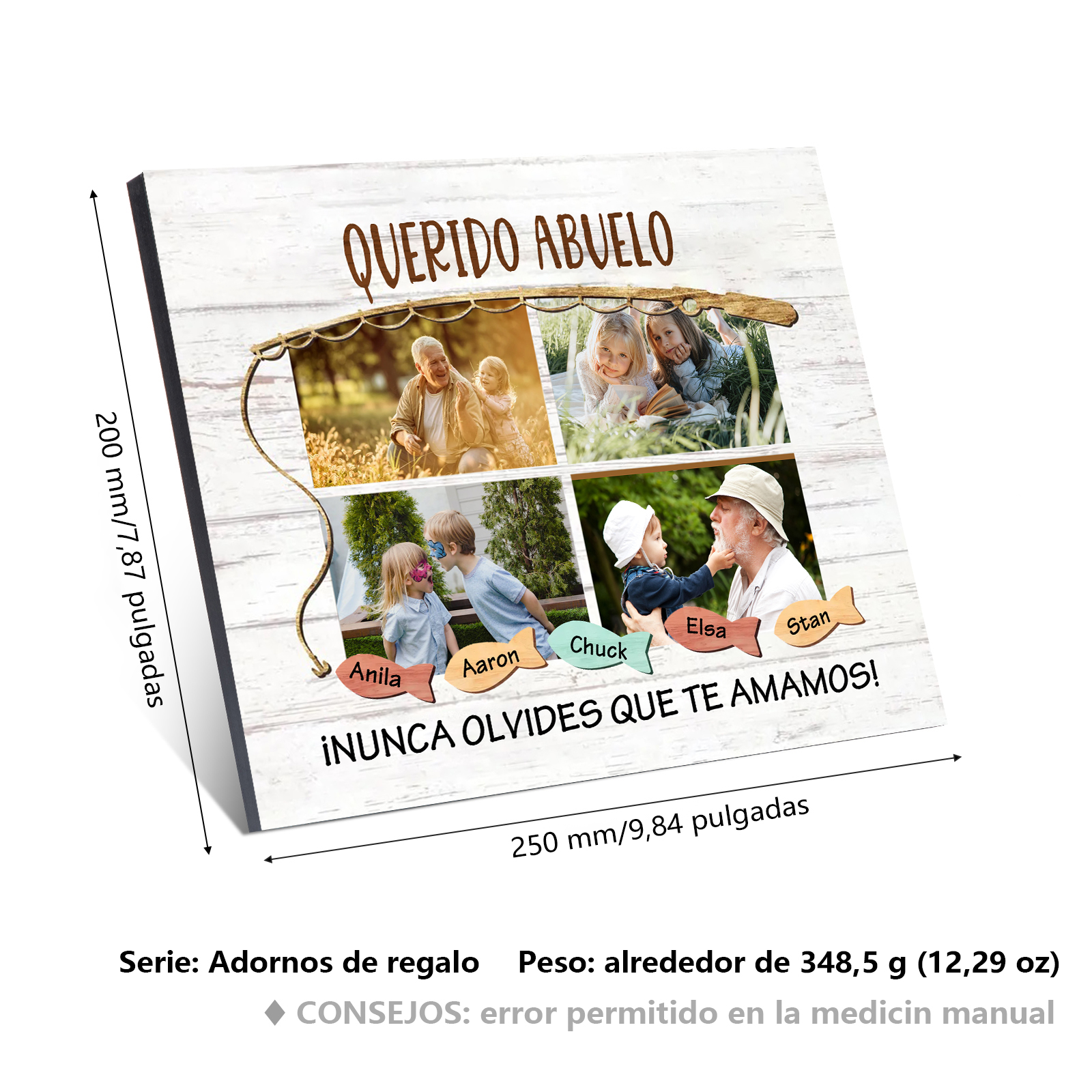 A mi familia- Lámina marco de madera peces 5 nombres y 4 fotos personalizados con 2 textos