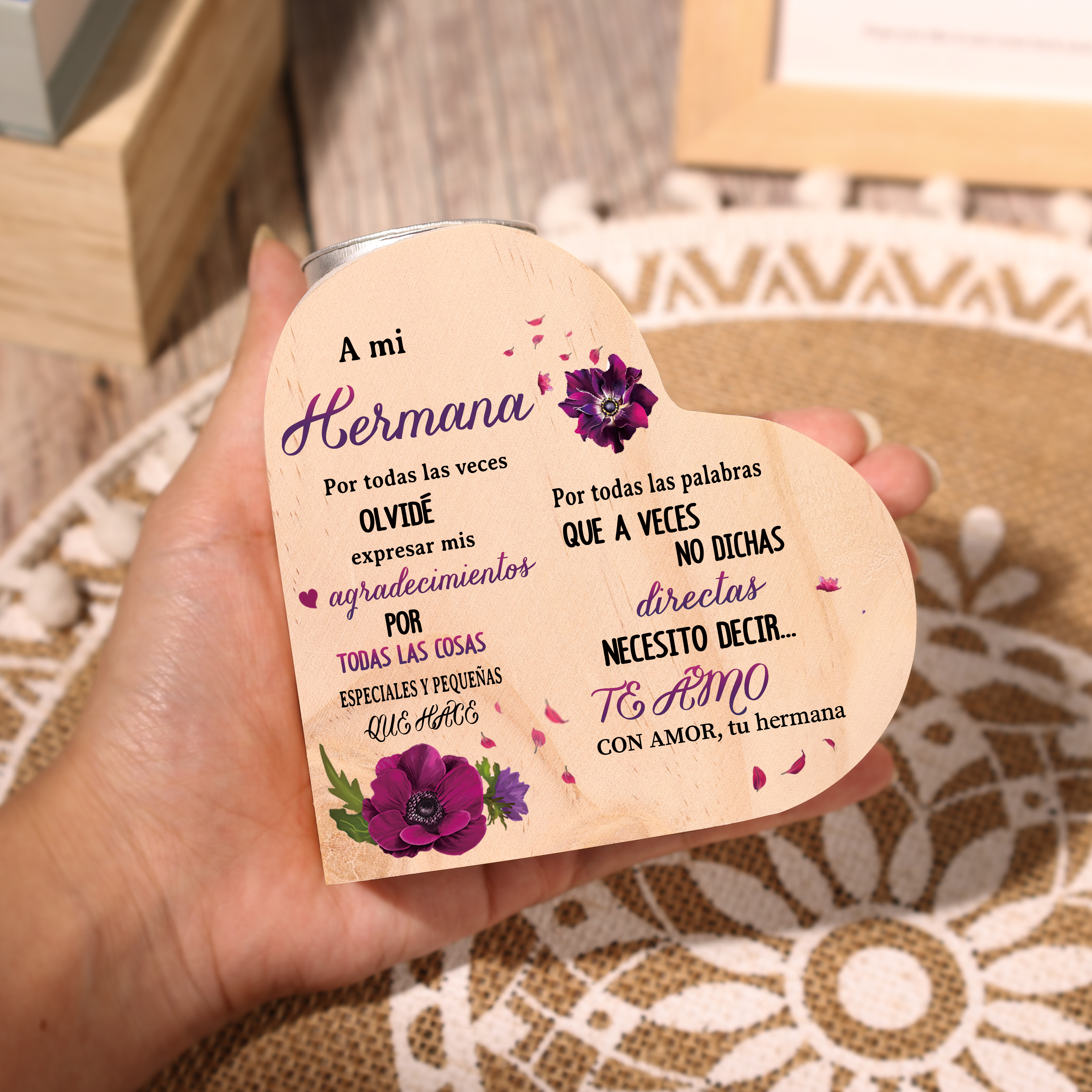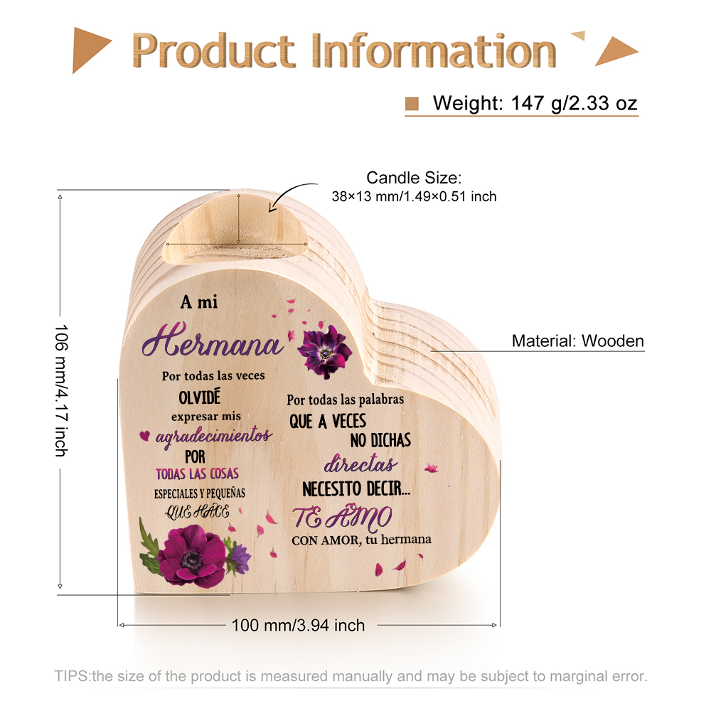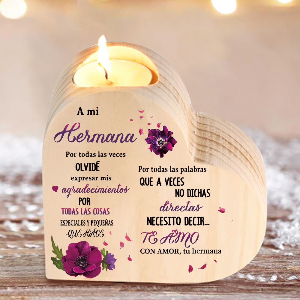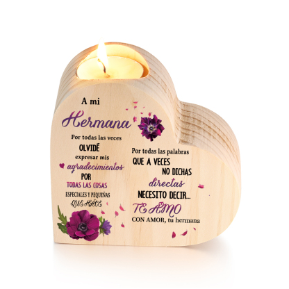 A mi hermana(de hermana)-Candelero de madera en forma de corazón con flores sin candela