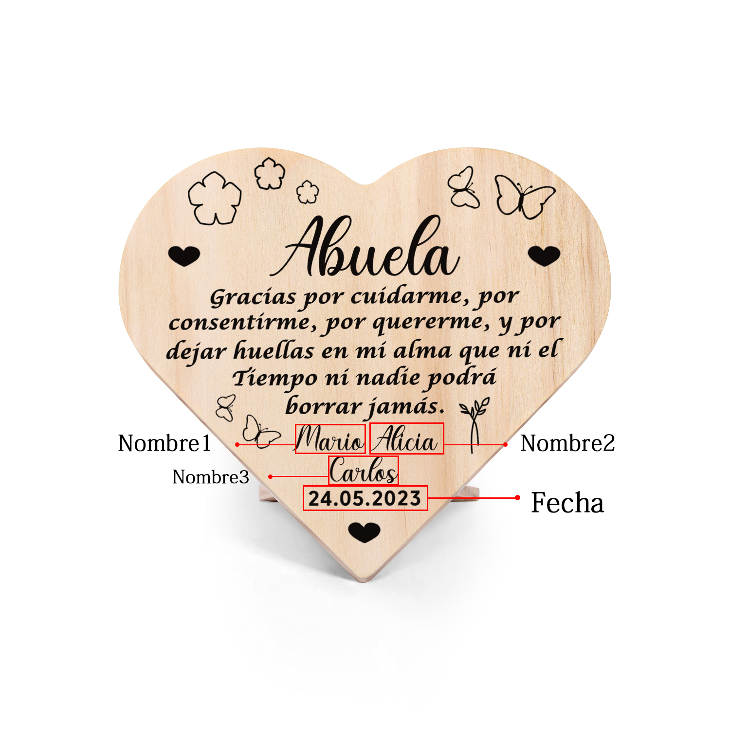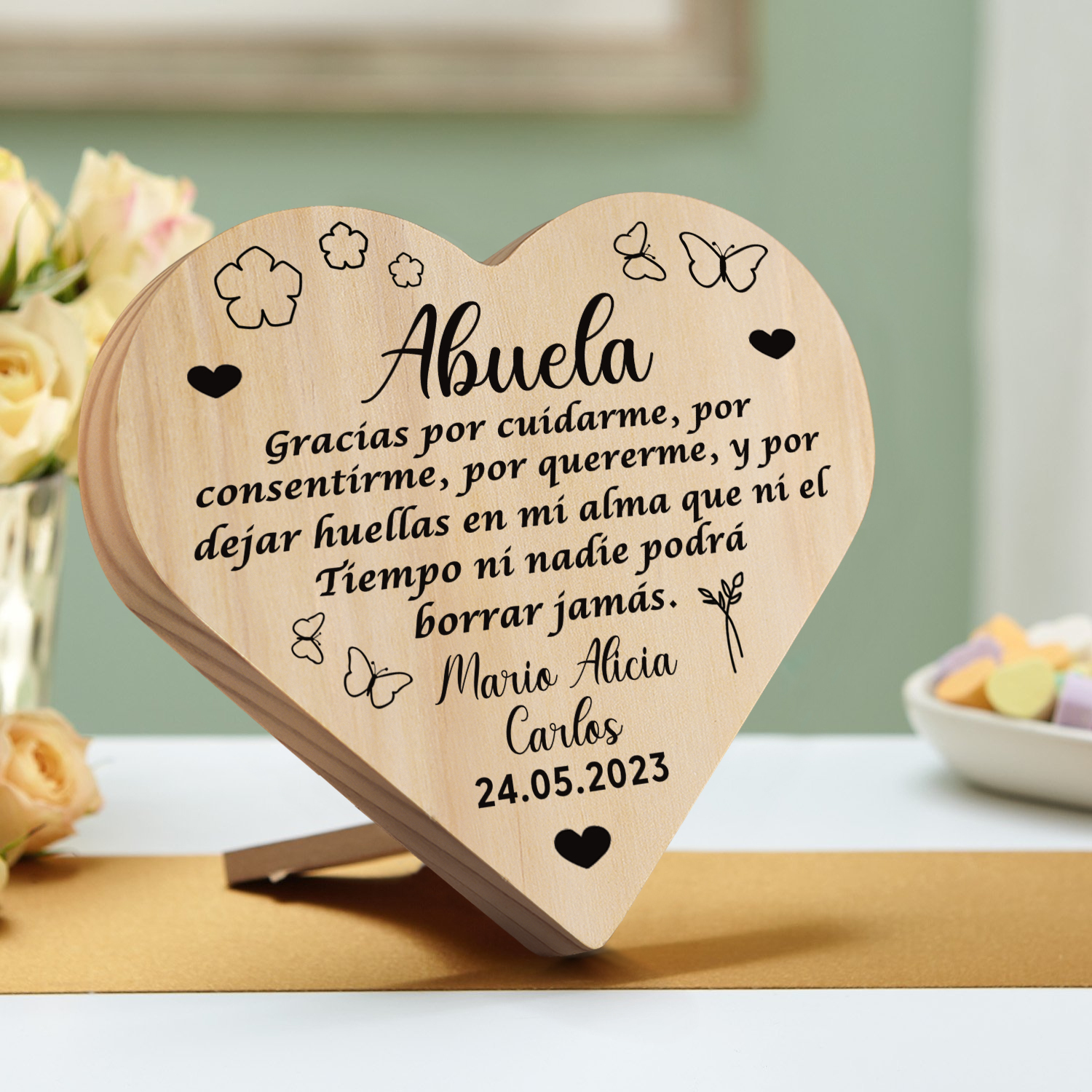 Adorno de madera en forma de corazón para mi abuela personalizado con 3 nombres y fecha
