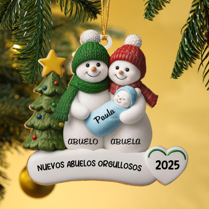 Haz un regalo emotivo y útil con este adorno personalizado de la Familia de Muñecos de Nieve, perfecto para orgullosos nuevos abuelos. Personalizable con el nombre del bebé, los títulos de los abuelos y el año, es un dulce recuerdo que celebra su nueva etapa y luce precioso en cualquier árbol de Navidad.