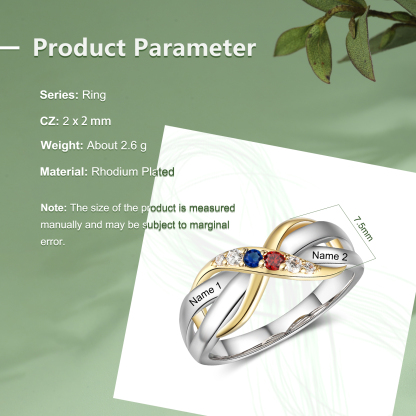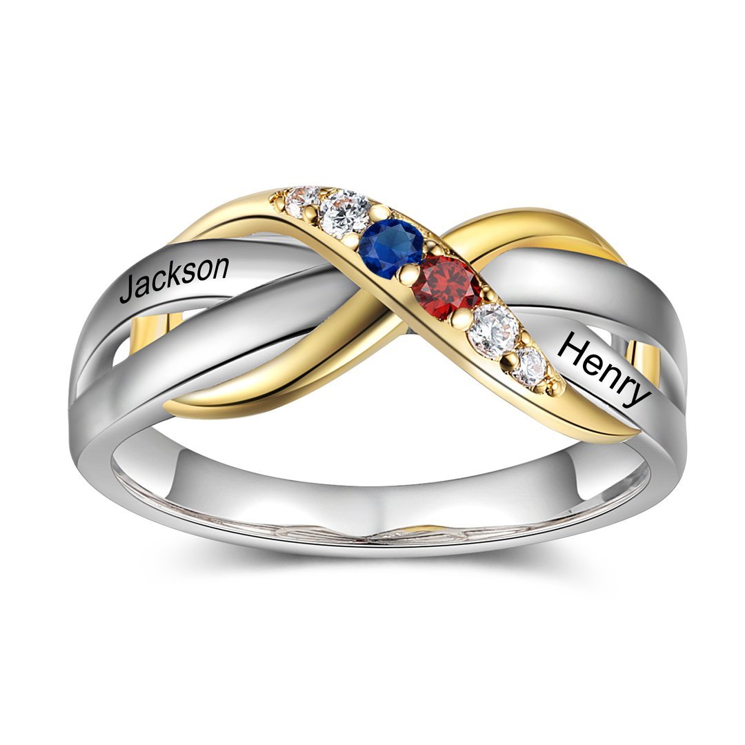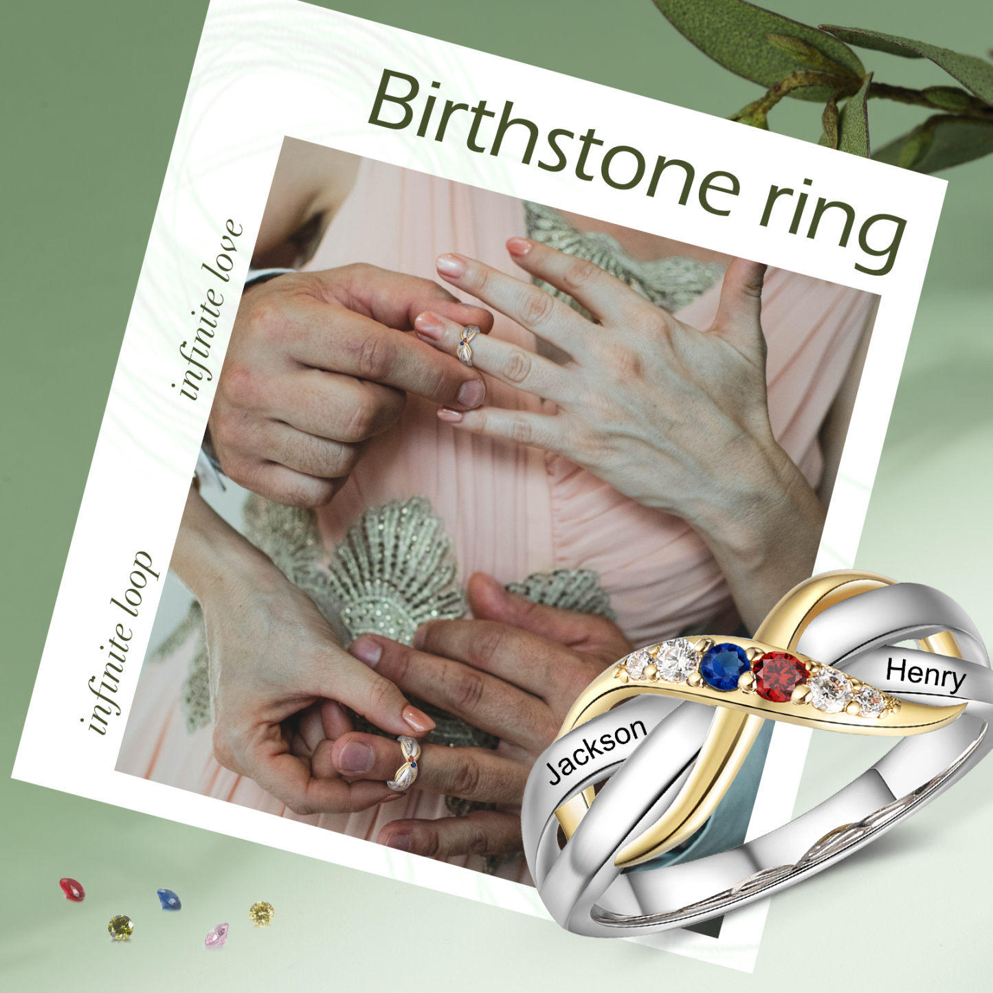Anillo infinito personalizado con 2 piedras de nacimiento y 2 nombres