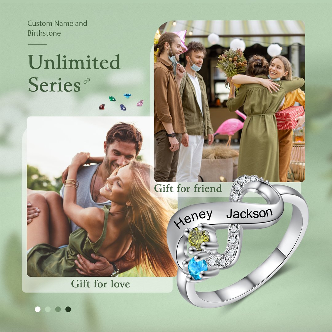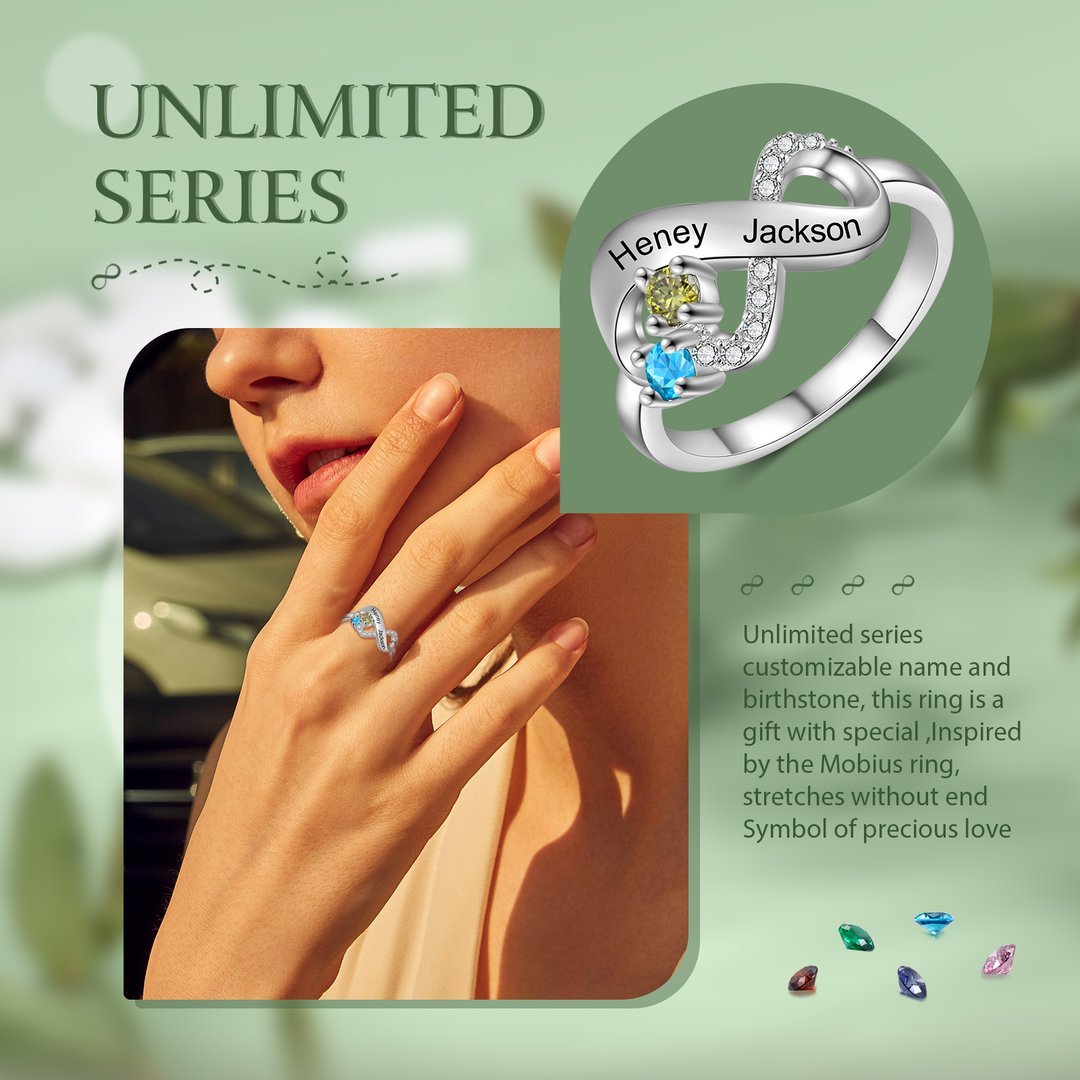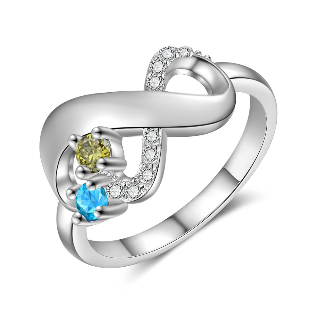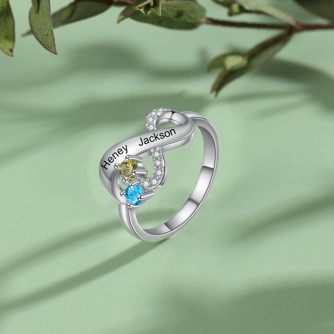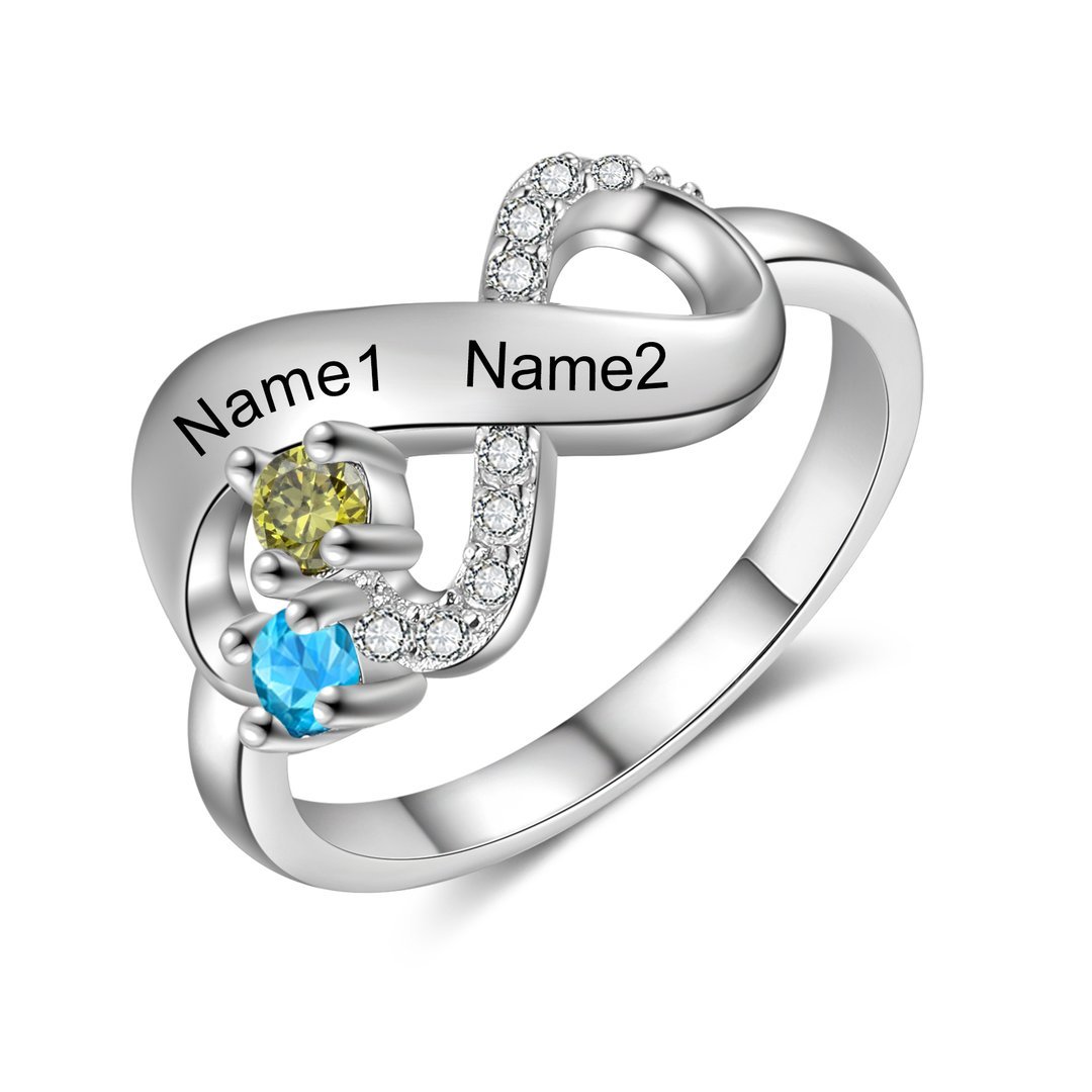 Anillo infinito personalizado de 2 nombres con 2 piedras de nacimiento