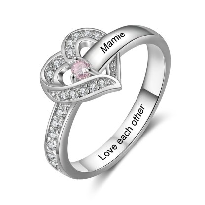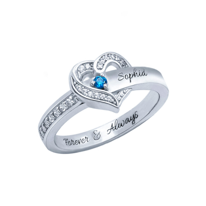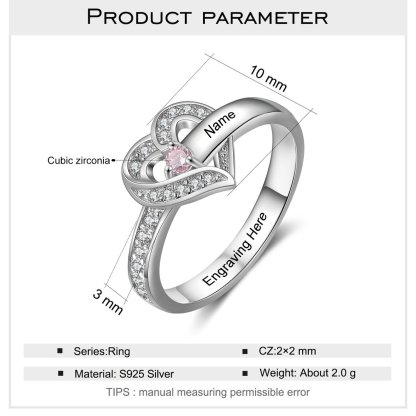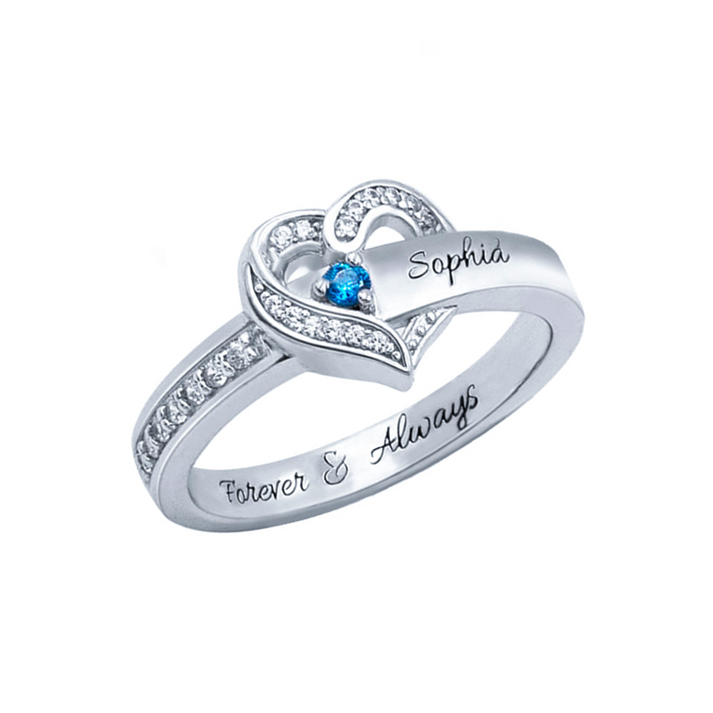 Anillo Plata 925 de corazón personalizado con 1 nombre y 1 piedra de nacimiento con 1 texto