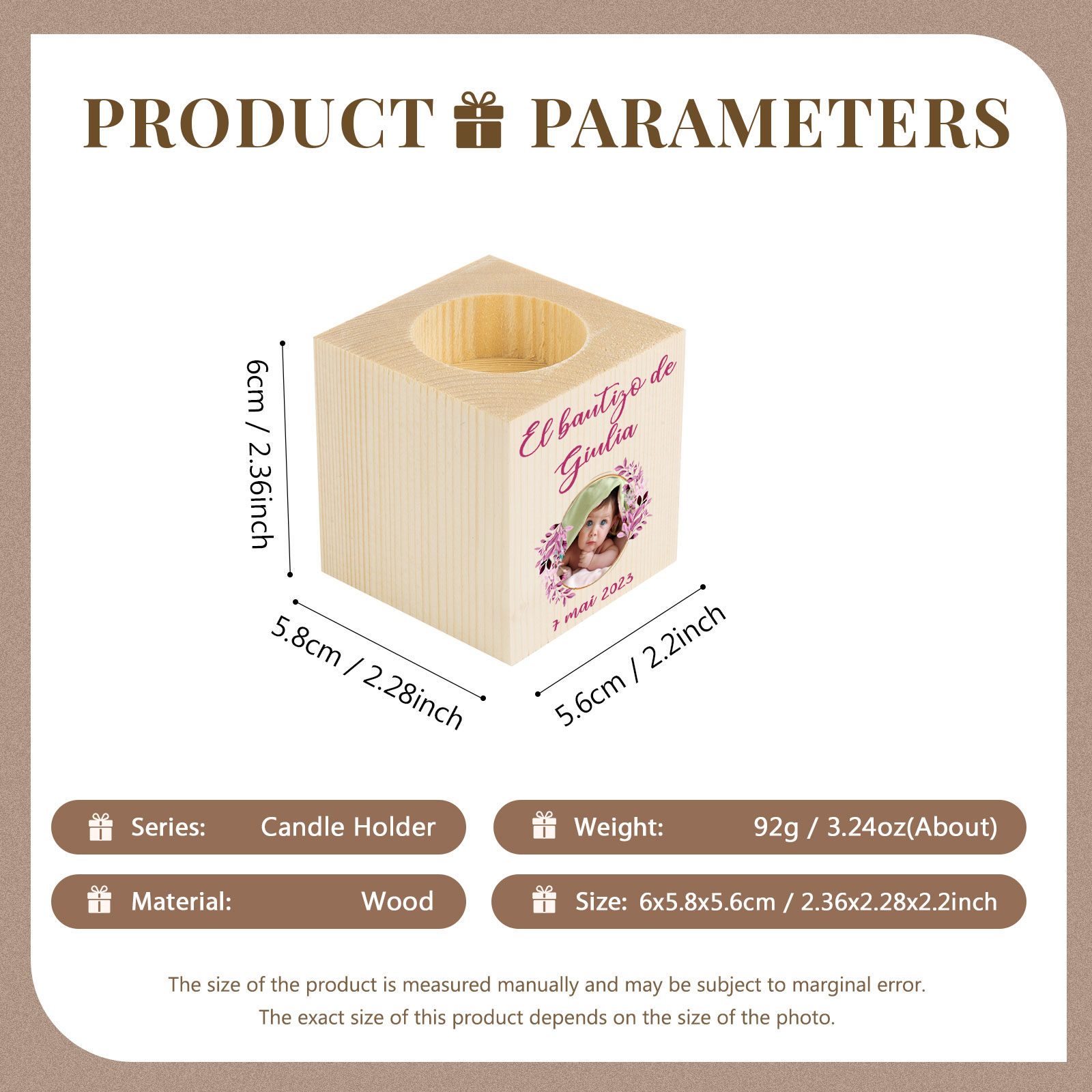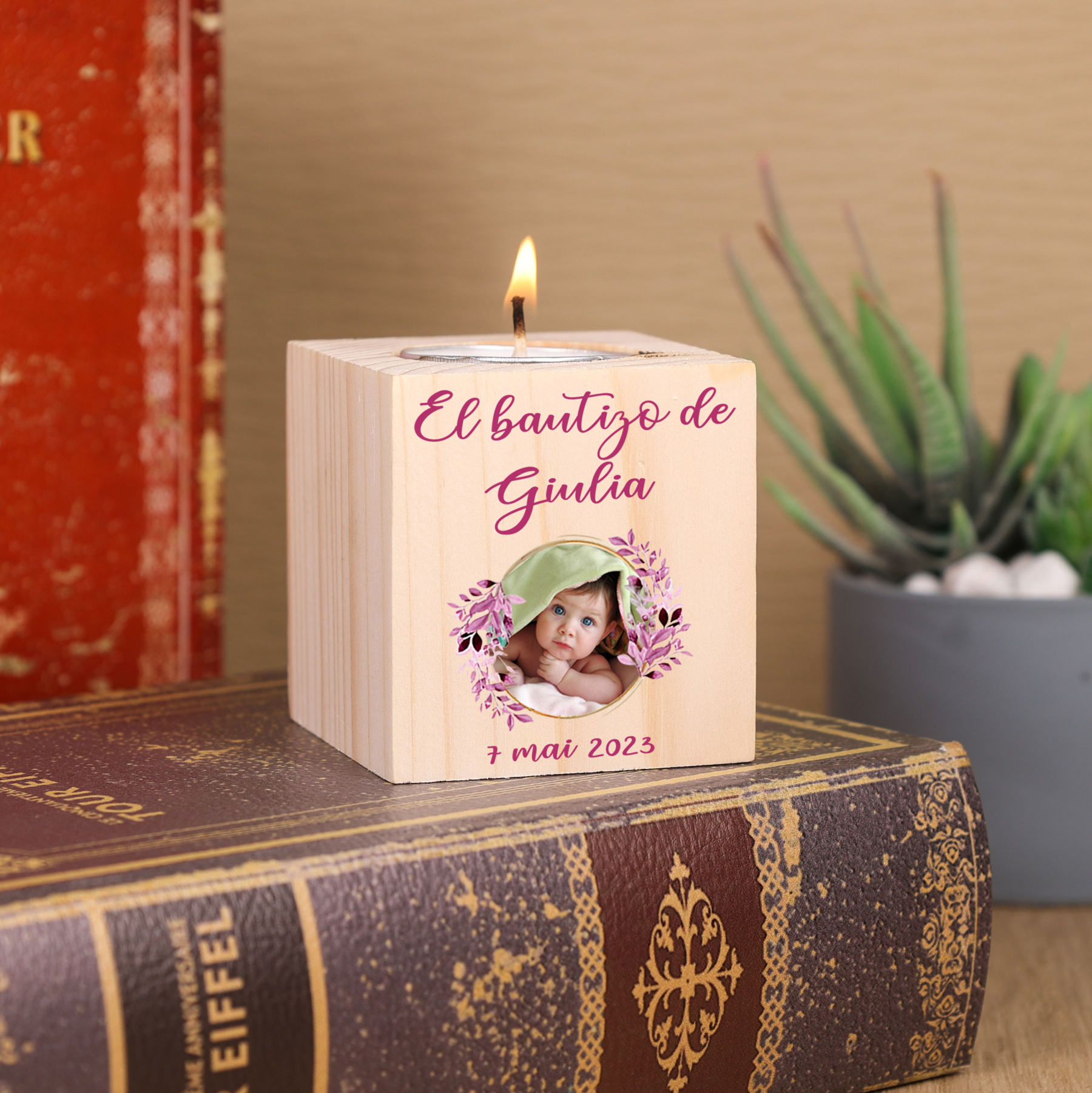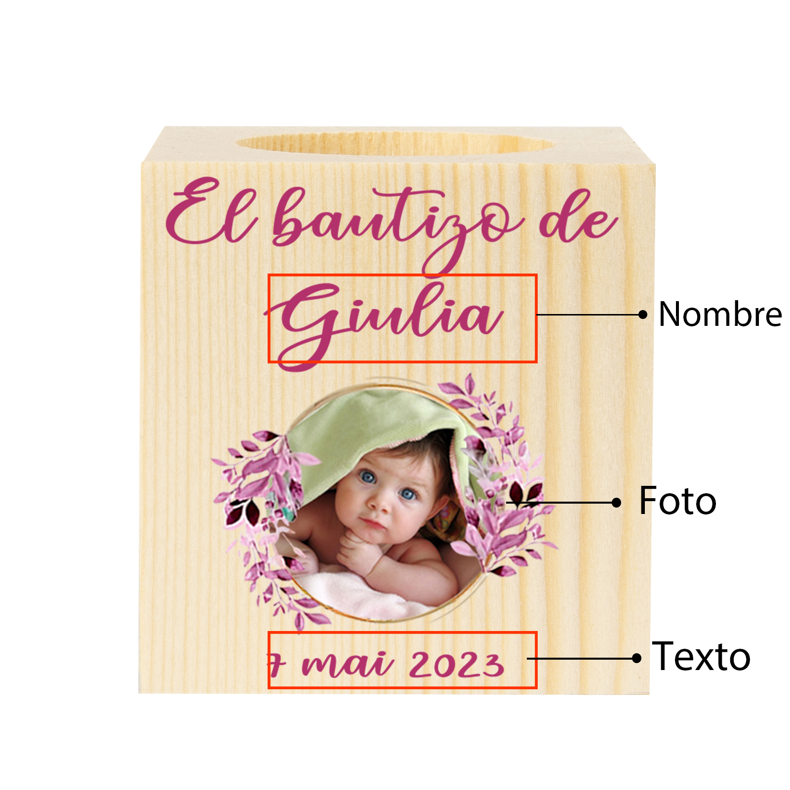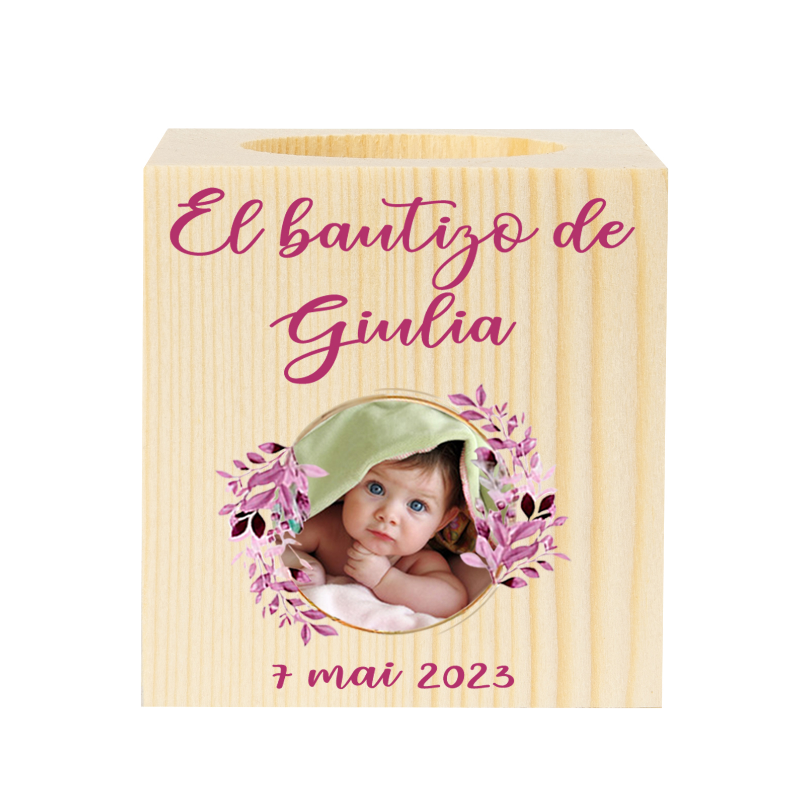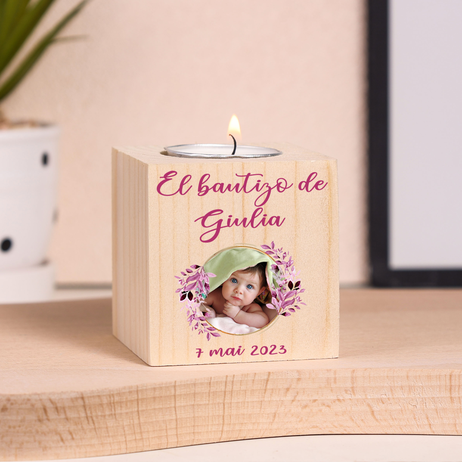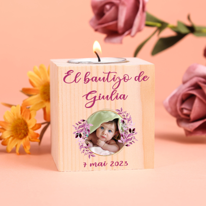 Bautizo Candelero de Madera Flor Nombre Personalizado con Texto y Foto sin Vela