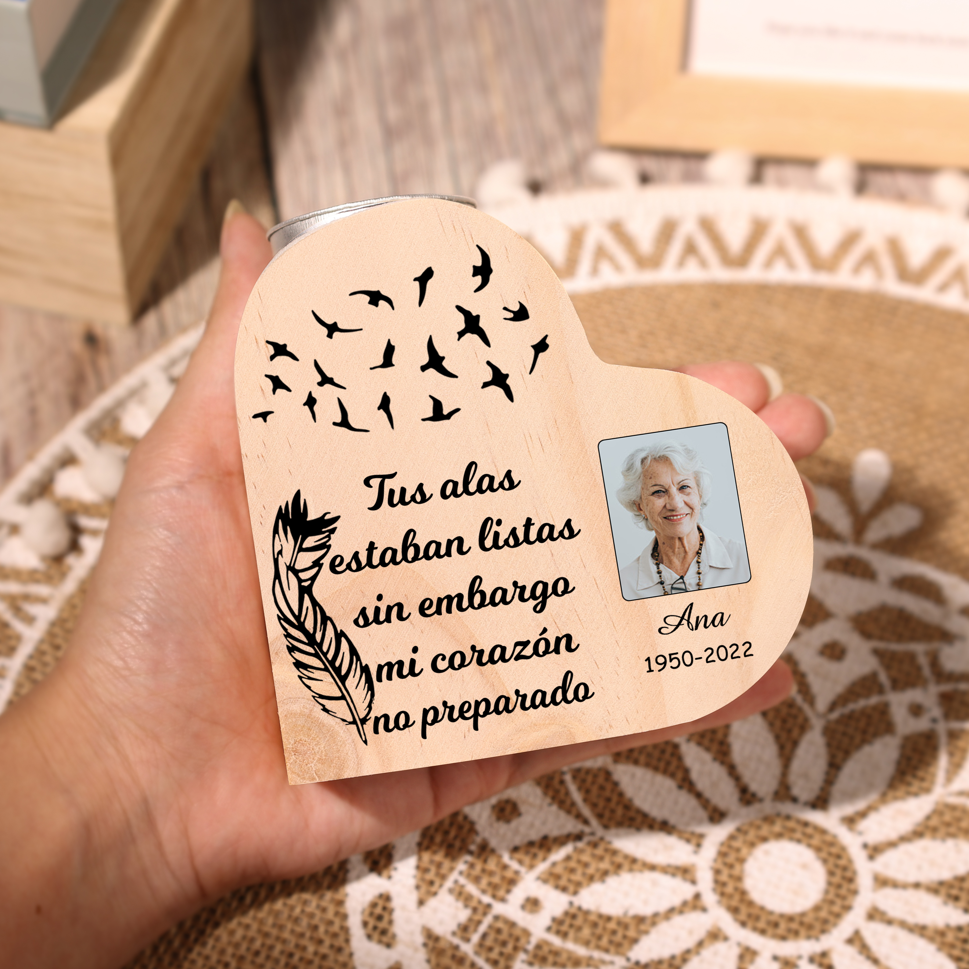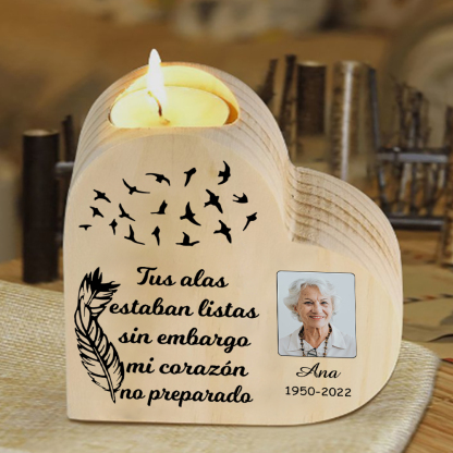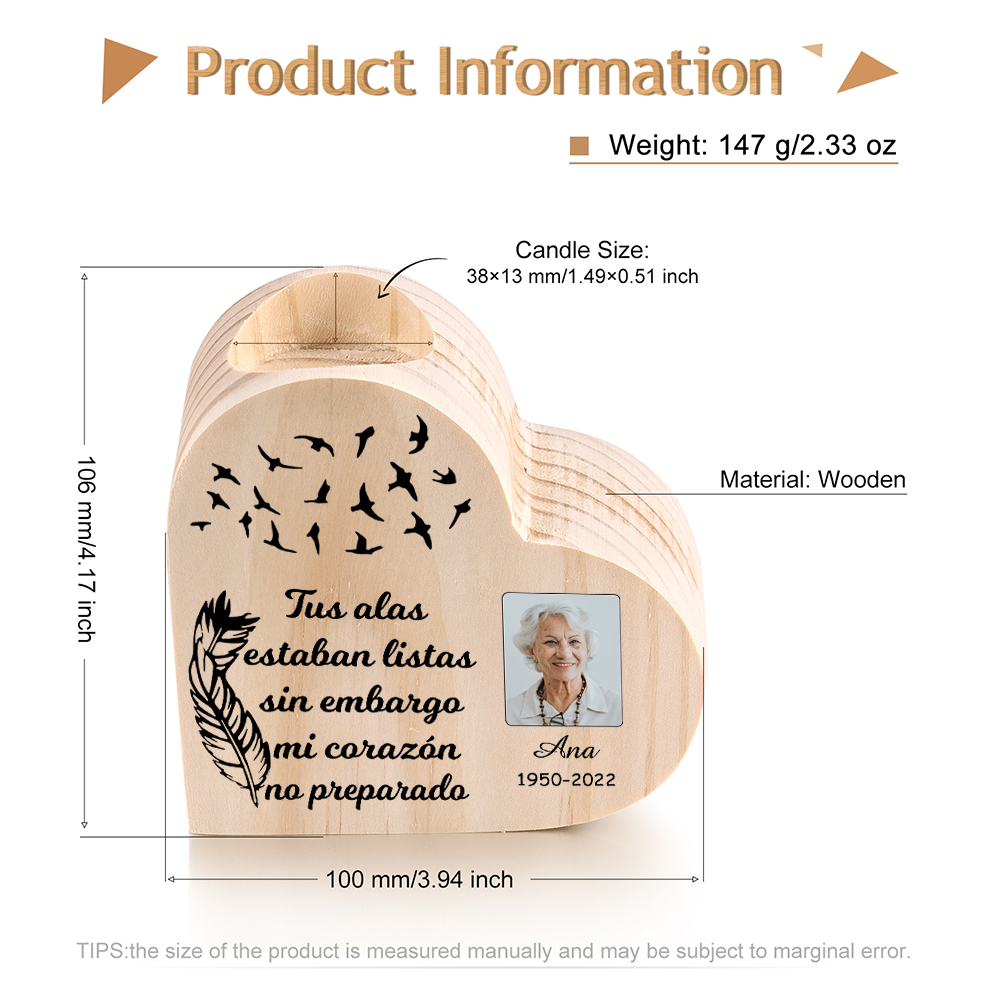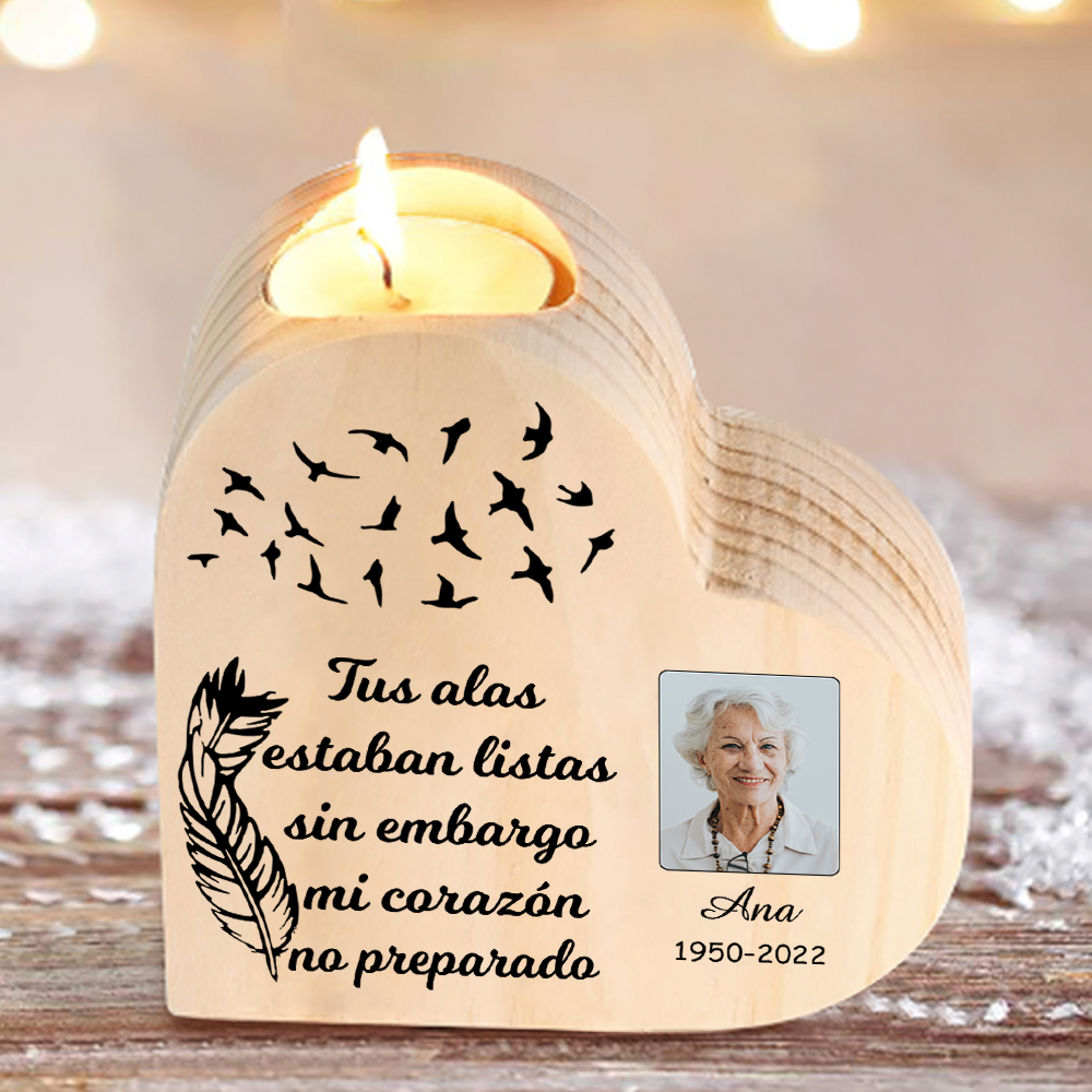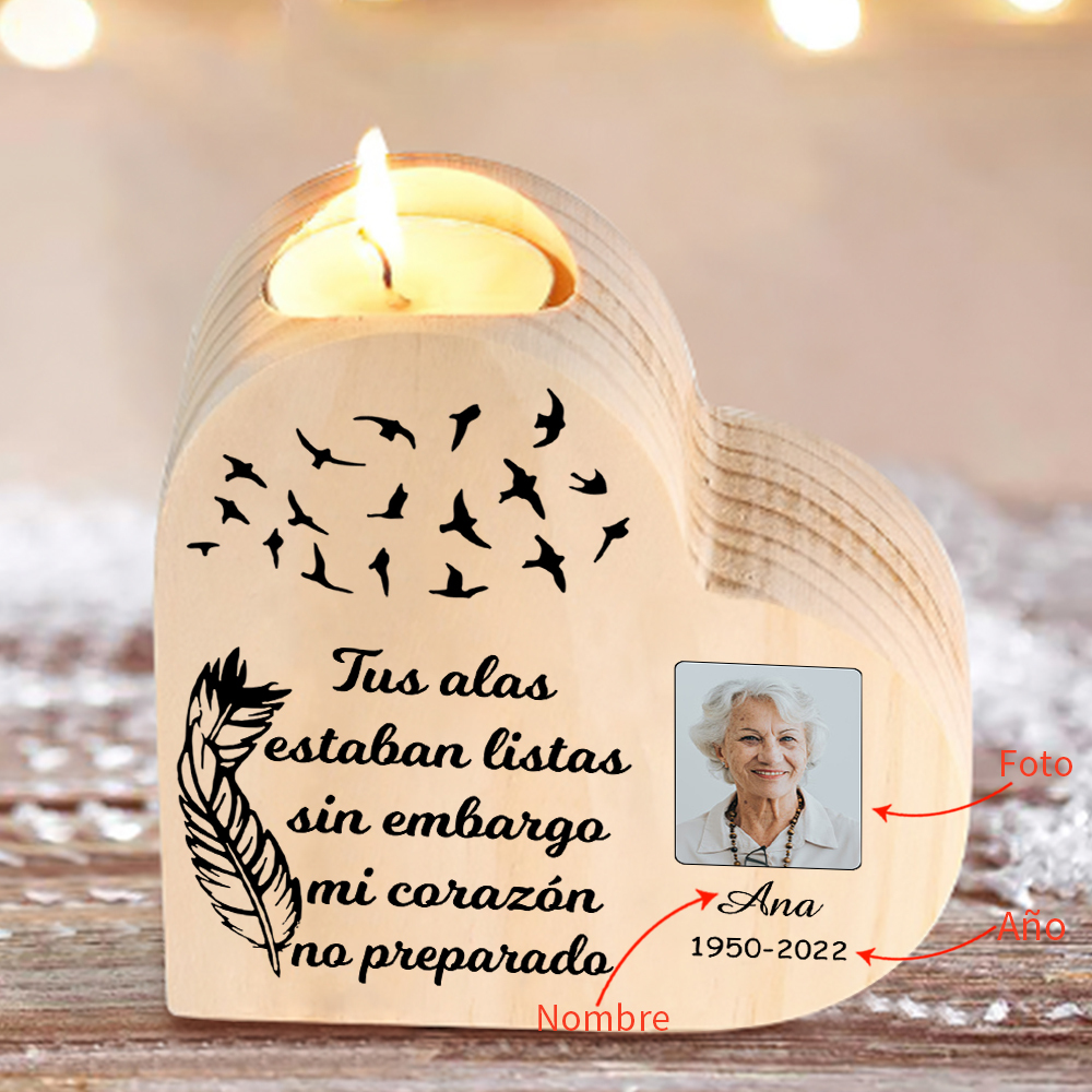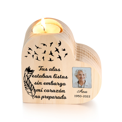 Candelero de corazón en memoria de ser querido de madera foto, nombre y año personalizados sin vela