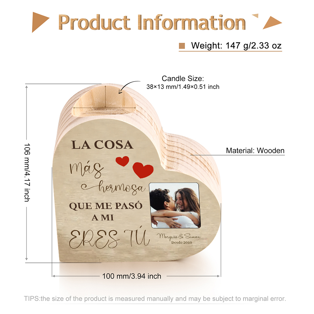 Candelero de madera para pareja personalizado con 2 nombres, año y foto sin vela