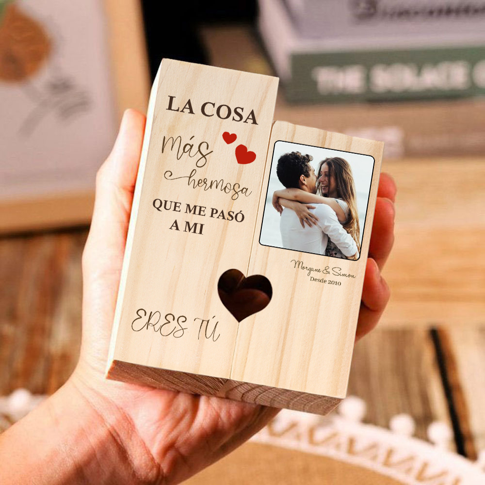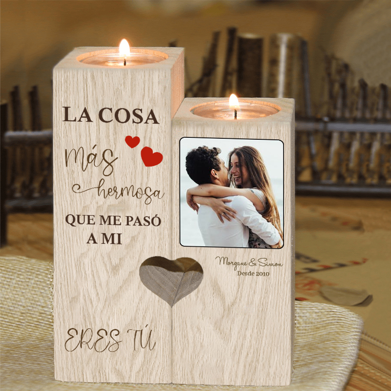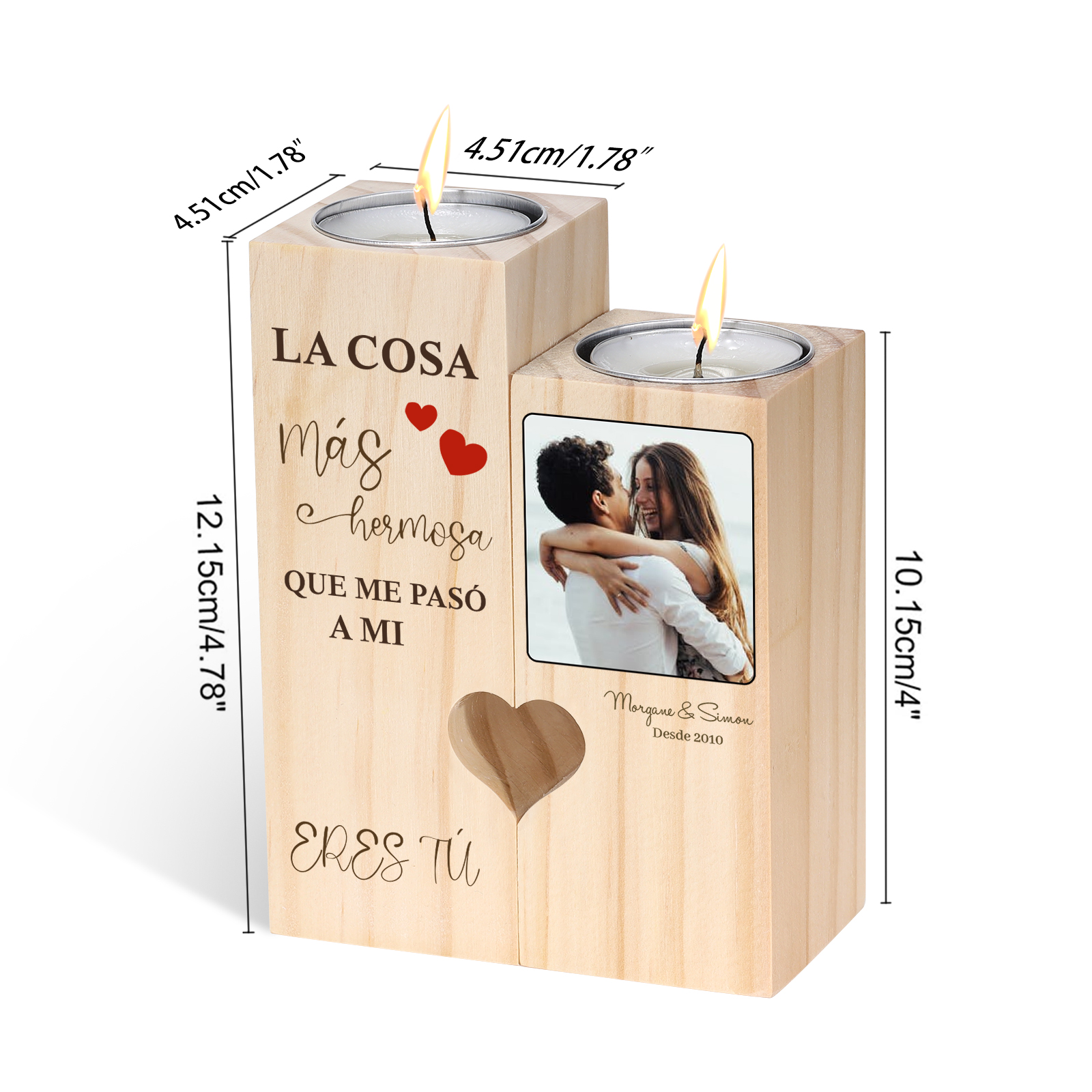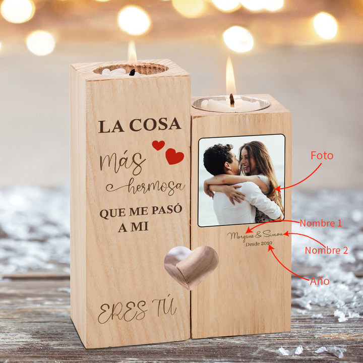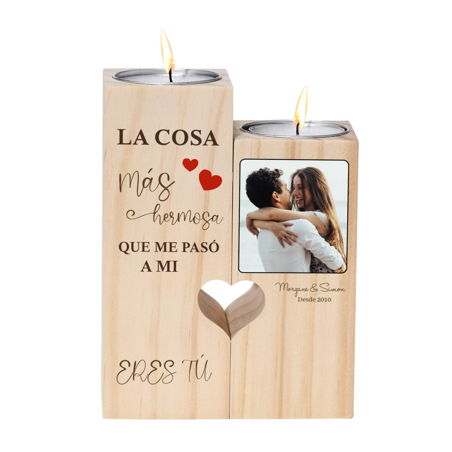 Candelero de madera sin vela personalizado con 2 nombres, 1 año y 1 foto