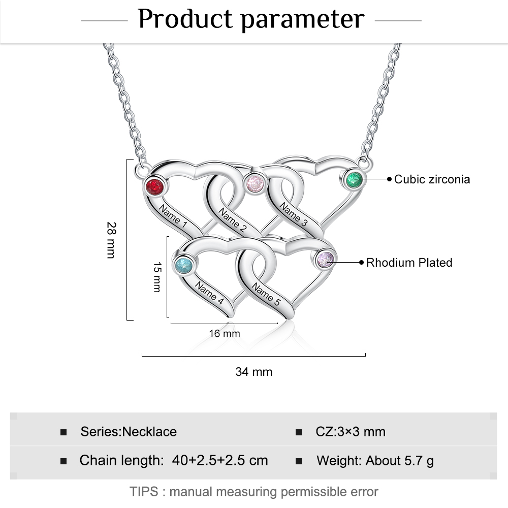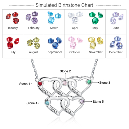 Collar para Mujer con Colgante de 5 Corazones 5 Nombres Personalizados con 5 Piedras de nacimiento