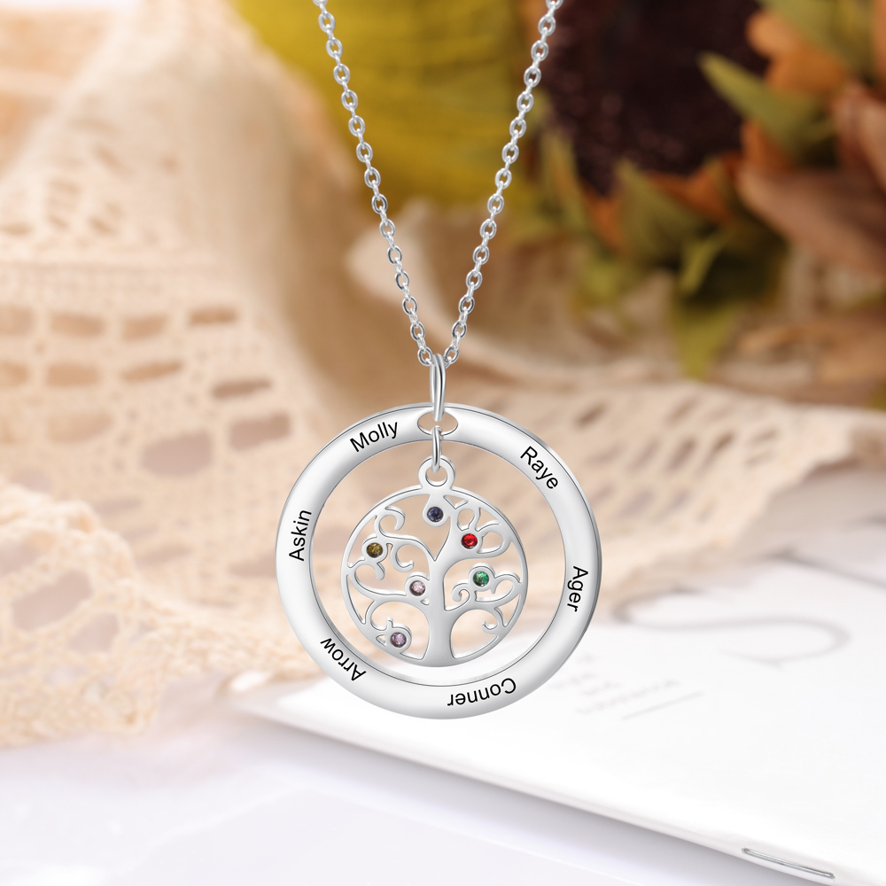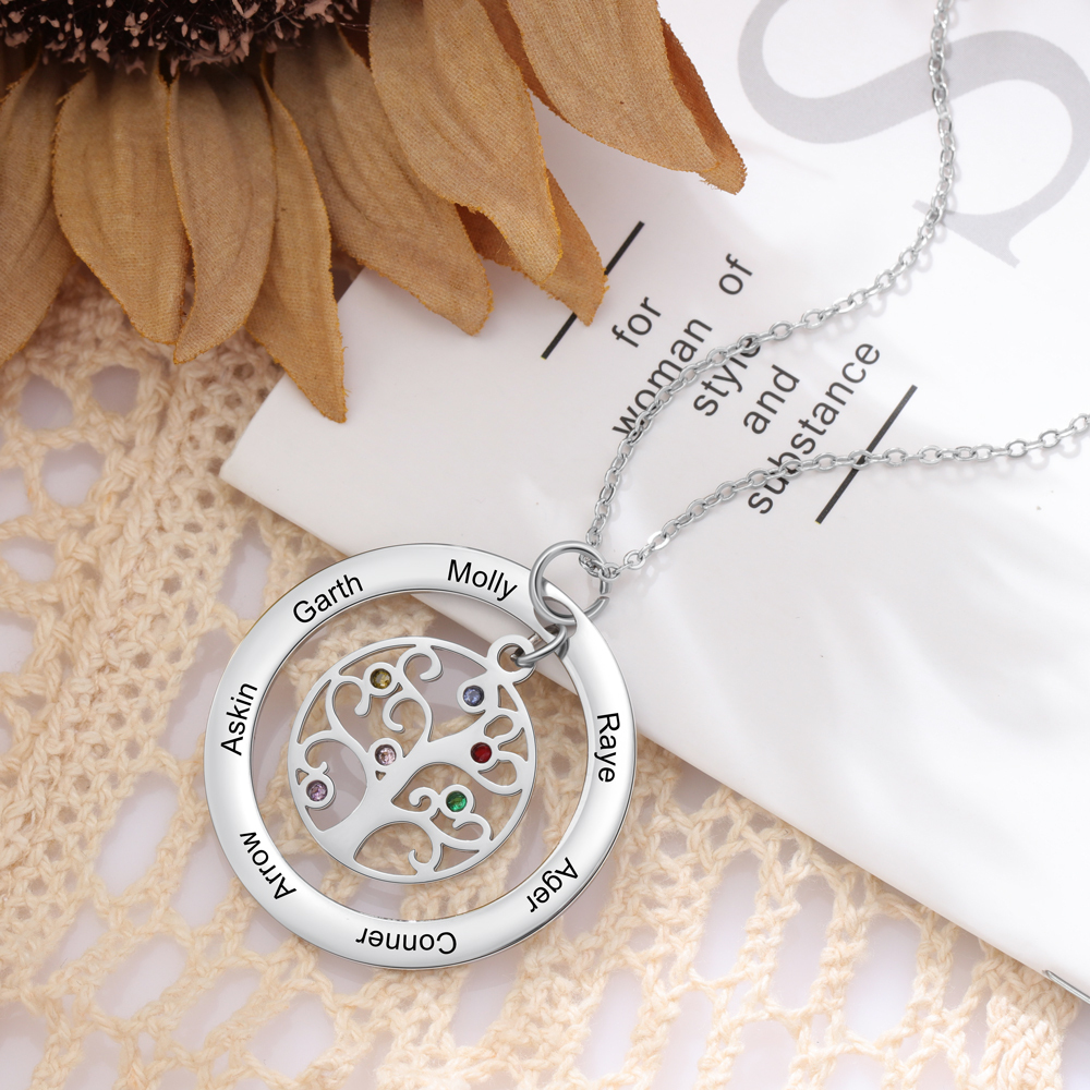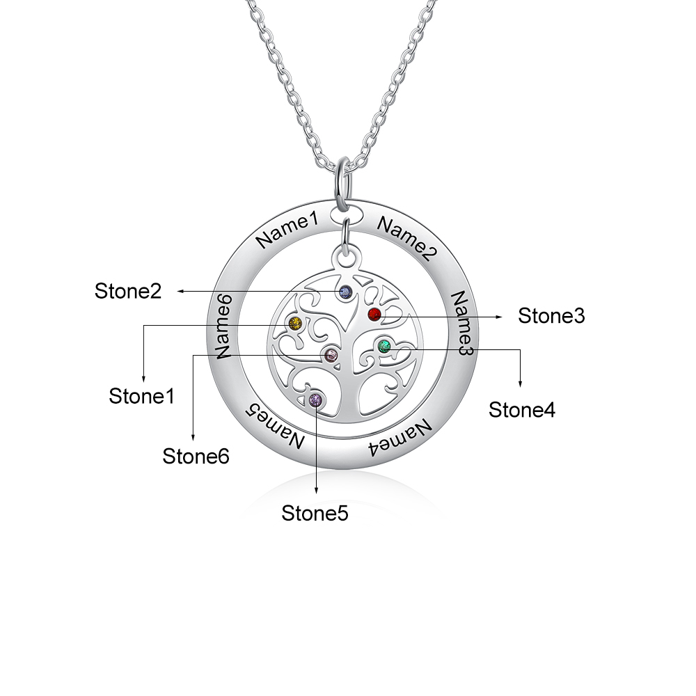 Collar para mujer con colgante de árbol de la vida árbol genealógico 6 nombres y 6 piedras de nacimiento personalizados