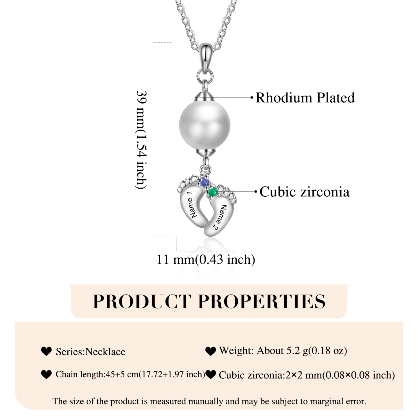 Collar para mujer con colgante de perlas con pies de bebé 2 nombres personalizados con 2 piedras de nacimiento