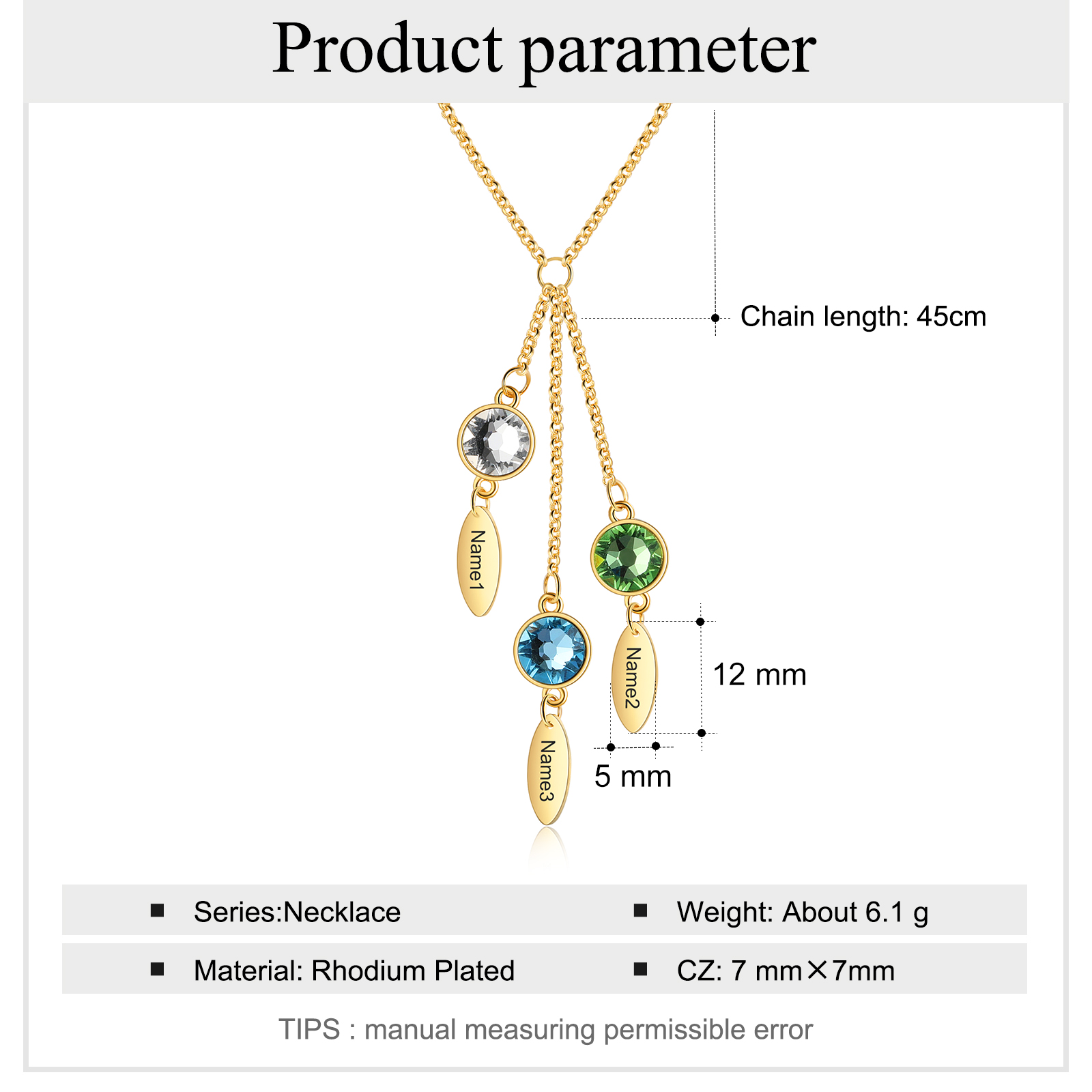 Collar para mujer con colgantes de 3 nombres y 3 piedras de nacimiento