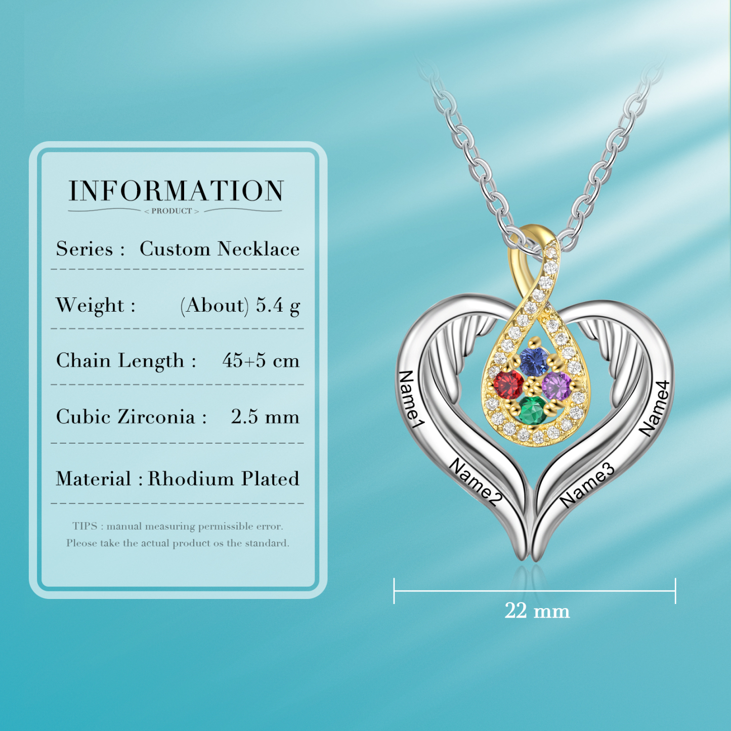 Collar para mujer con corazón con 4 nombres personalizados y 4 piedras de nacimiento
