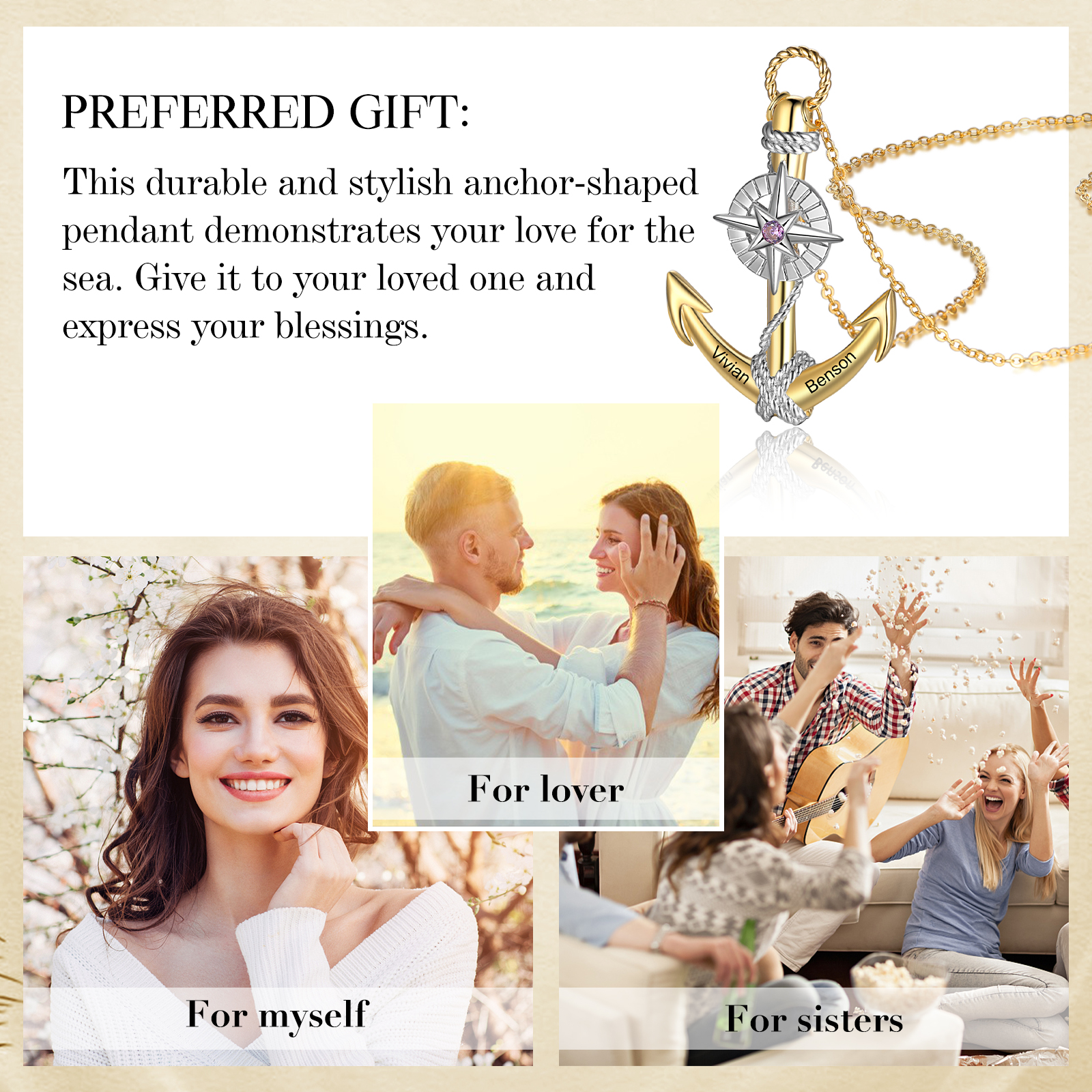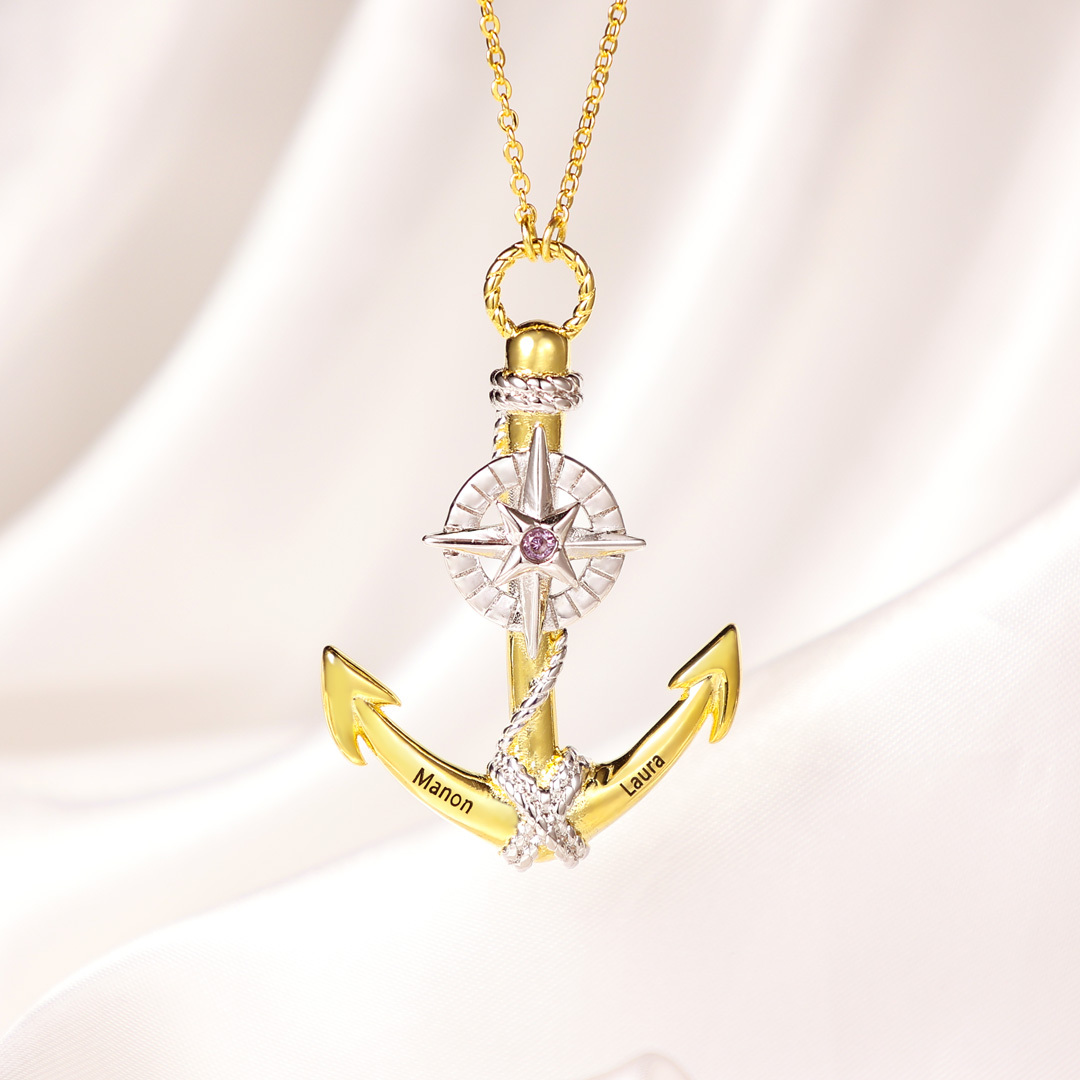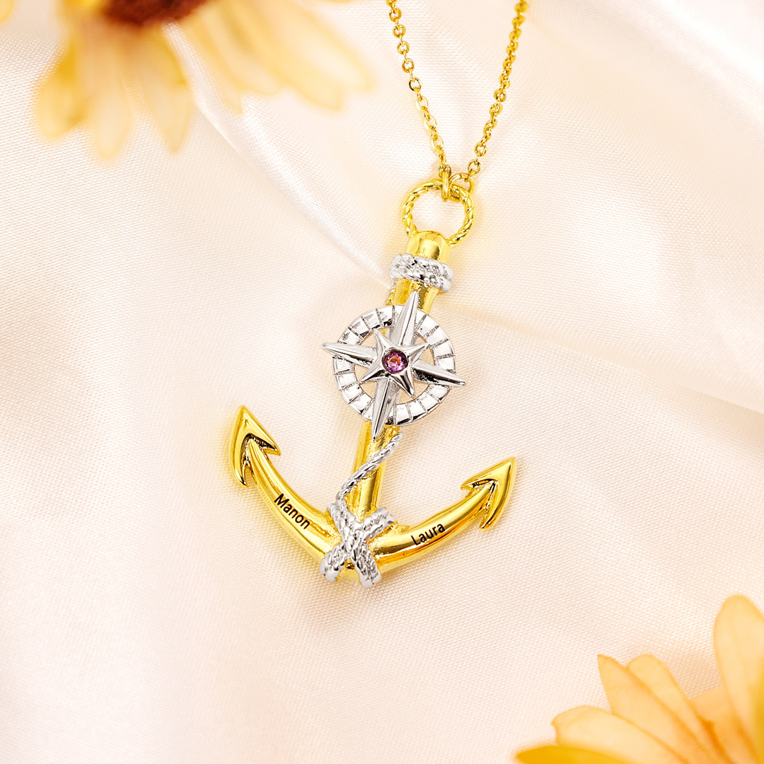 Collar para hombre de ancla marina náutica 2 nombres personalizados y 1 piedra de nacimiento