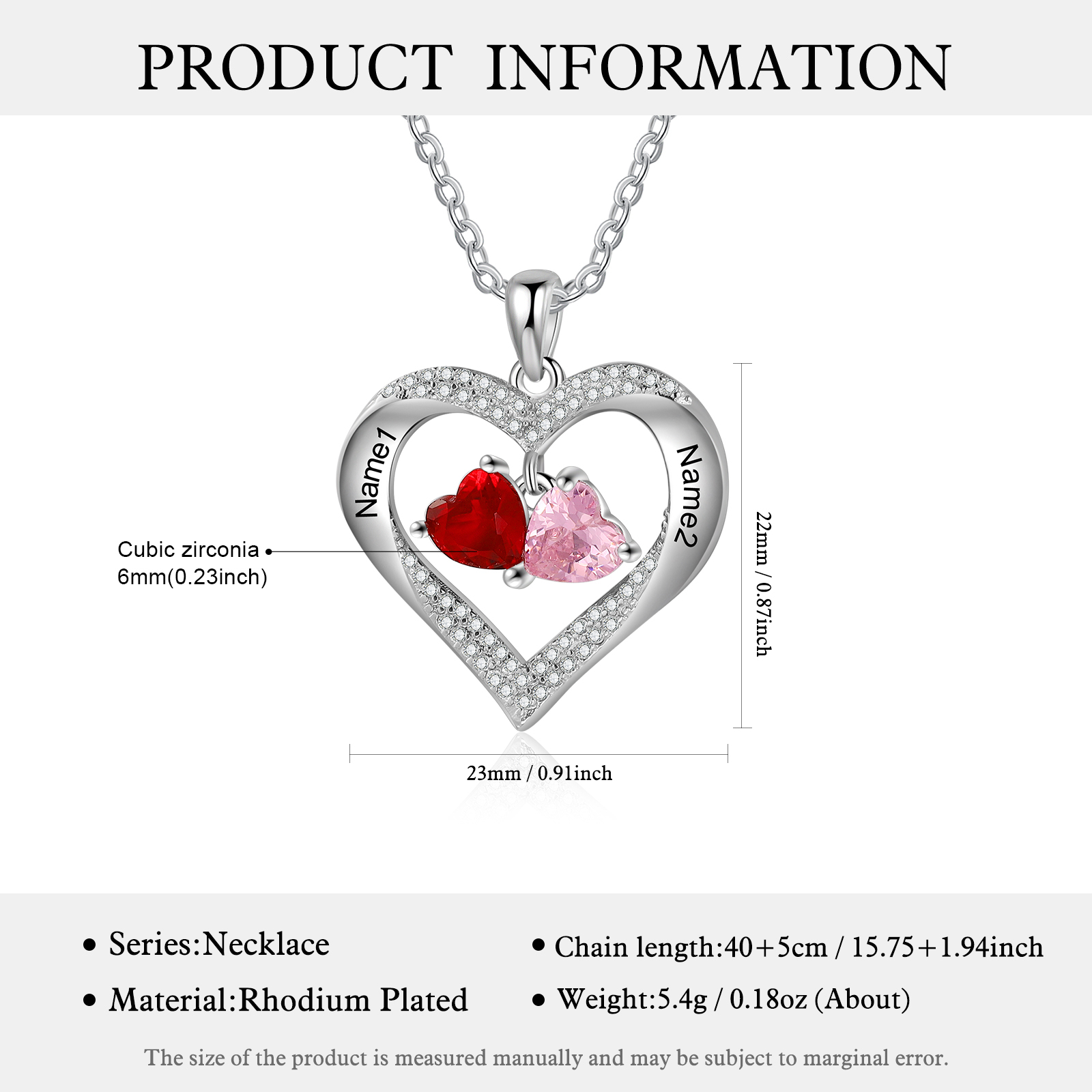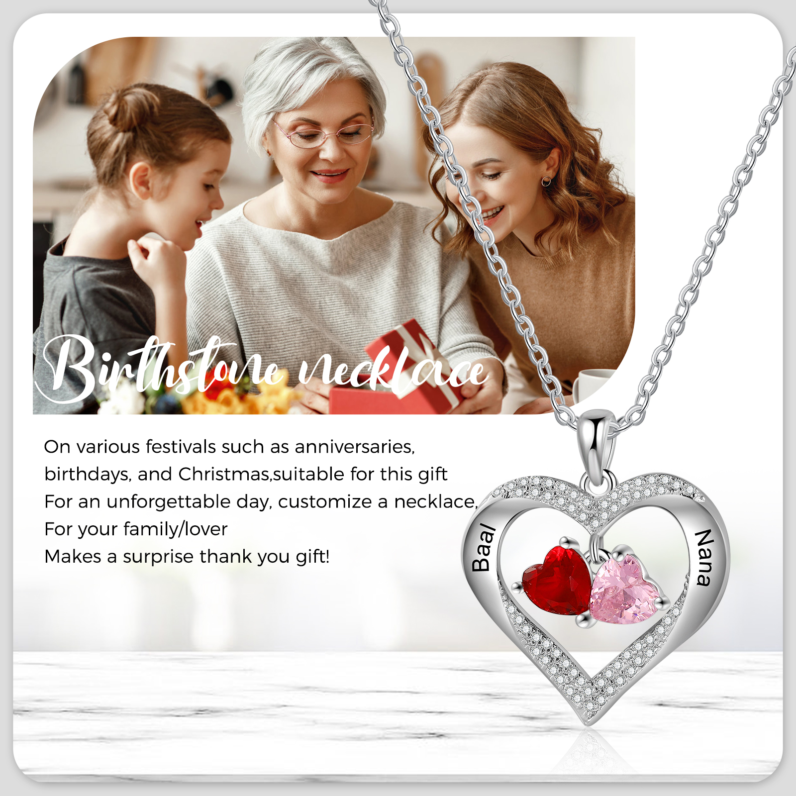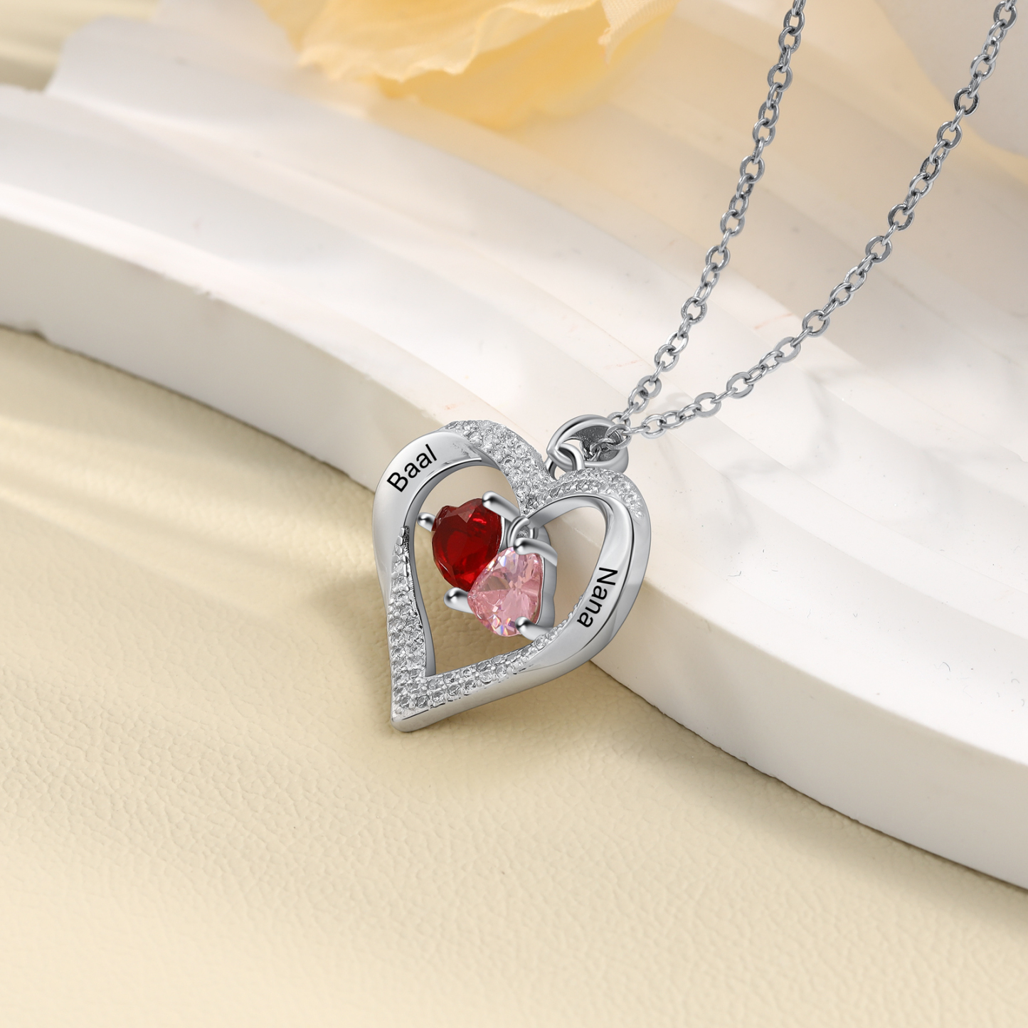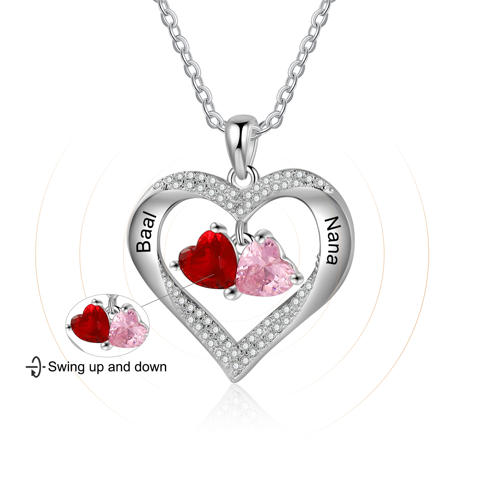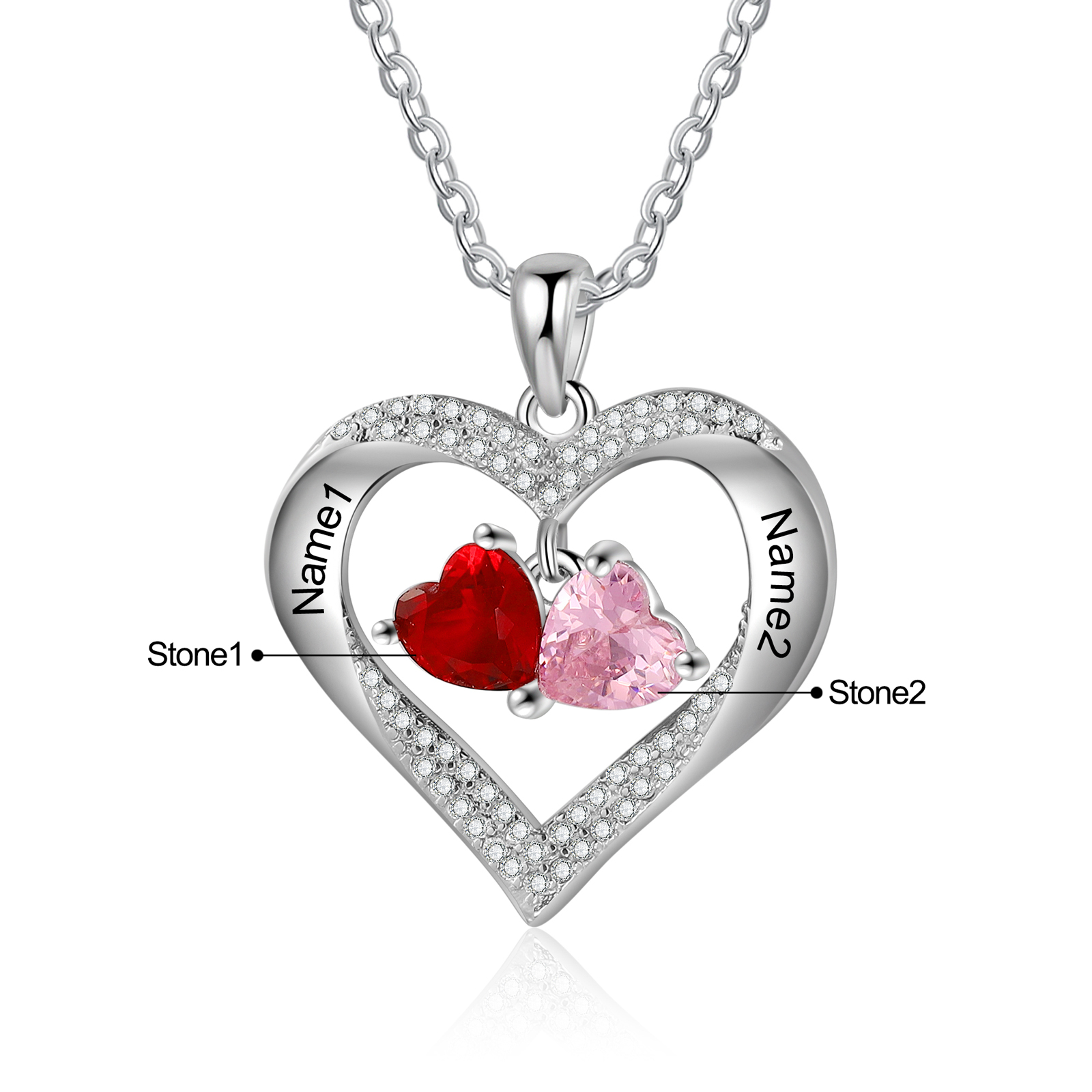 Collar para mujer de corazón de piedra danzante 2 nombres personalizados con 2 piedras de nacimiento