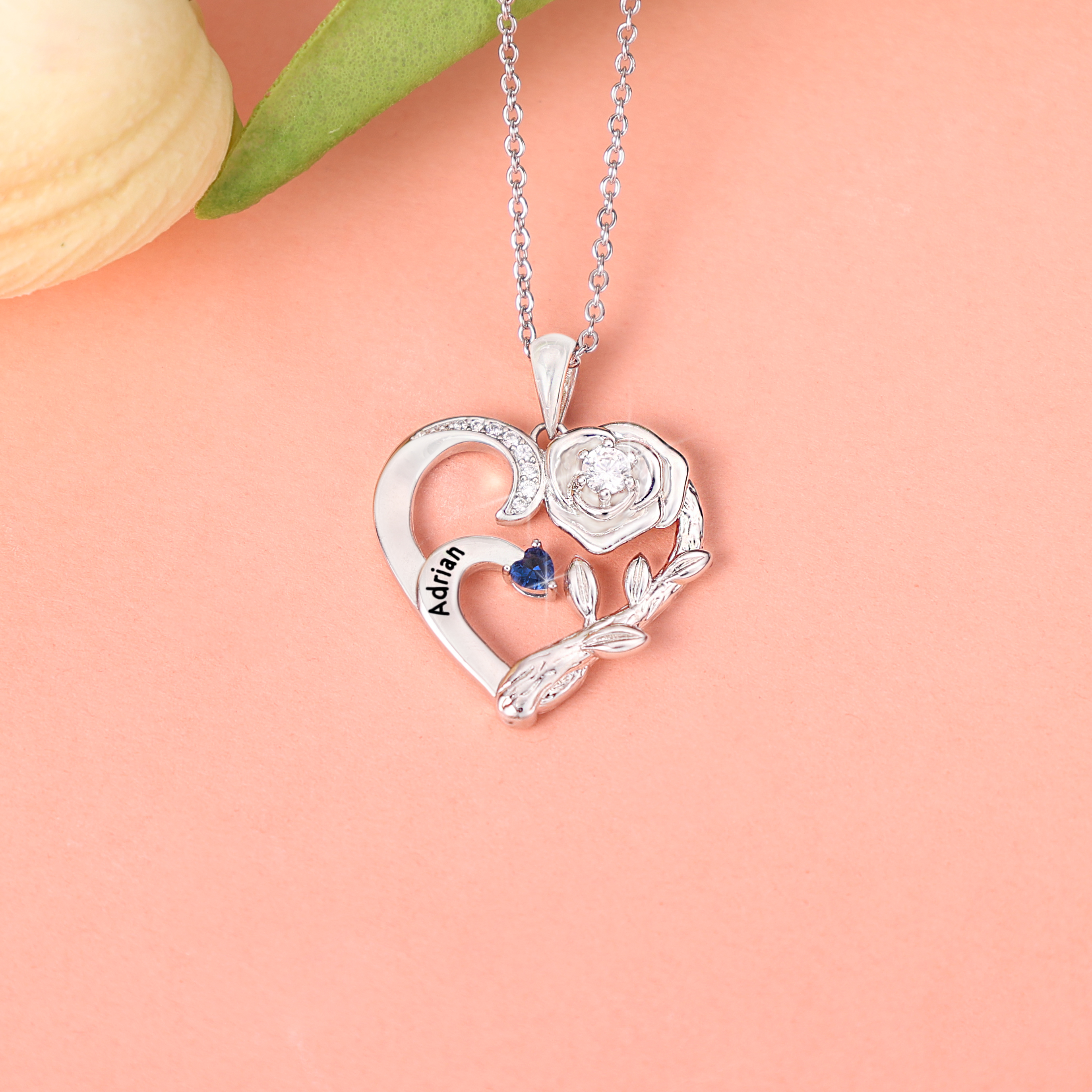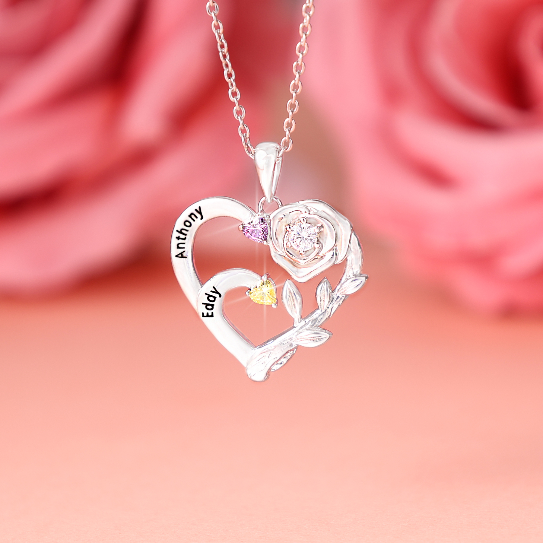 Collar para mujer de rosa 2 nombres personalizados con 2 piedras de nacimiento