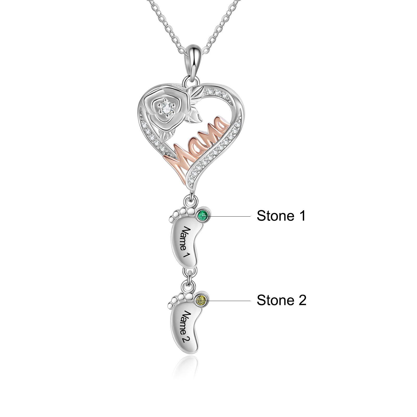 Collar a mamá "mama" pies de bebé 2 nombres personalizados con 2 piedras de nacimiento