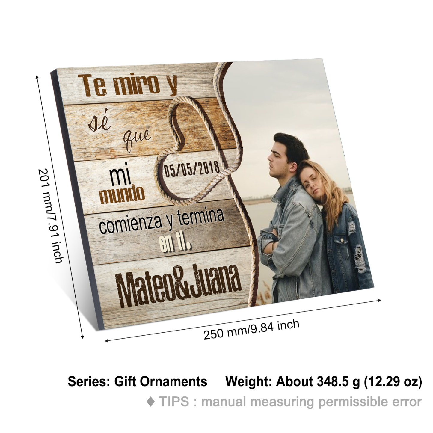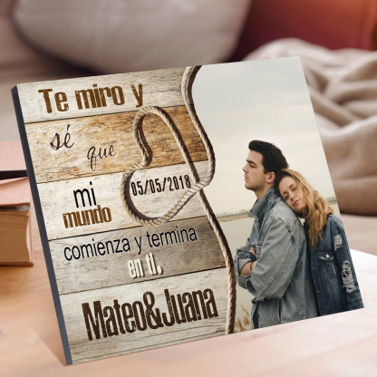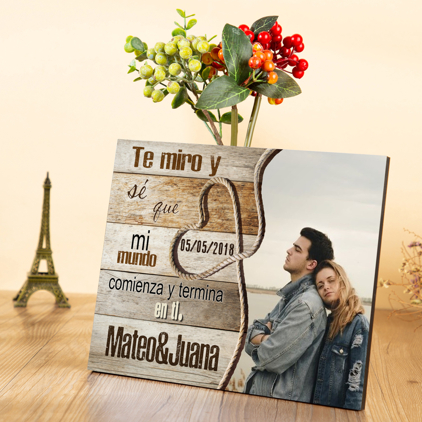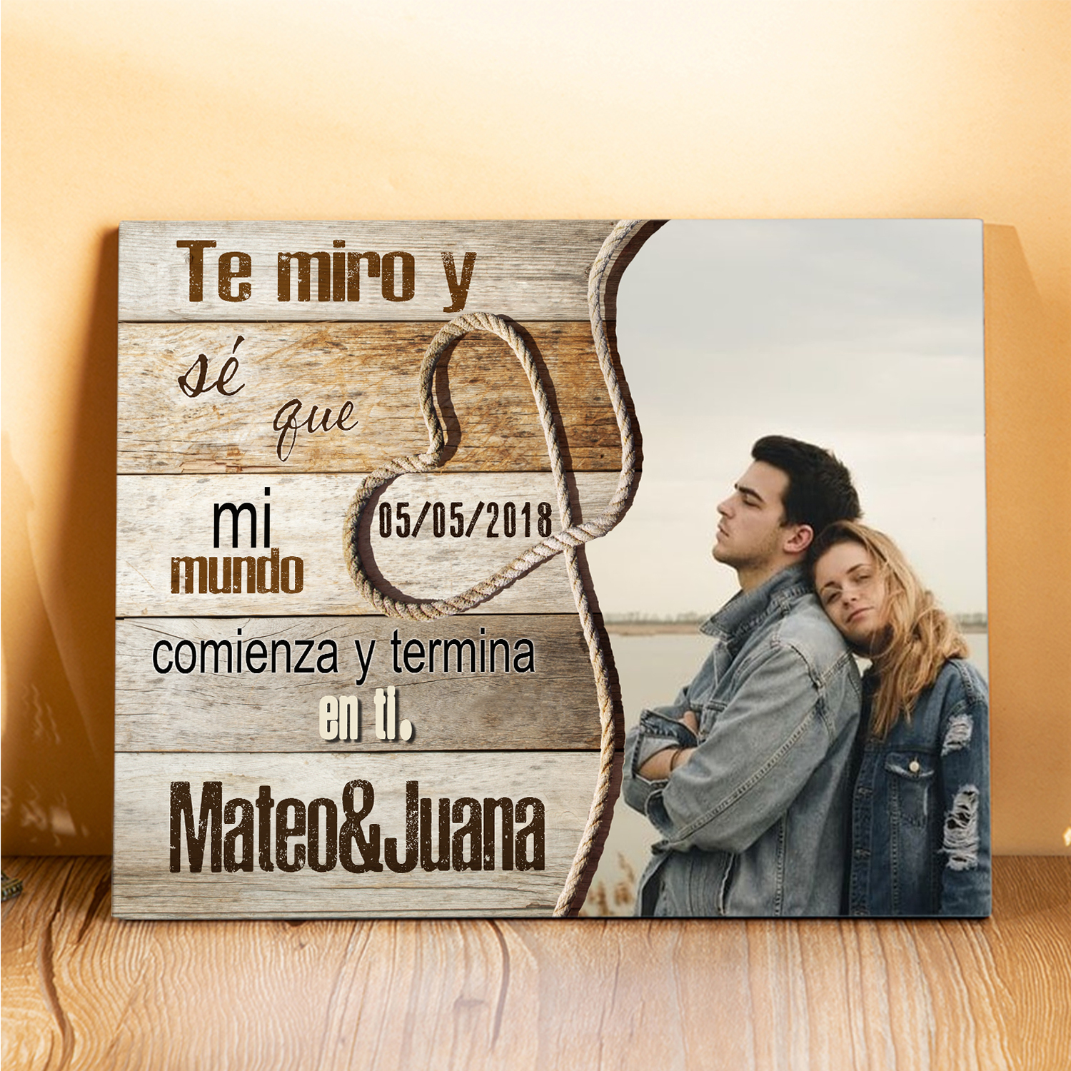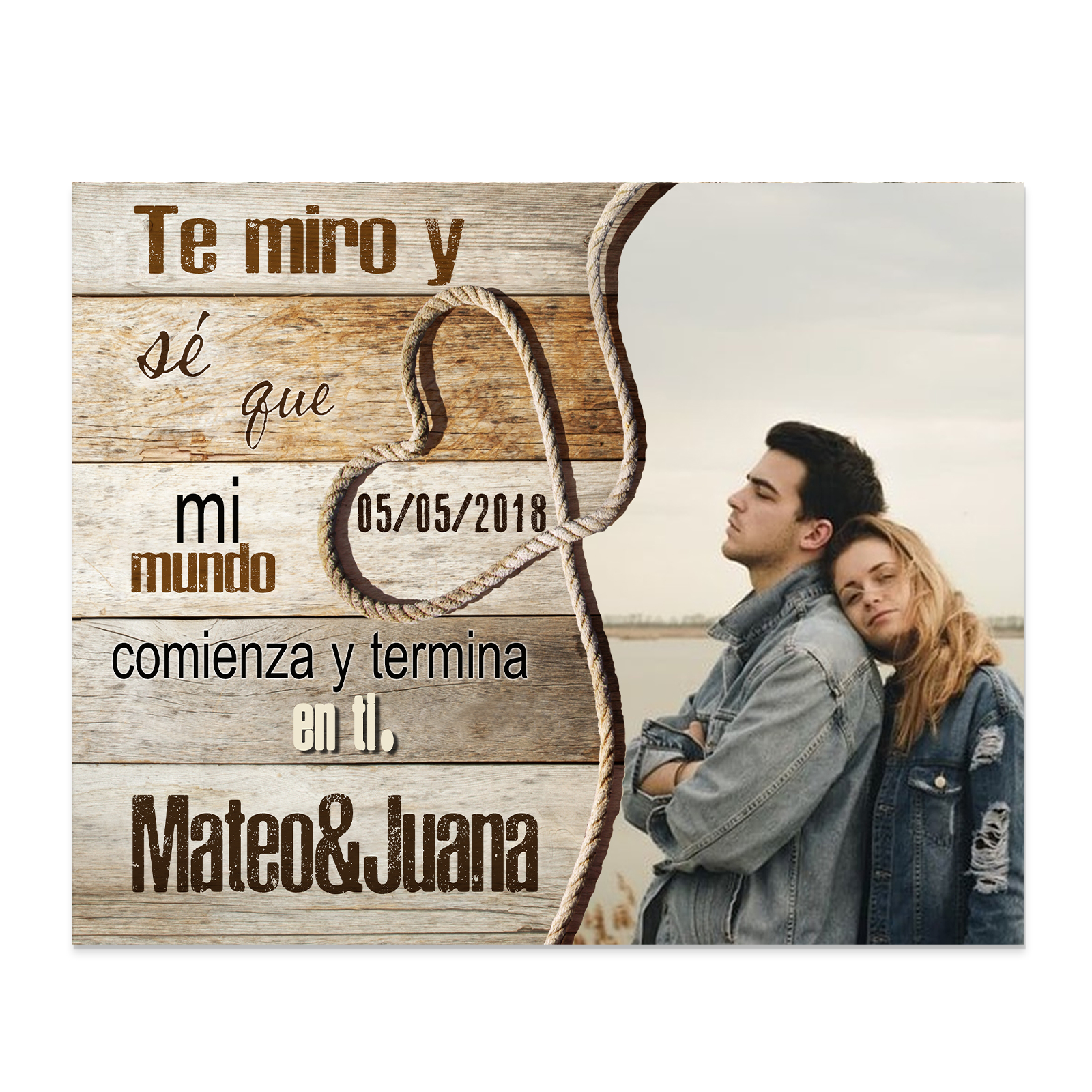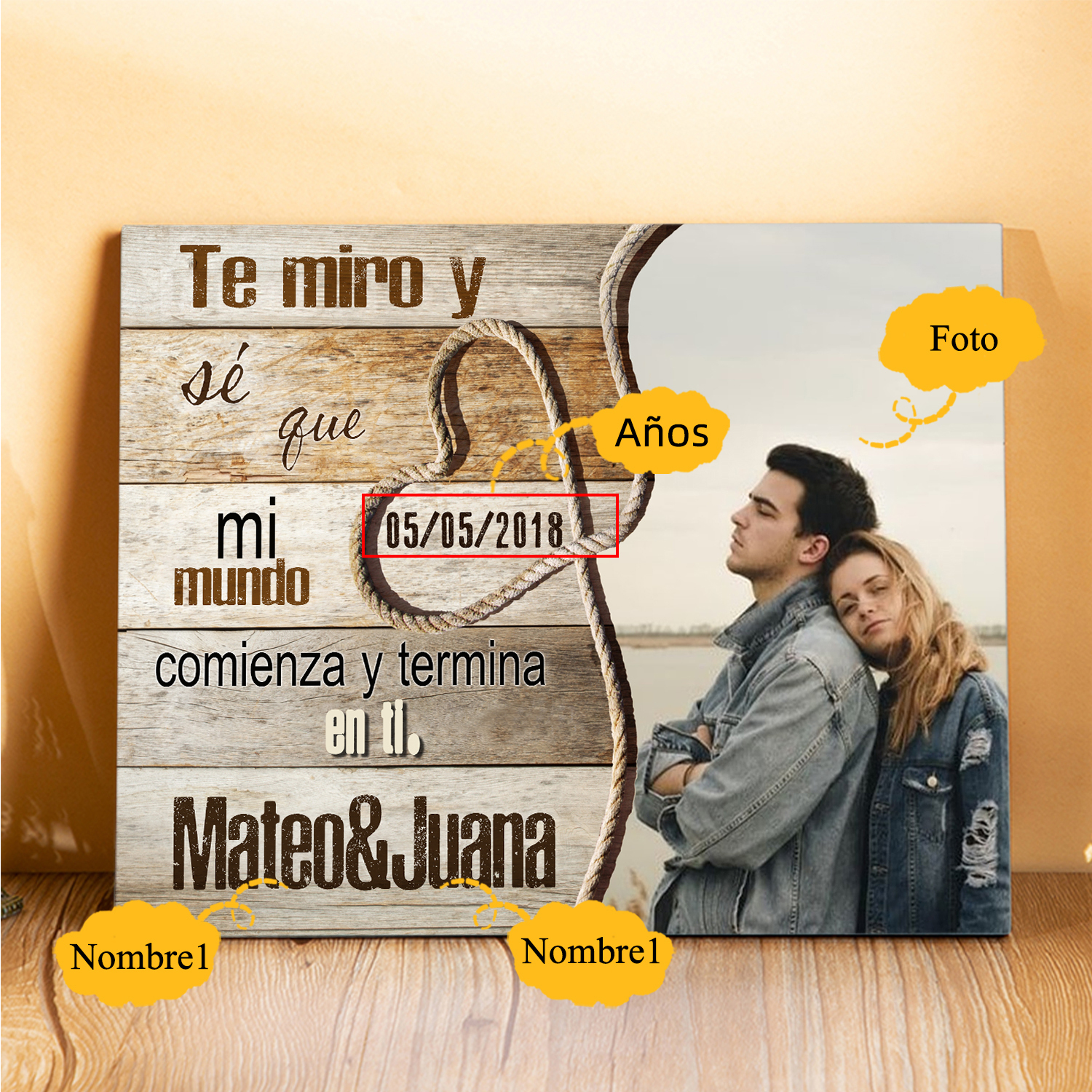 Lámina marco de madera para pareja 2 nombres personalizados con fecha y foto