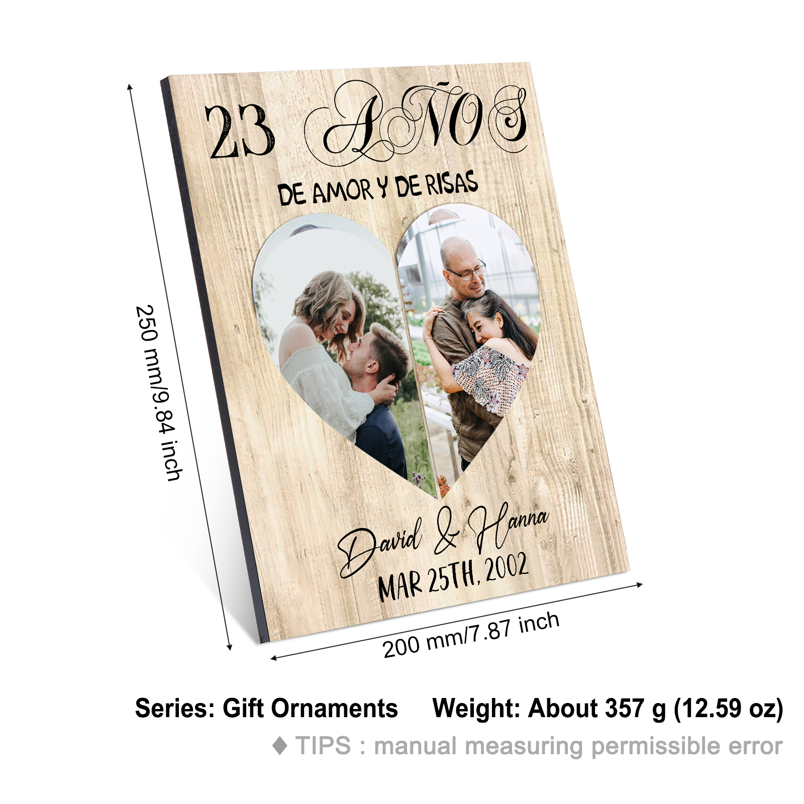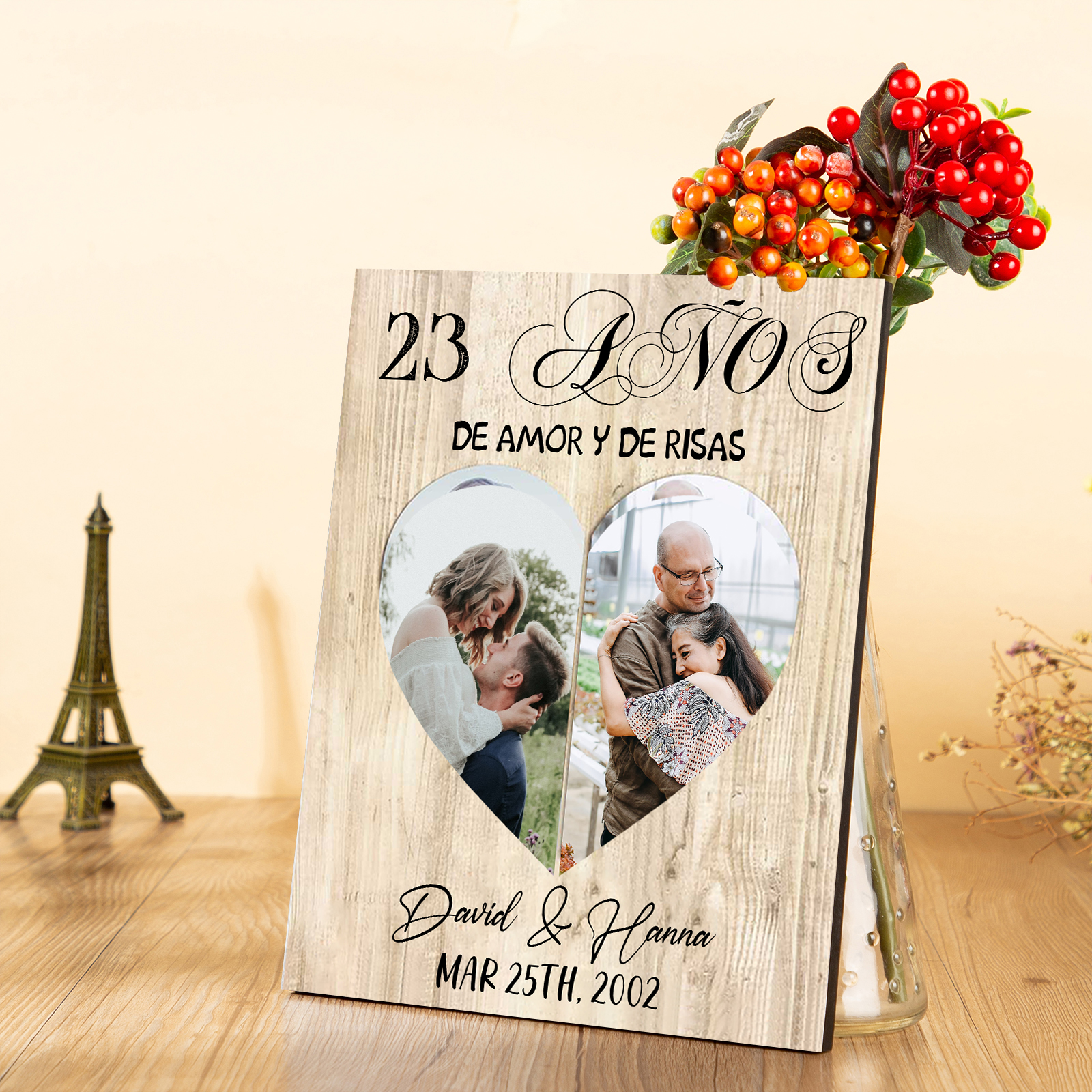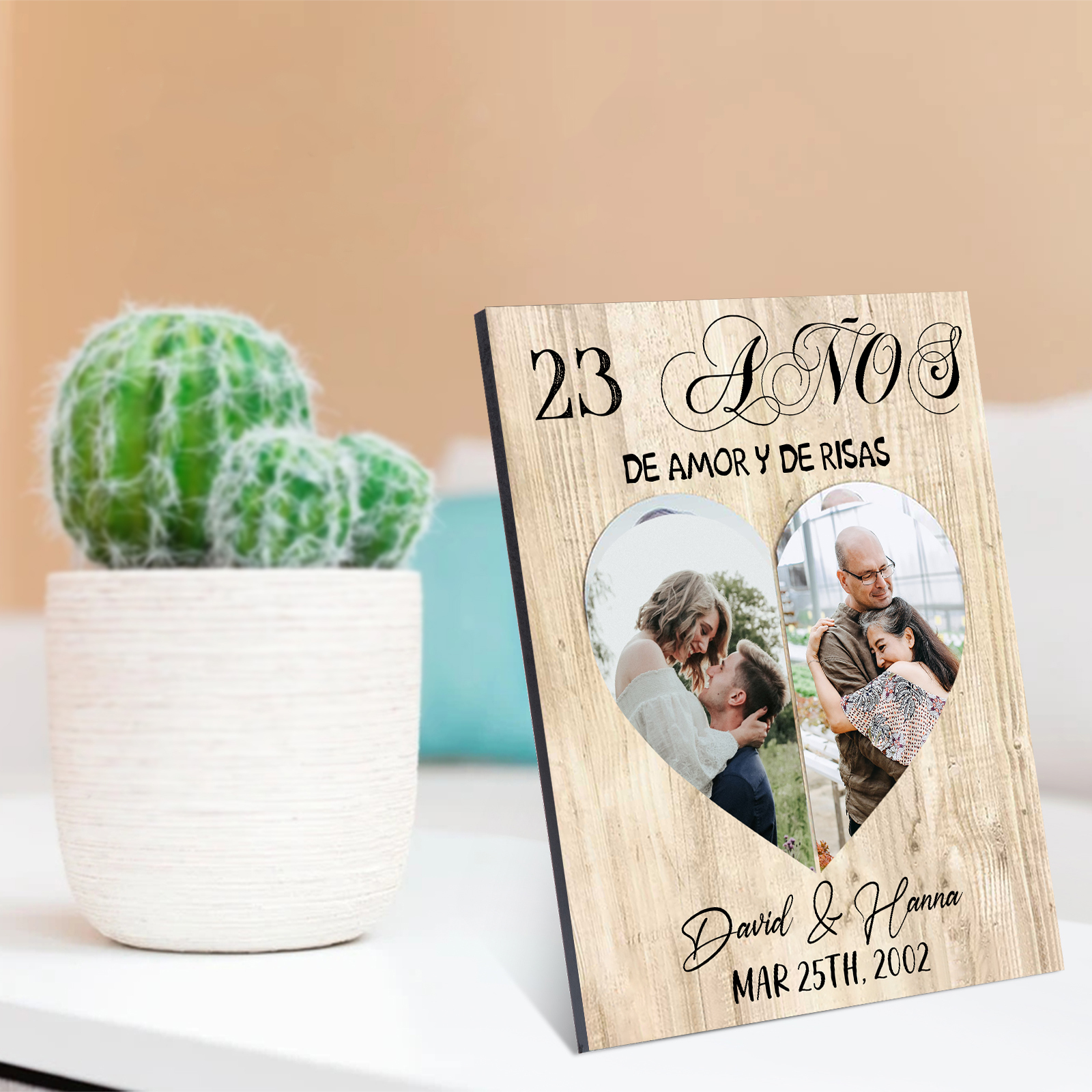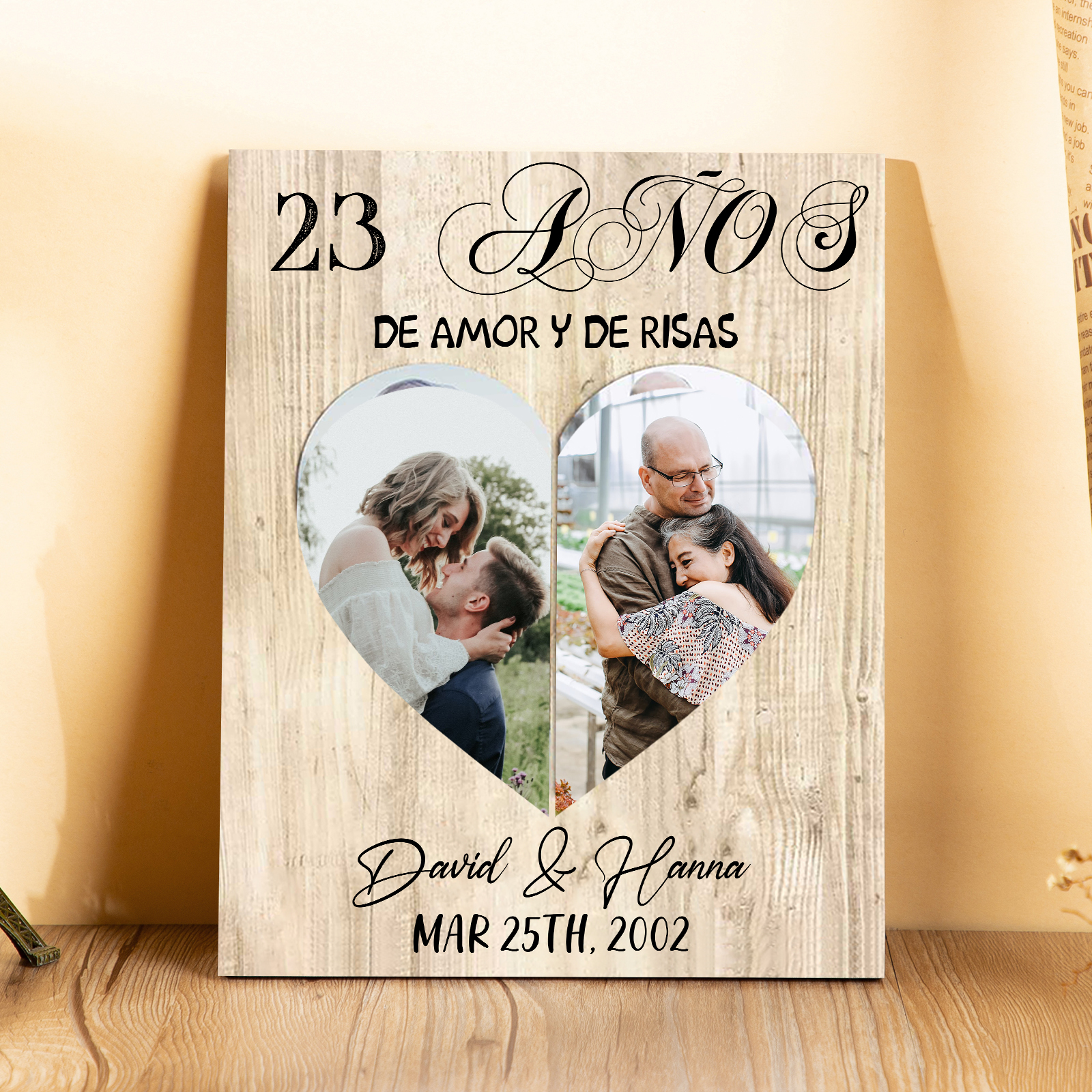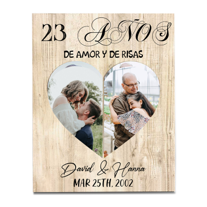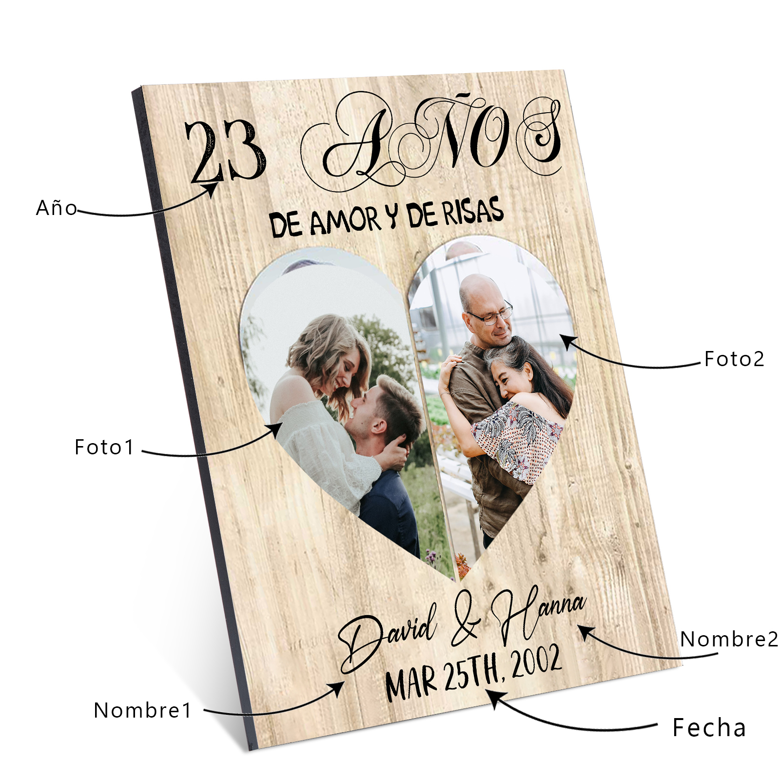 Lámina marco de madera para pareja 2 nombres y 2 fotos, regalo de aniversario