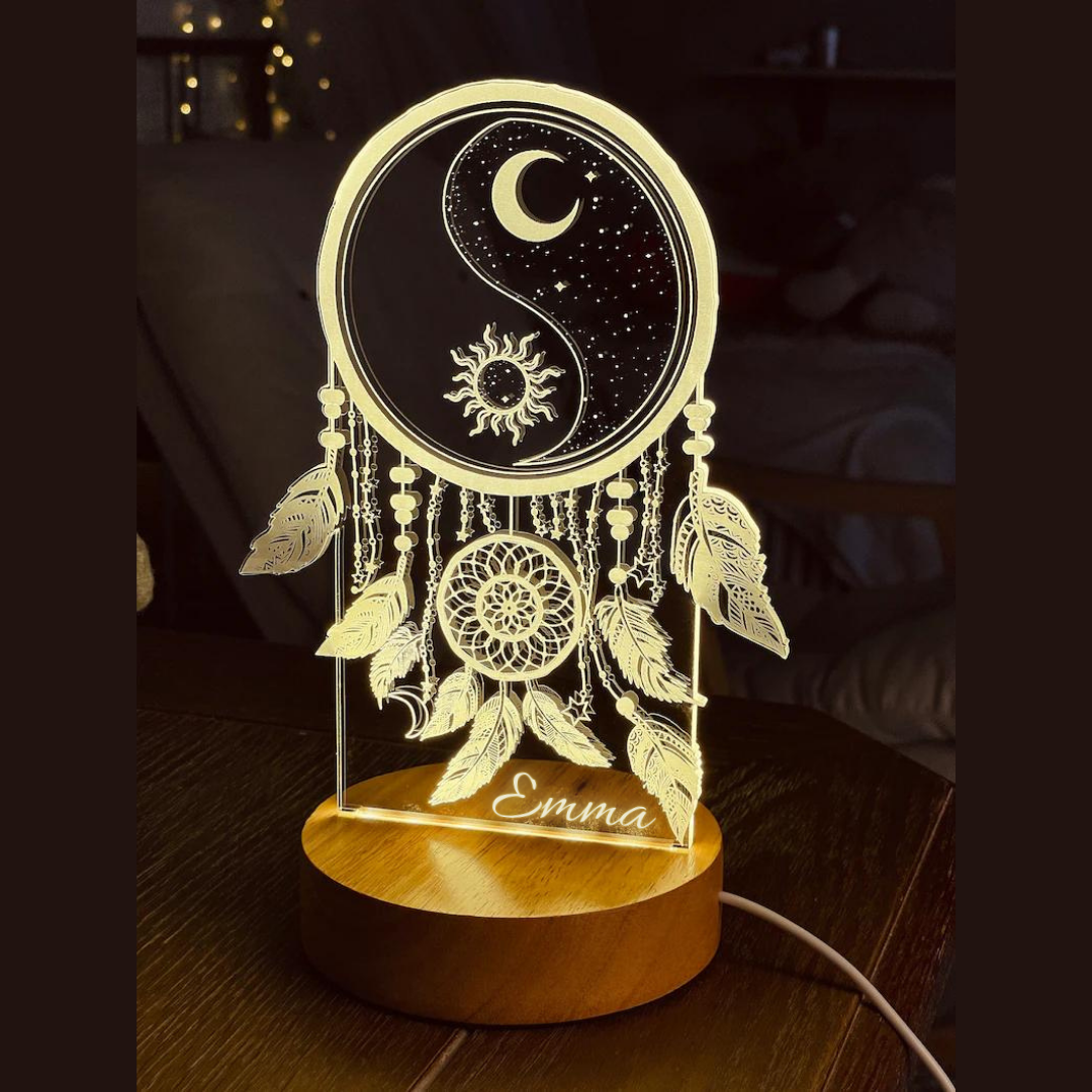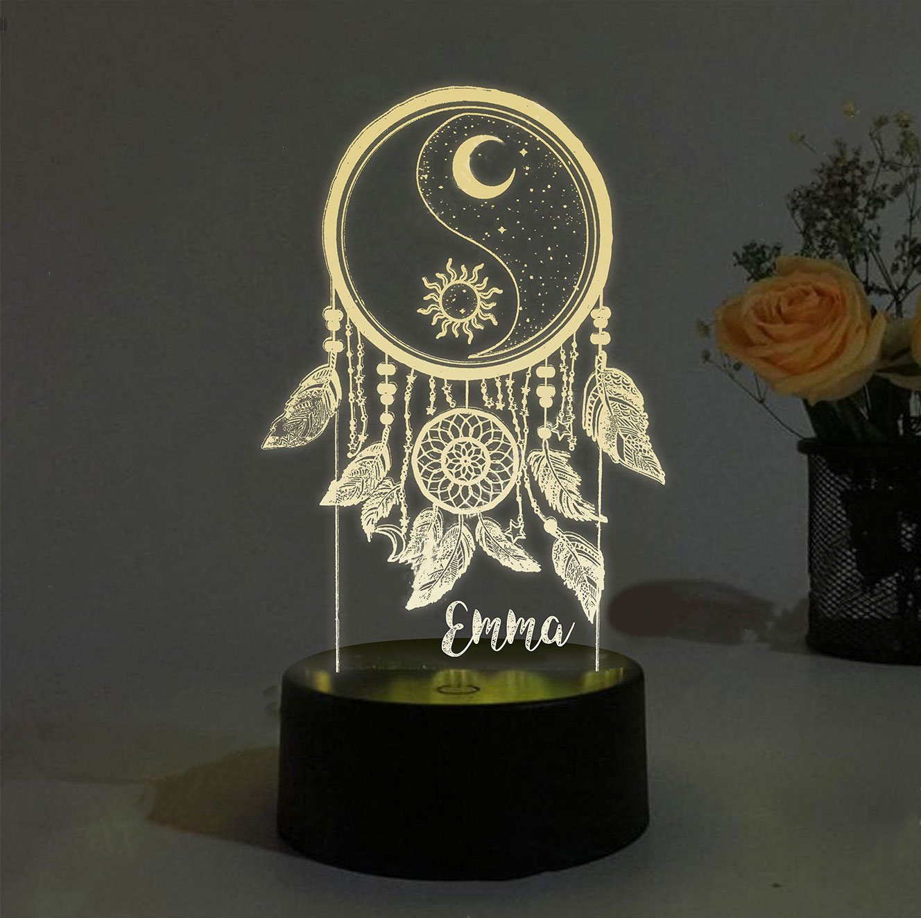 Una hermosa luz nocturna atrapasueños que se puede cambiar de color con cualquier nombre personalizado grabado en la parte inferior.