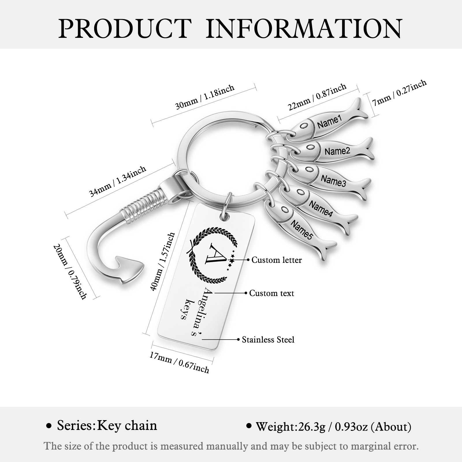 Llavero con colgantes de anzuelo y peces personalizados con 5 nombres, una letra y un texto