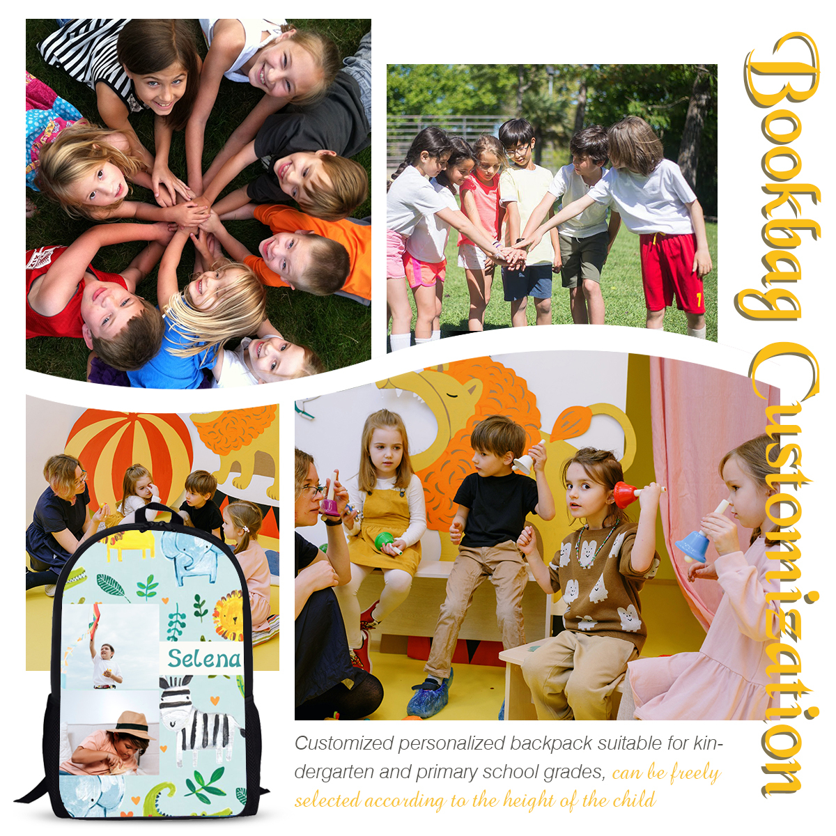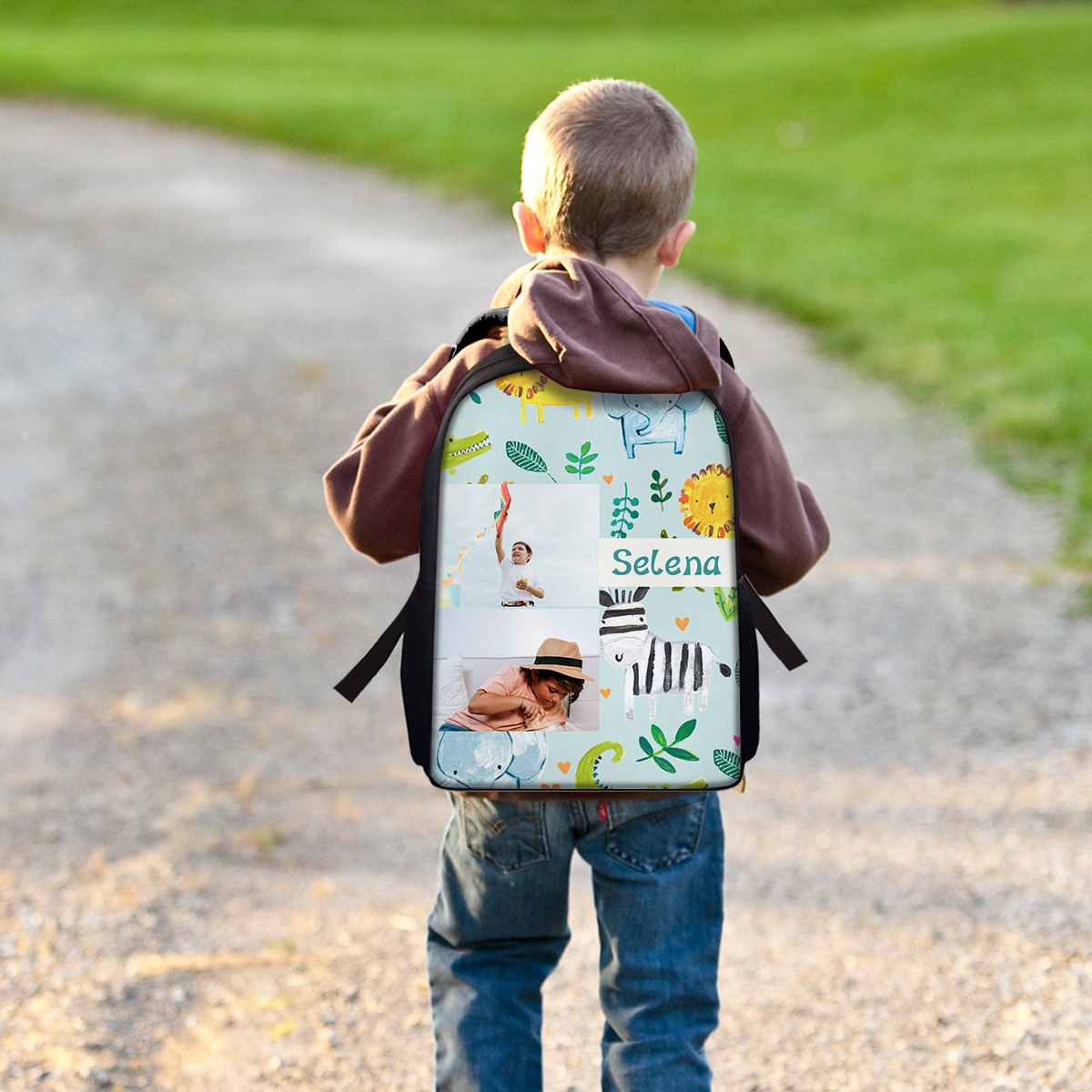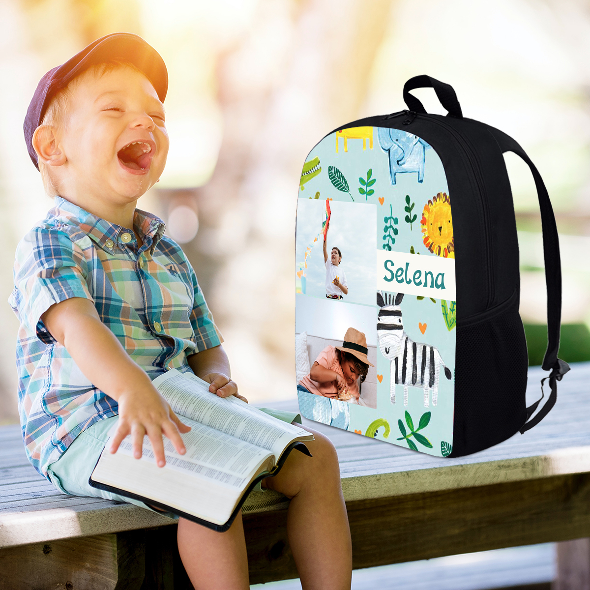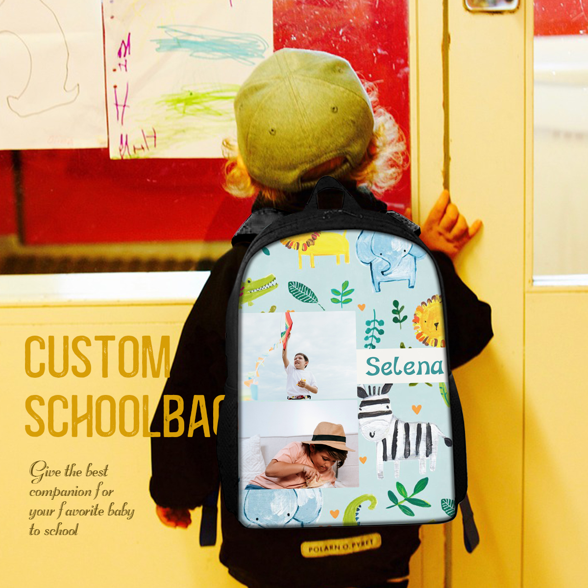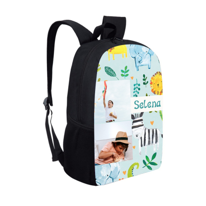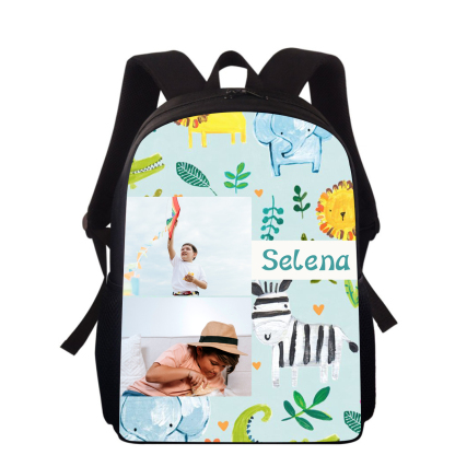 Mochilas-mochila escolar para los niños con un dibujo pintoresco con nombre personalizado con 2 fotos