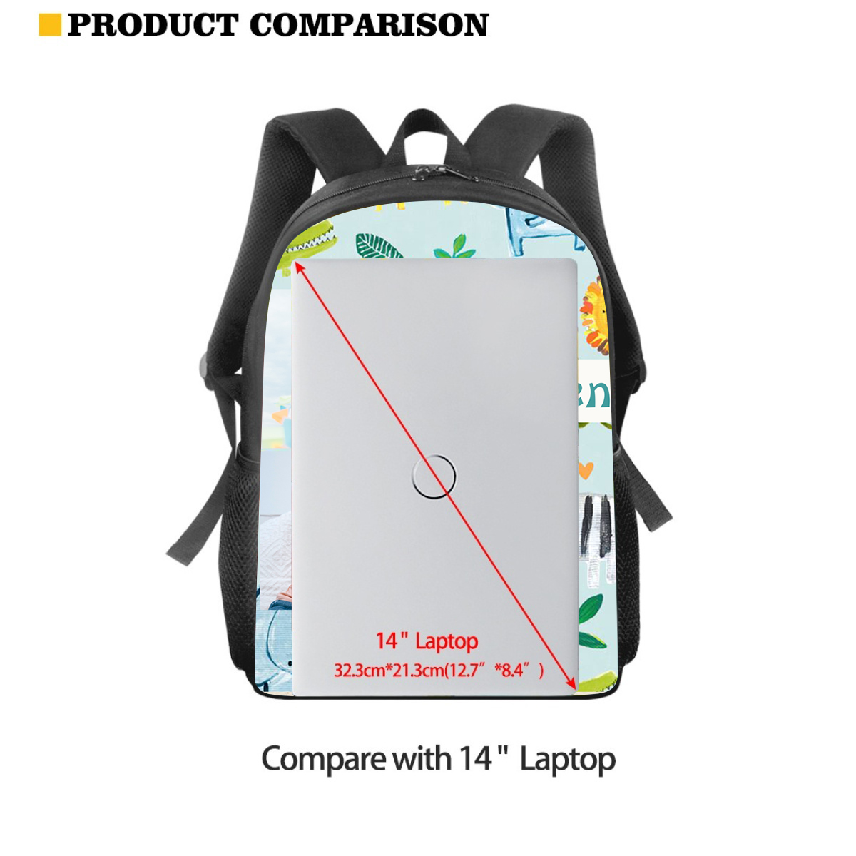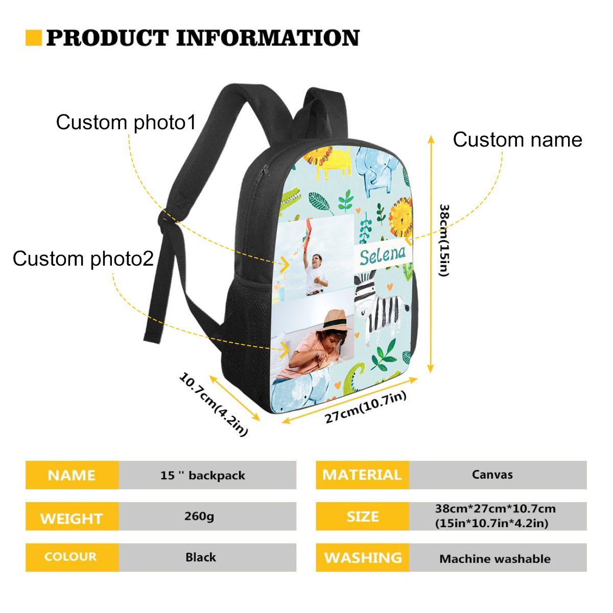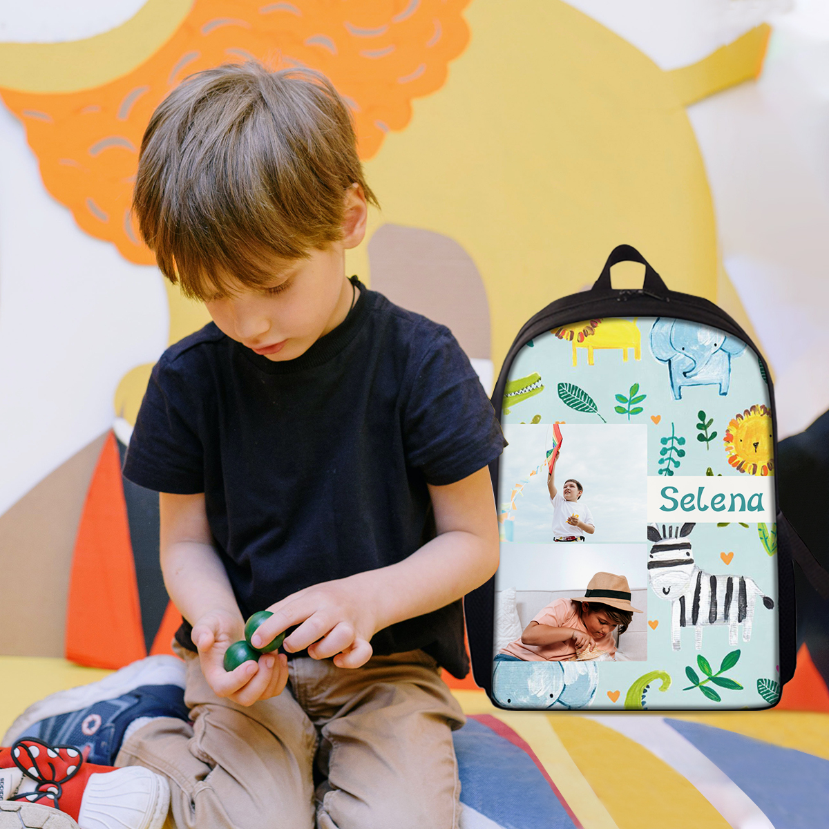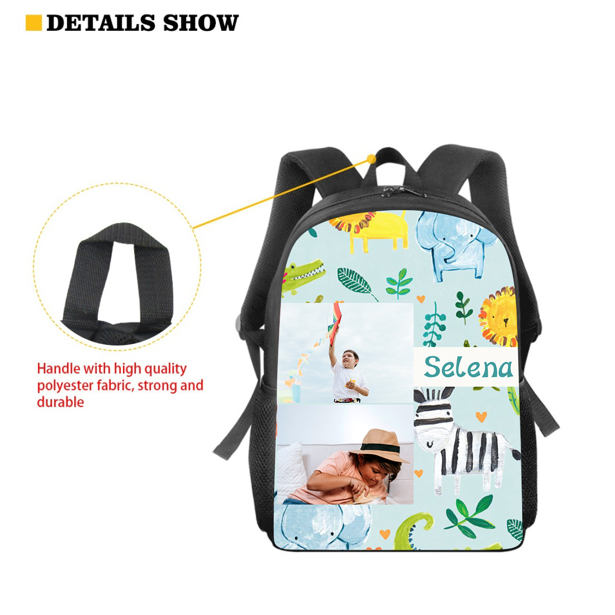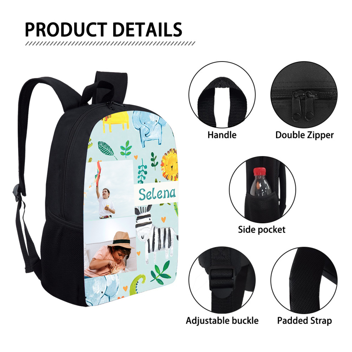 Mochilas-mochila escolar para los niños con un dibujo pintoresco con nombre personalizado con 2 fotos