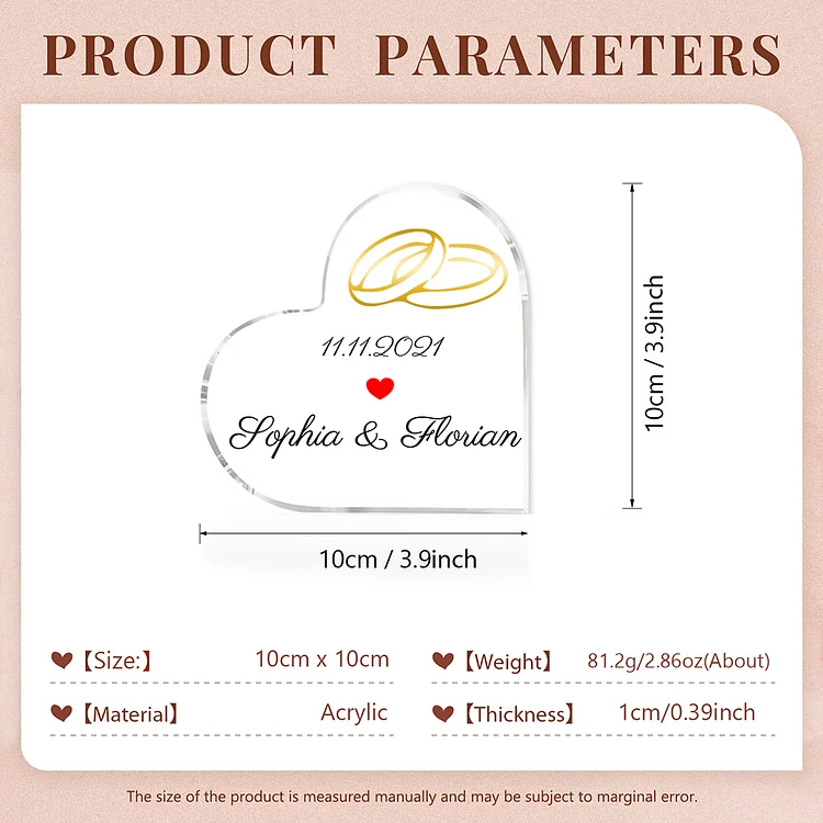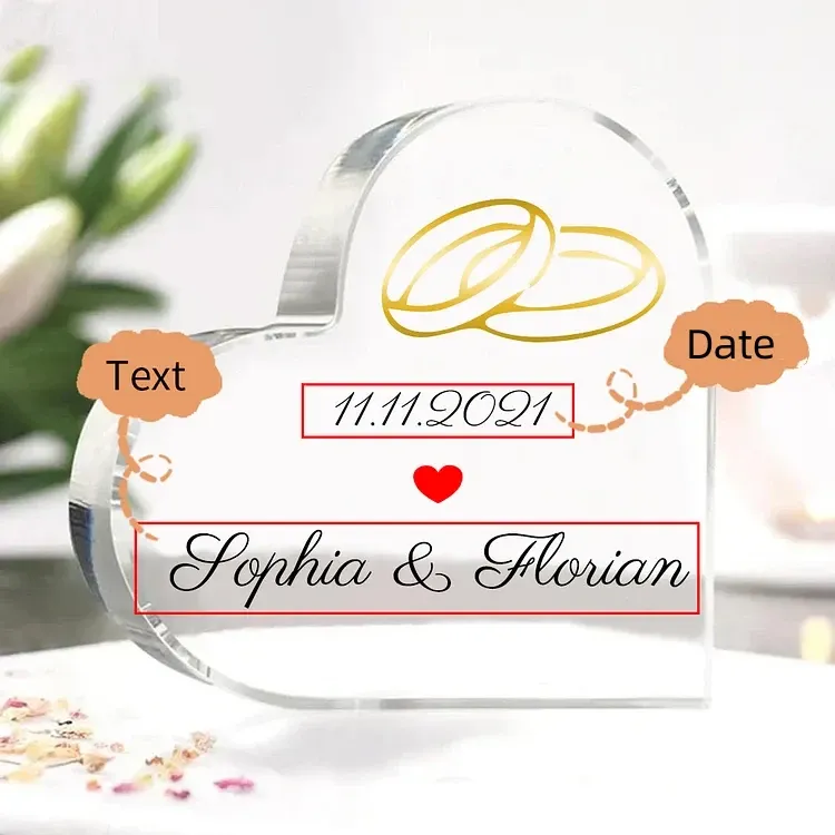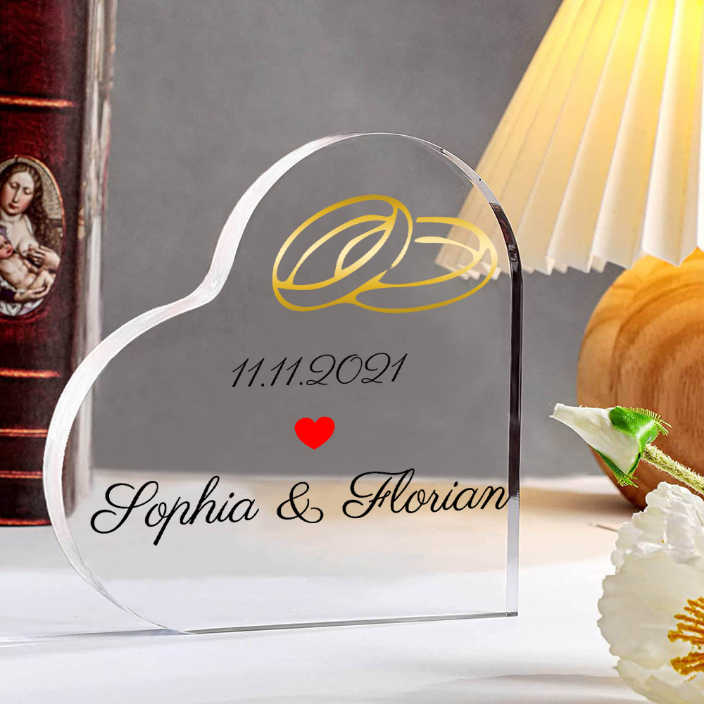 Placa de acrílico en forma de corazón Anillos con 1 texto personalizado con fecha