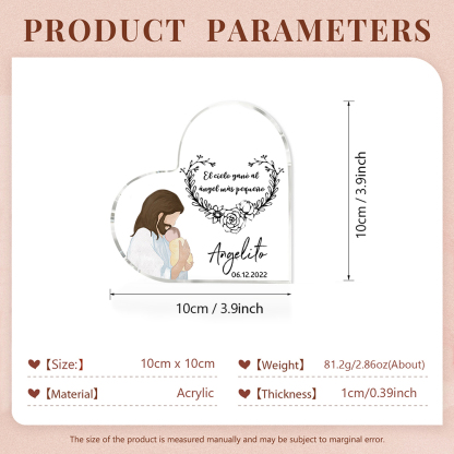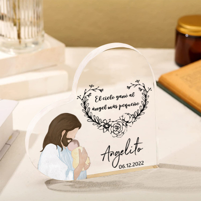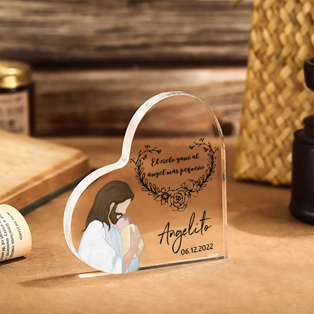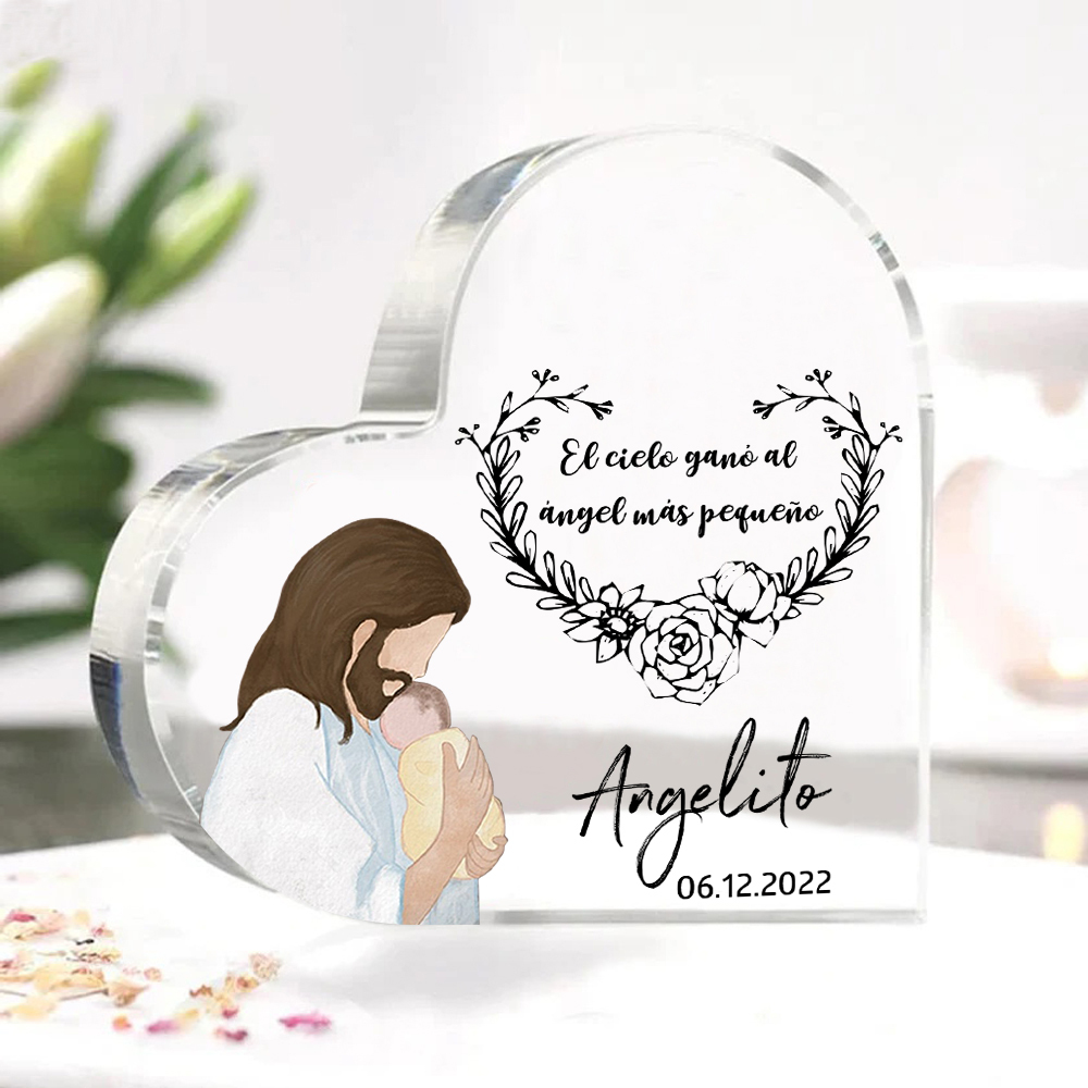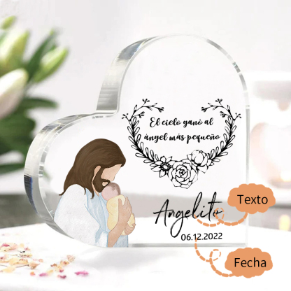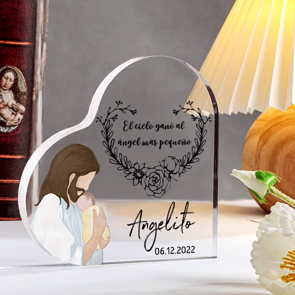Placa de acrílico en forma de corazón con 1 nombre y fecha personalizados para conmemoración a "angelito"