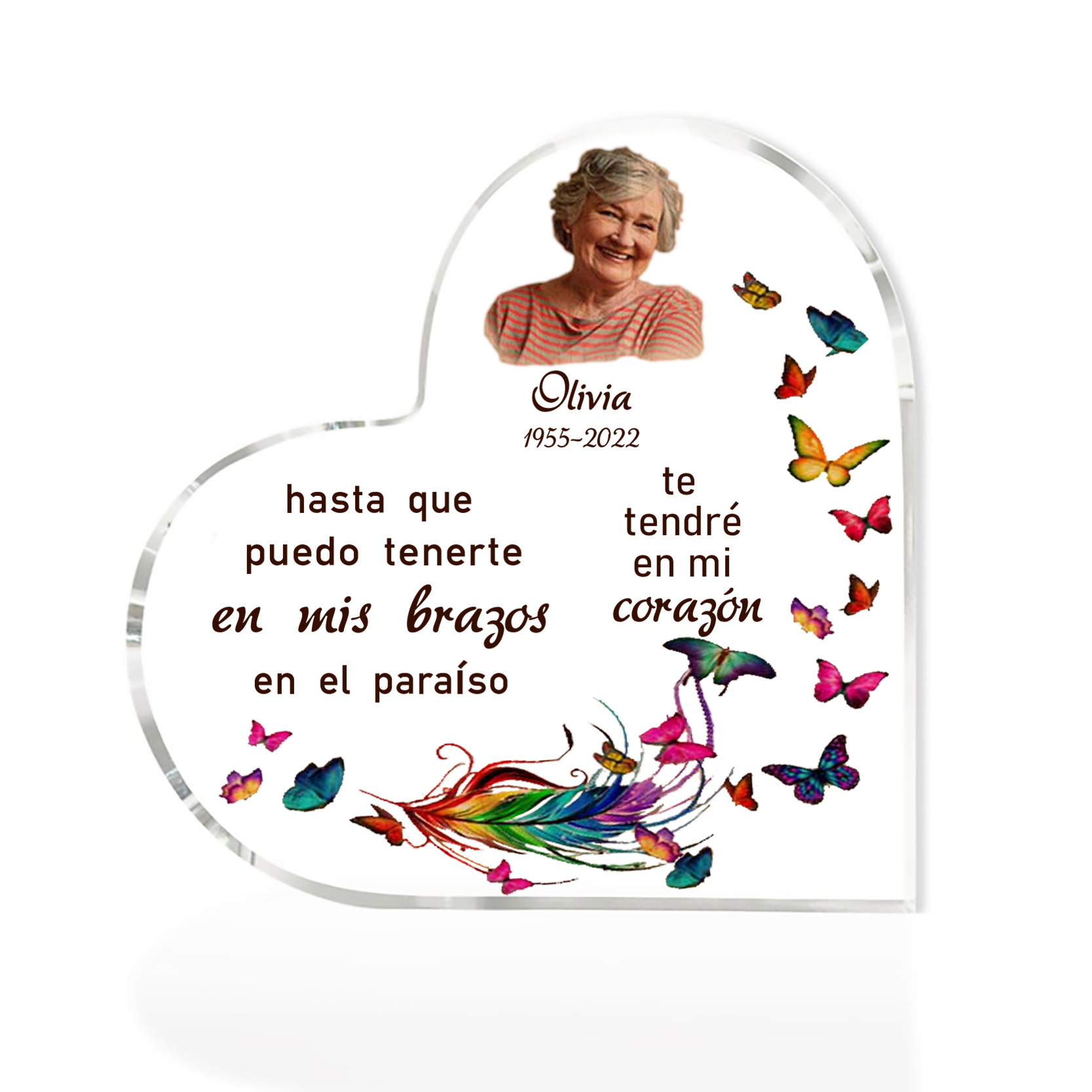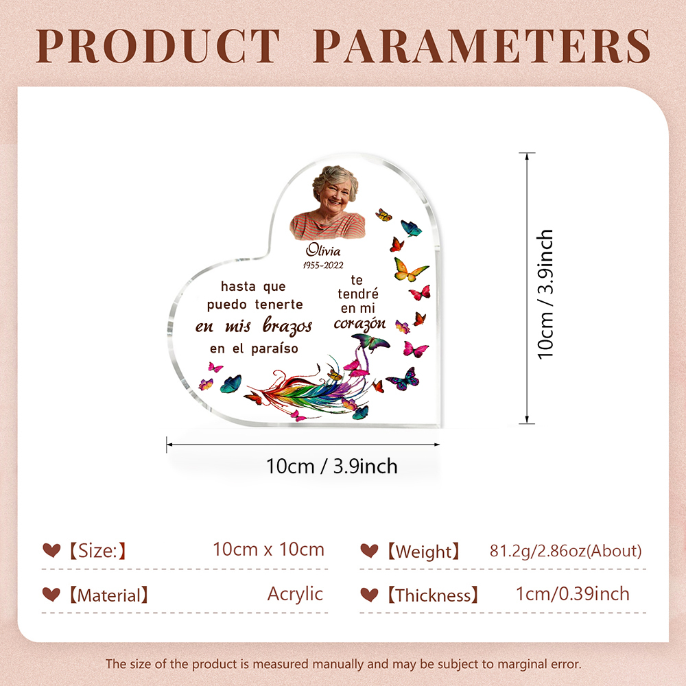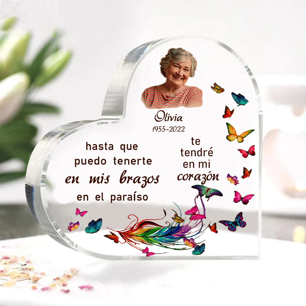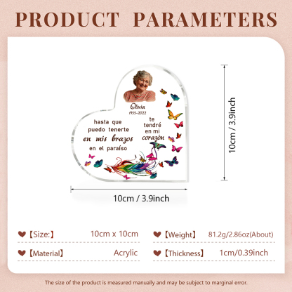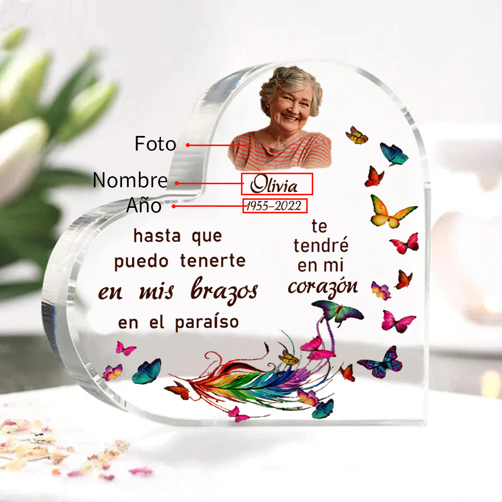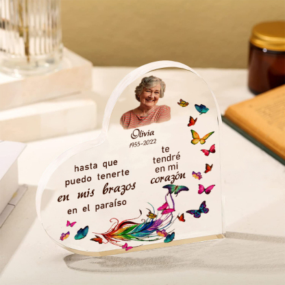 Placa de acrílico en forma de corazón con 1 texto, foto y nombre personalizados para conmemoración