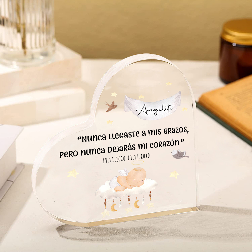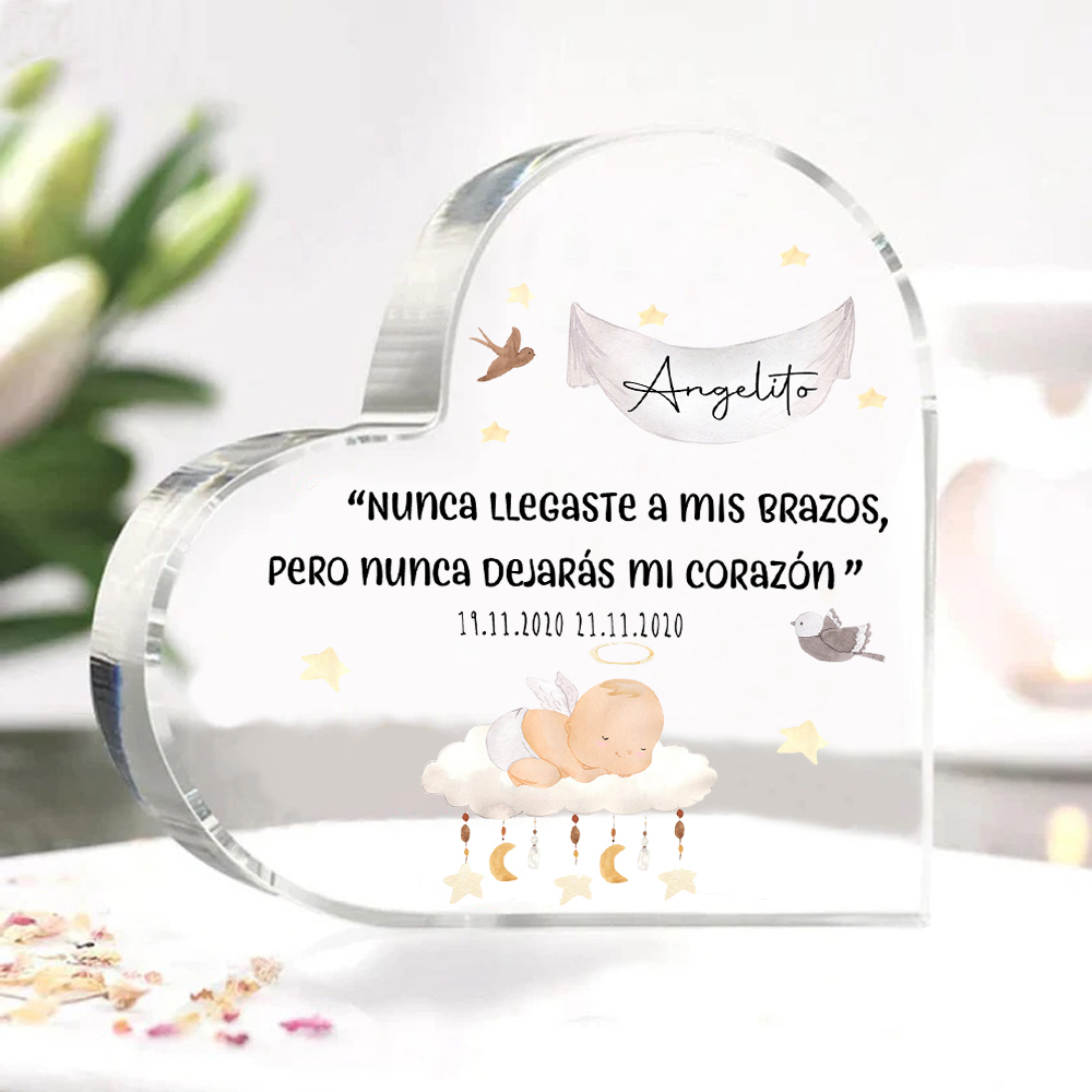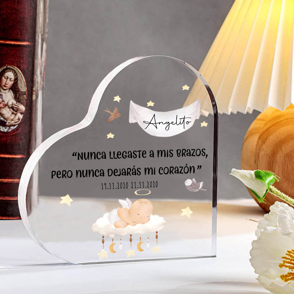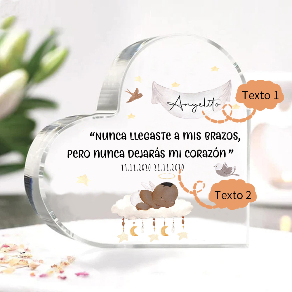 Placa de acrílico en forma de corazón con 2 textos personalizados para conmemoración a "angelito"
