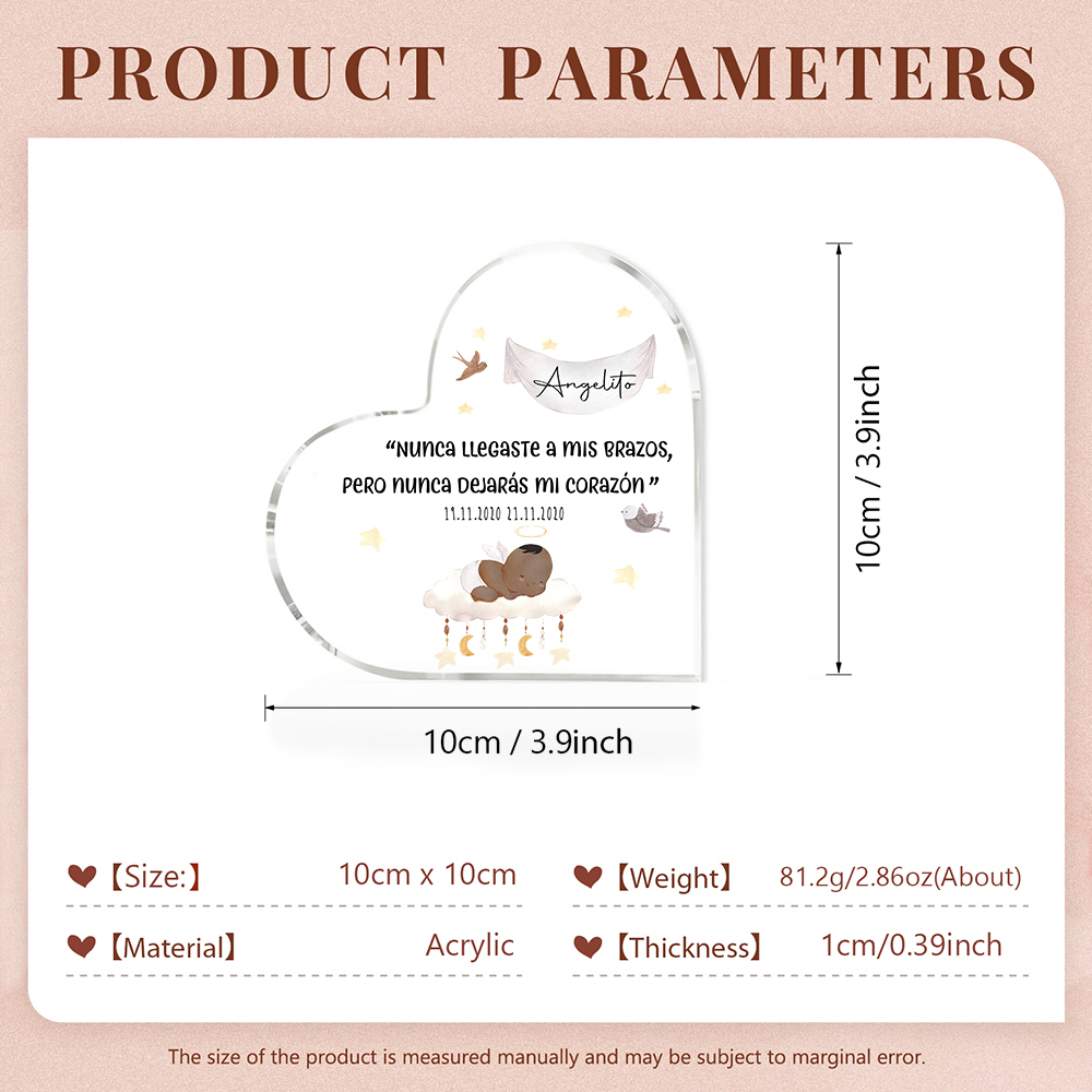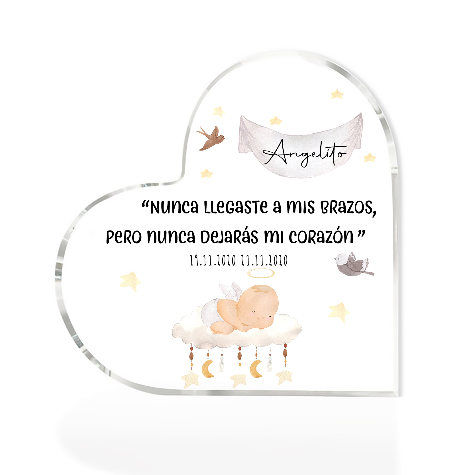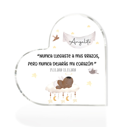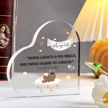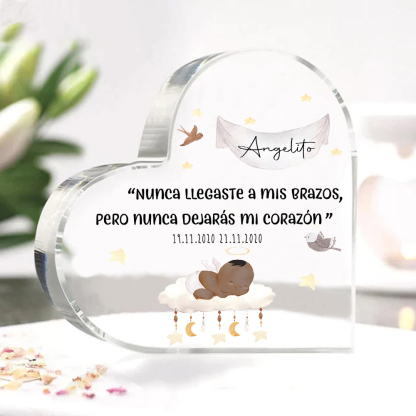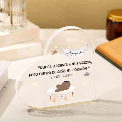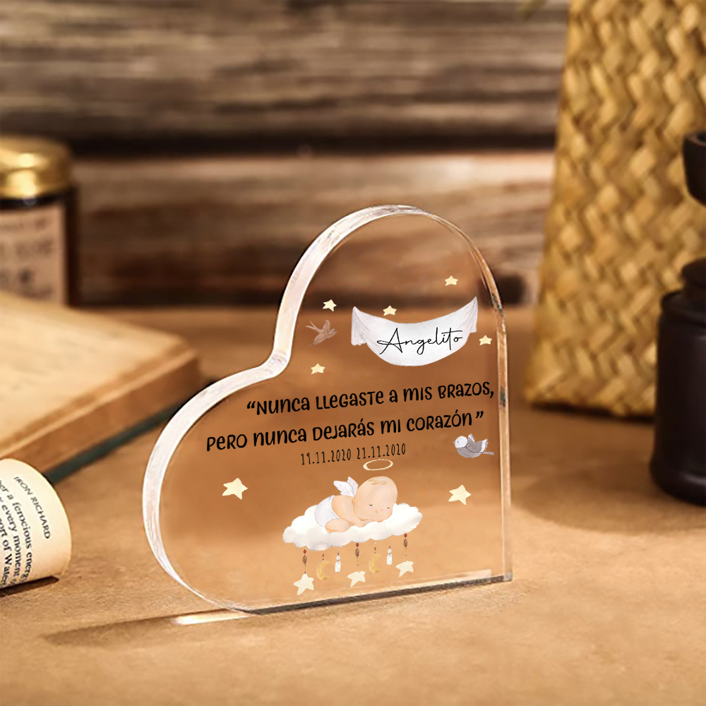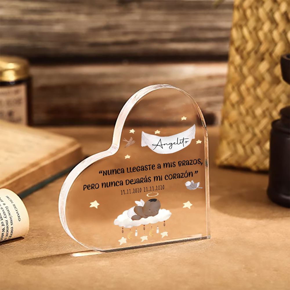 Placa de acrílico en forma de corazón con 2 textos personalizados para conmemoración a "angelito"