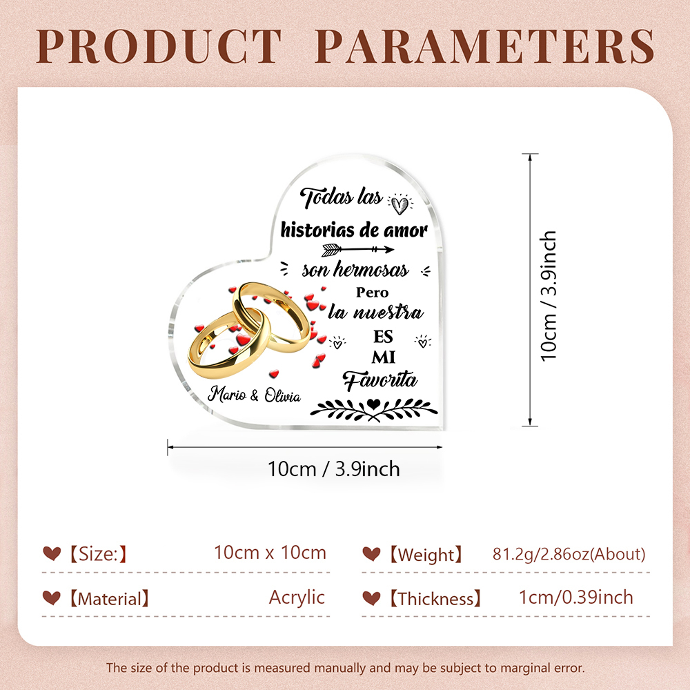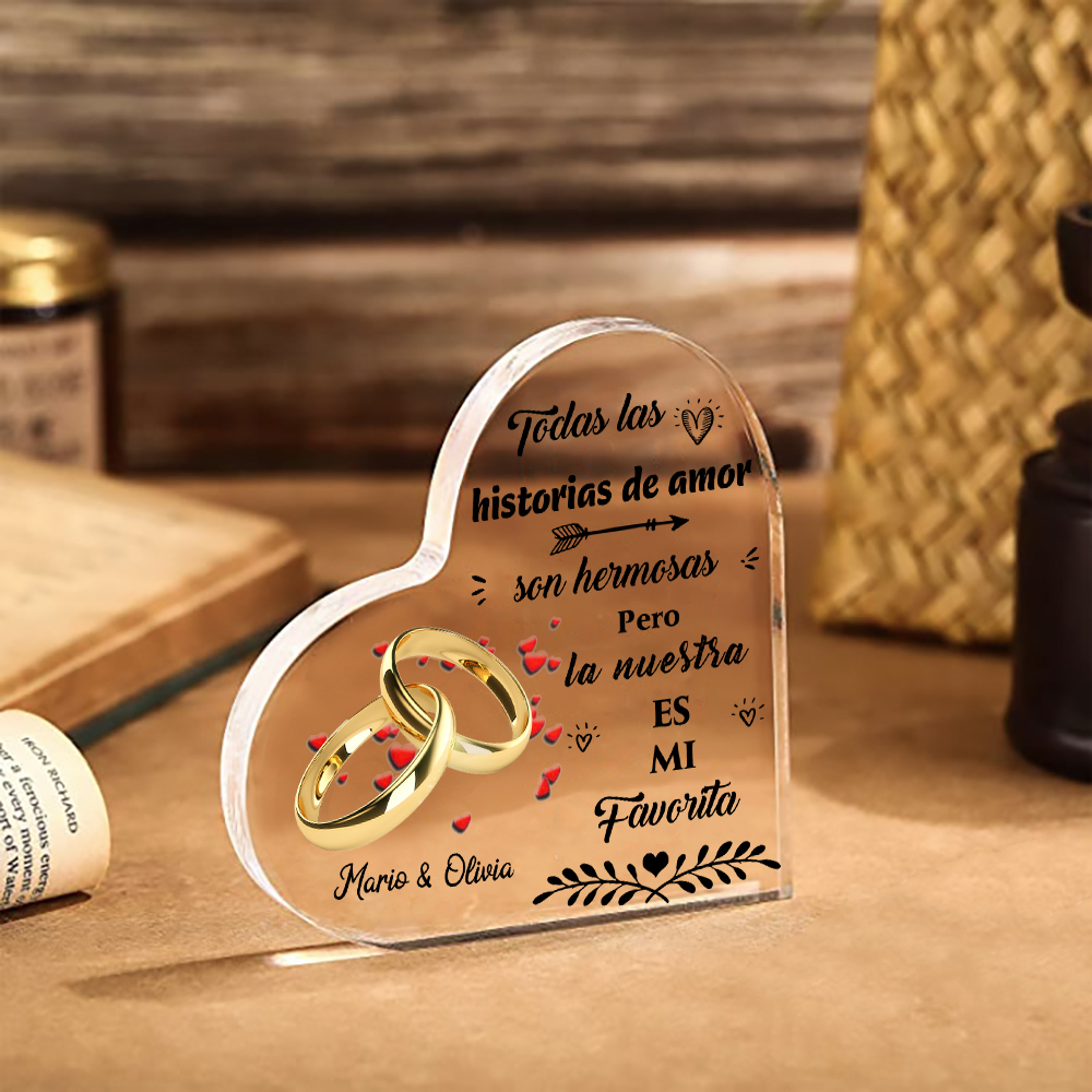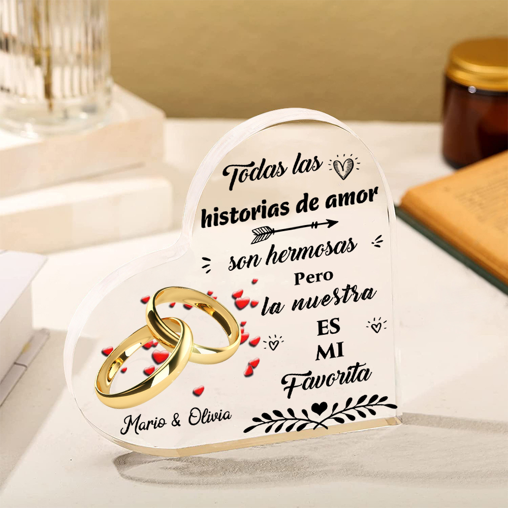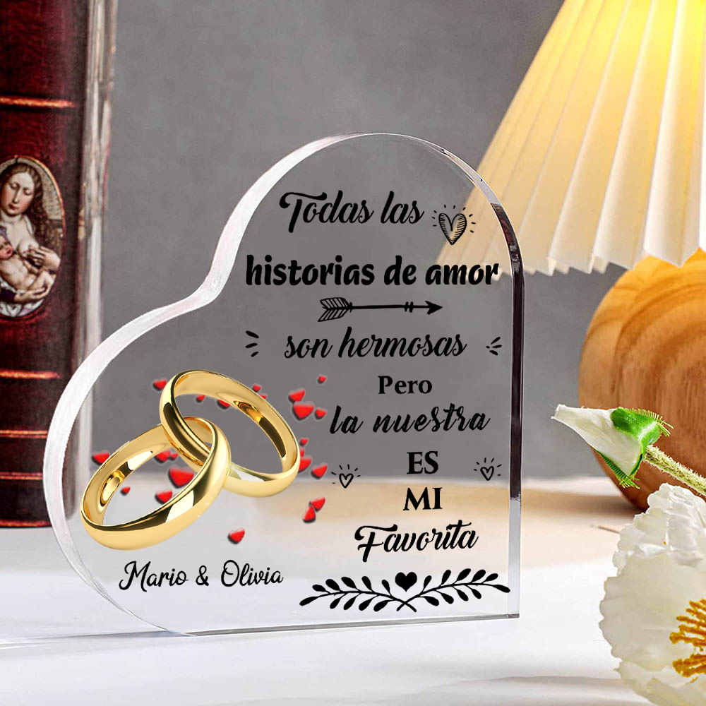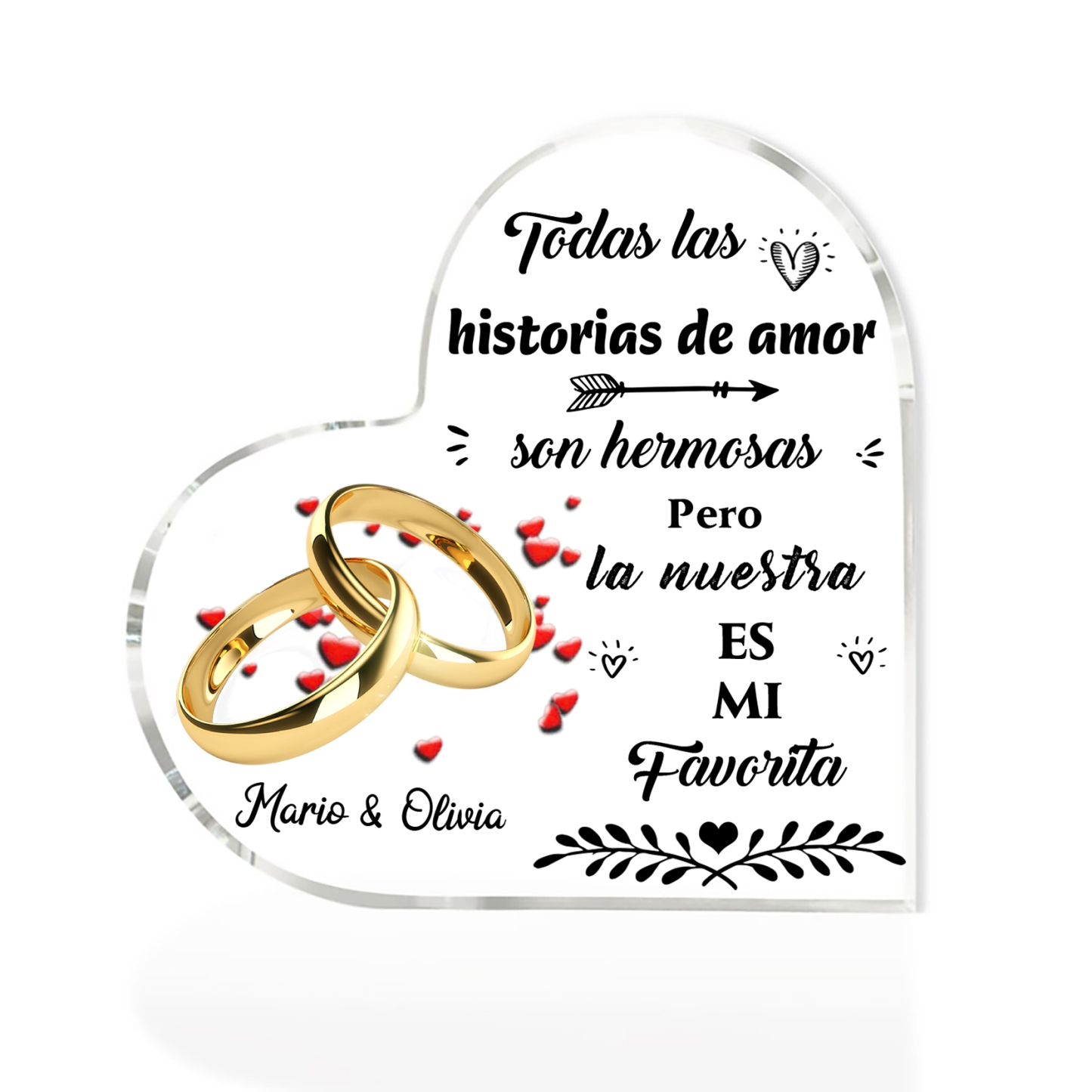 Placa de acrílico en forma de corazón con anillos con 2 nombres personalizados