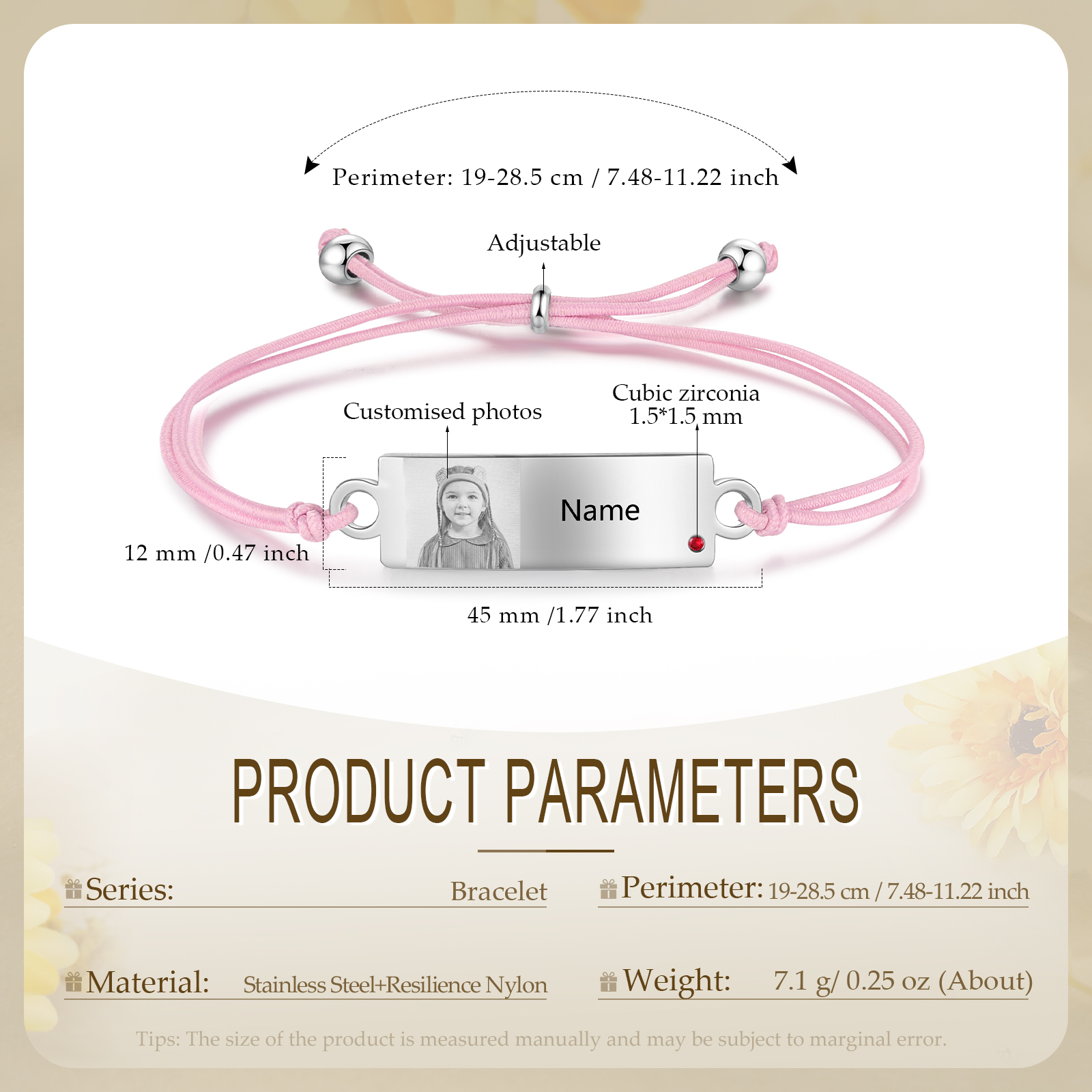 Pulsera ajustable con placa de 1 nombre, piedra de nacimiento y foto personalizados para niña, niño