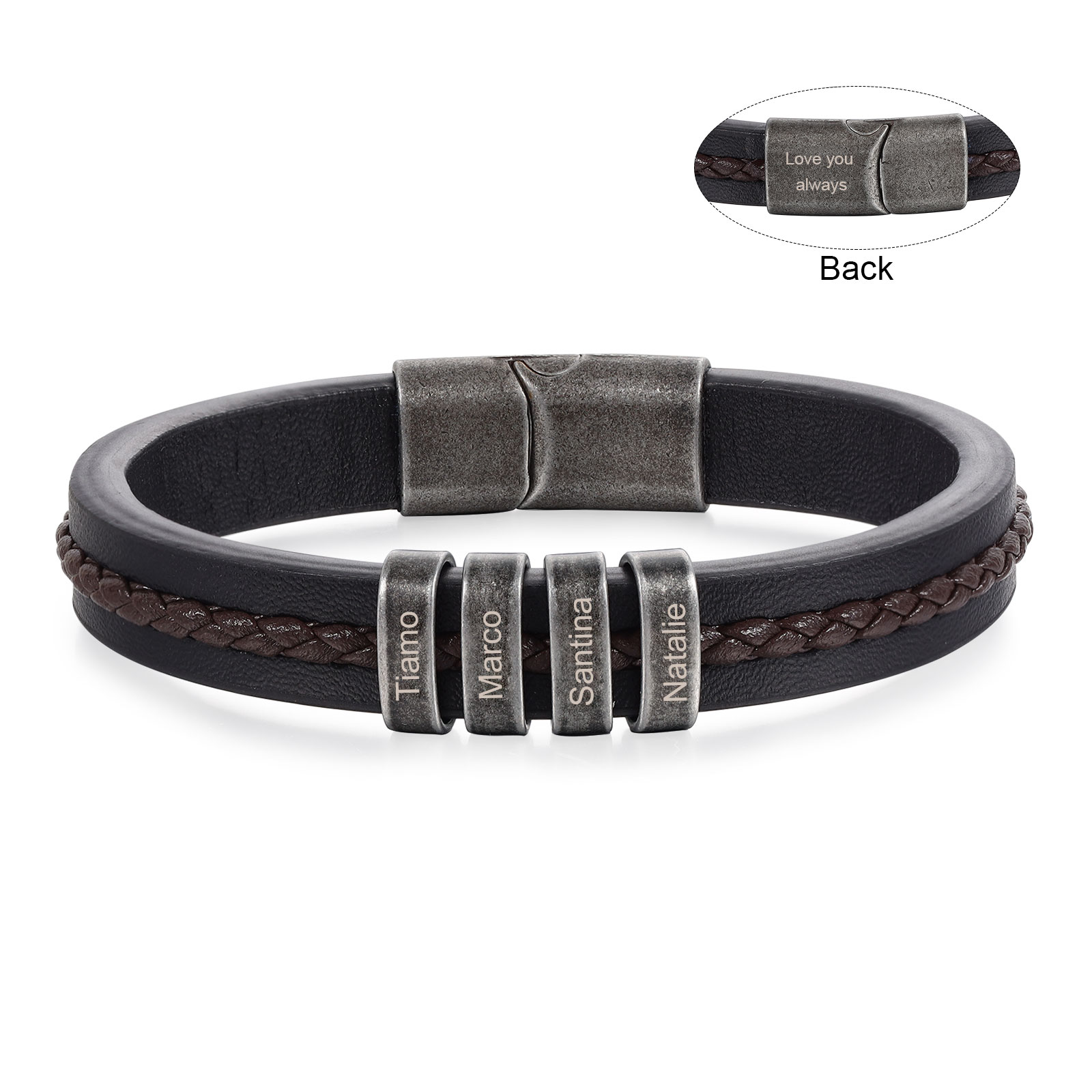 Pulsera de Cuero para Hombre 4 Nombres Personalizados con Texto