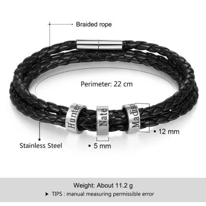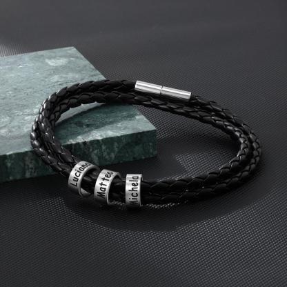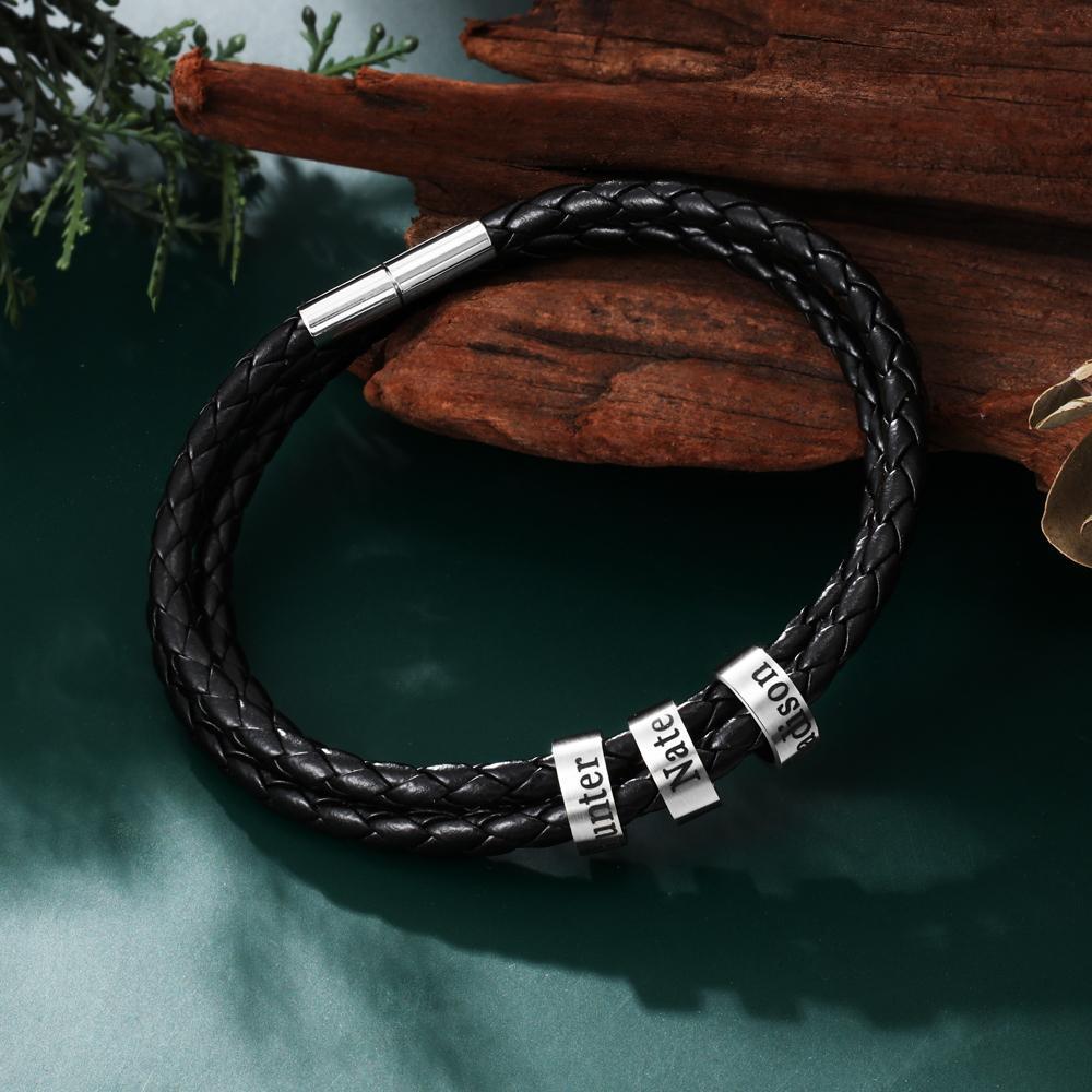 Pulsera de cuero trenzado personalizada con 3 nombres en 3 cuentas