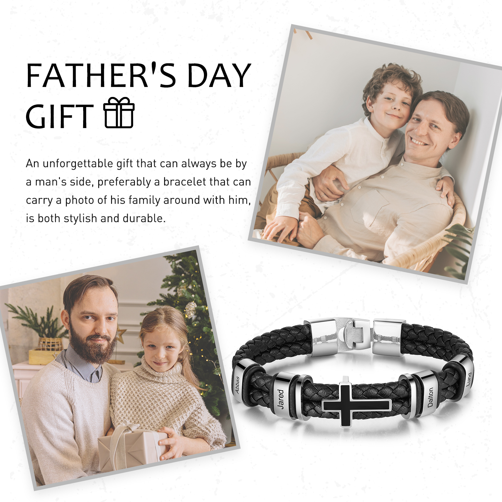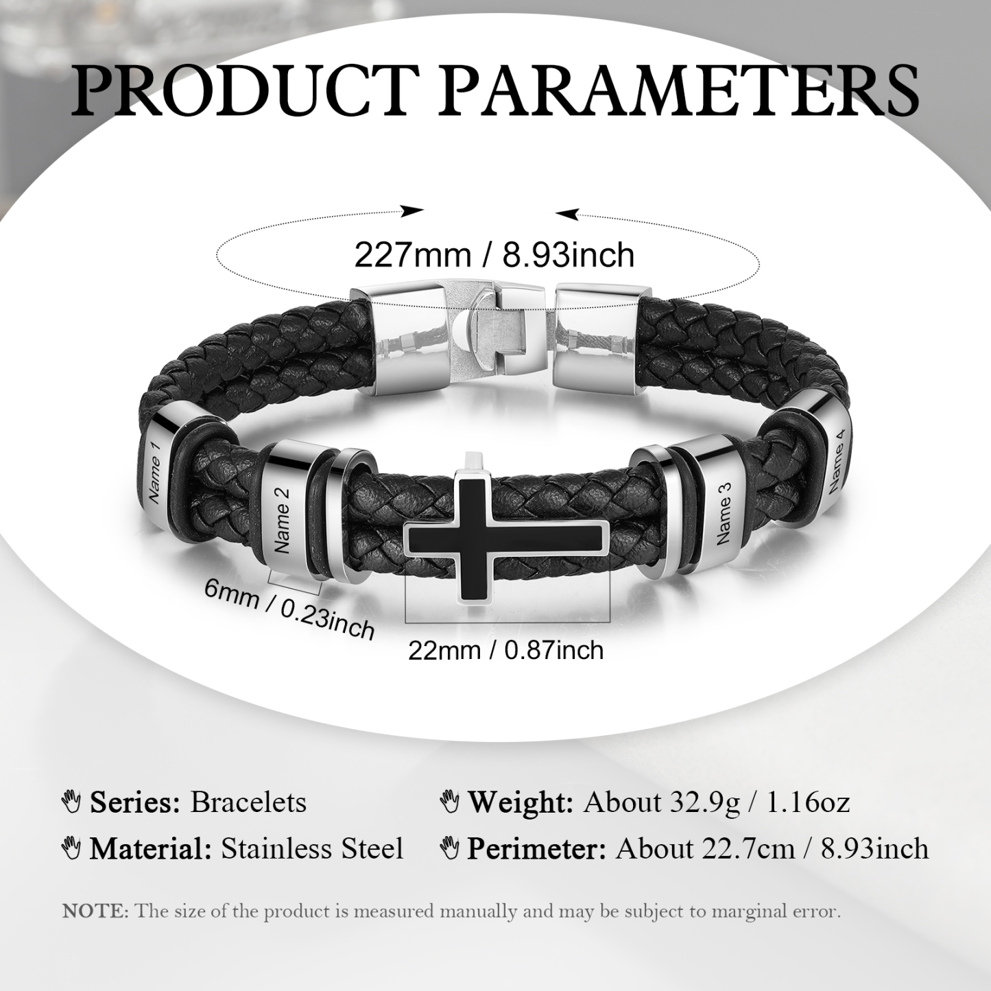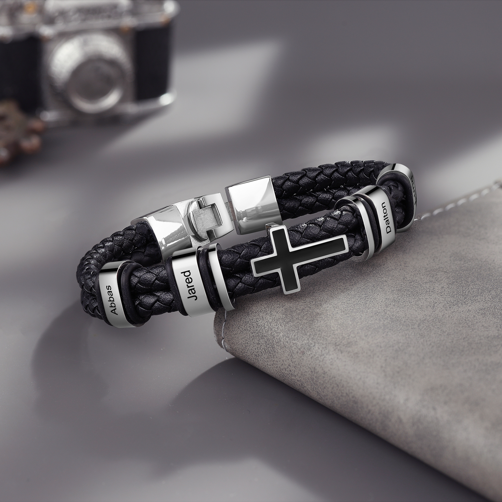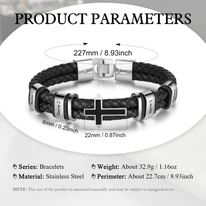 Pulsera para hombre personalizada de 4 nombres con dije de cruz